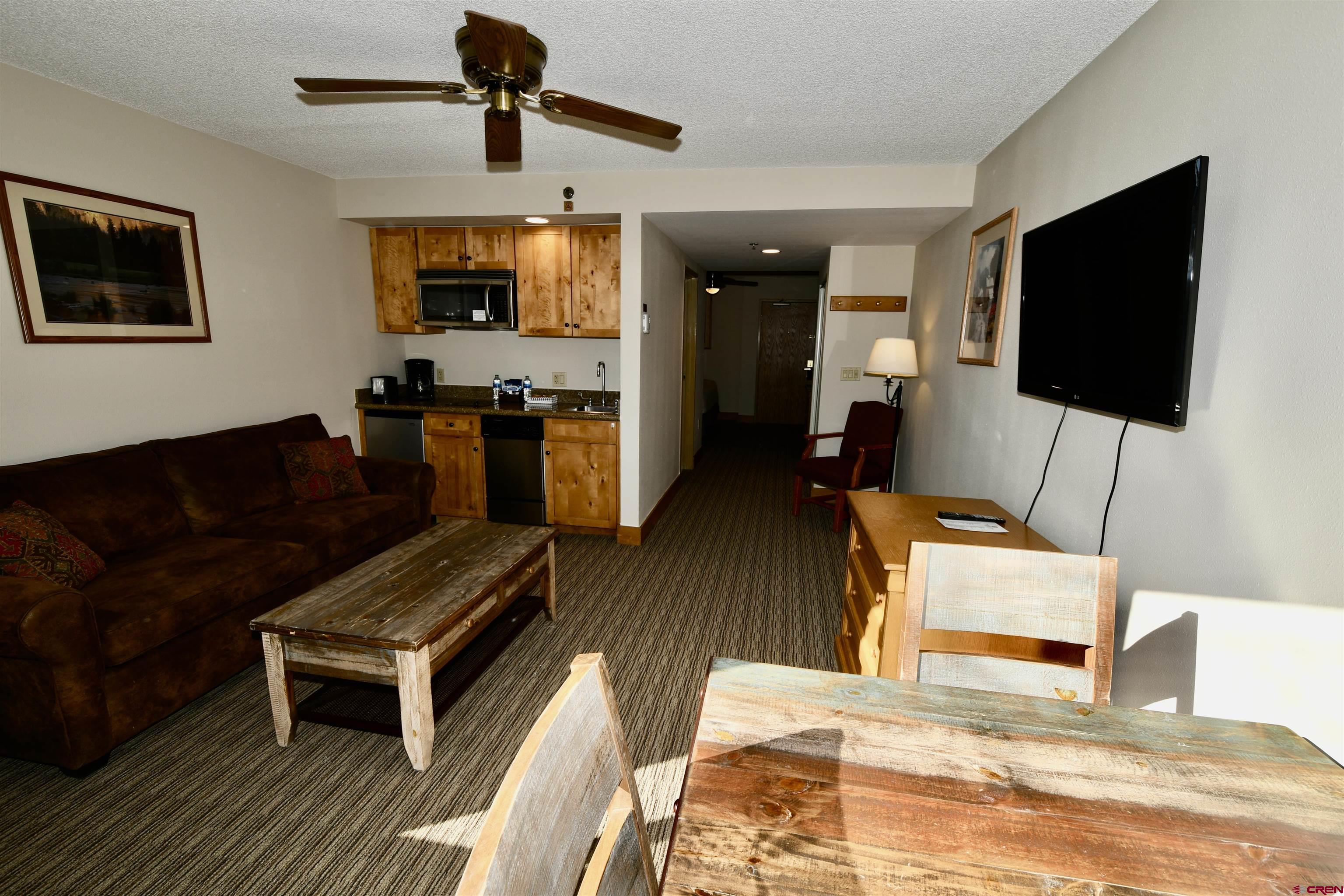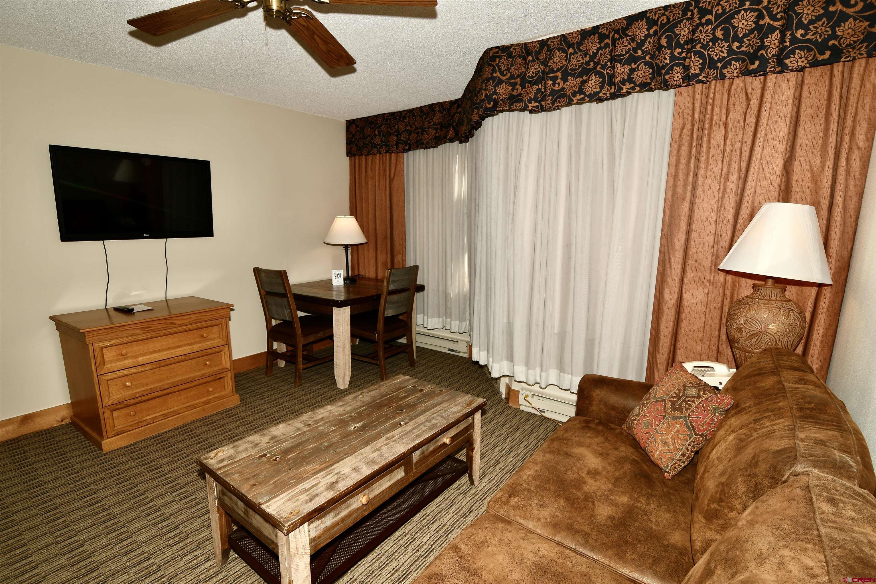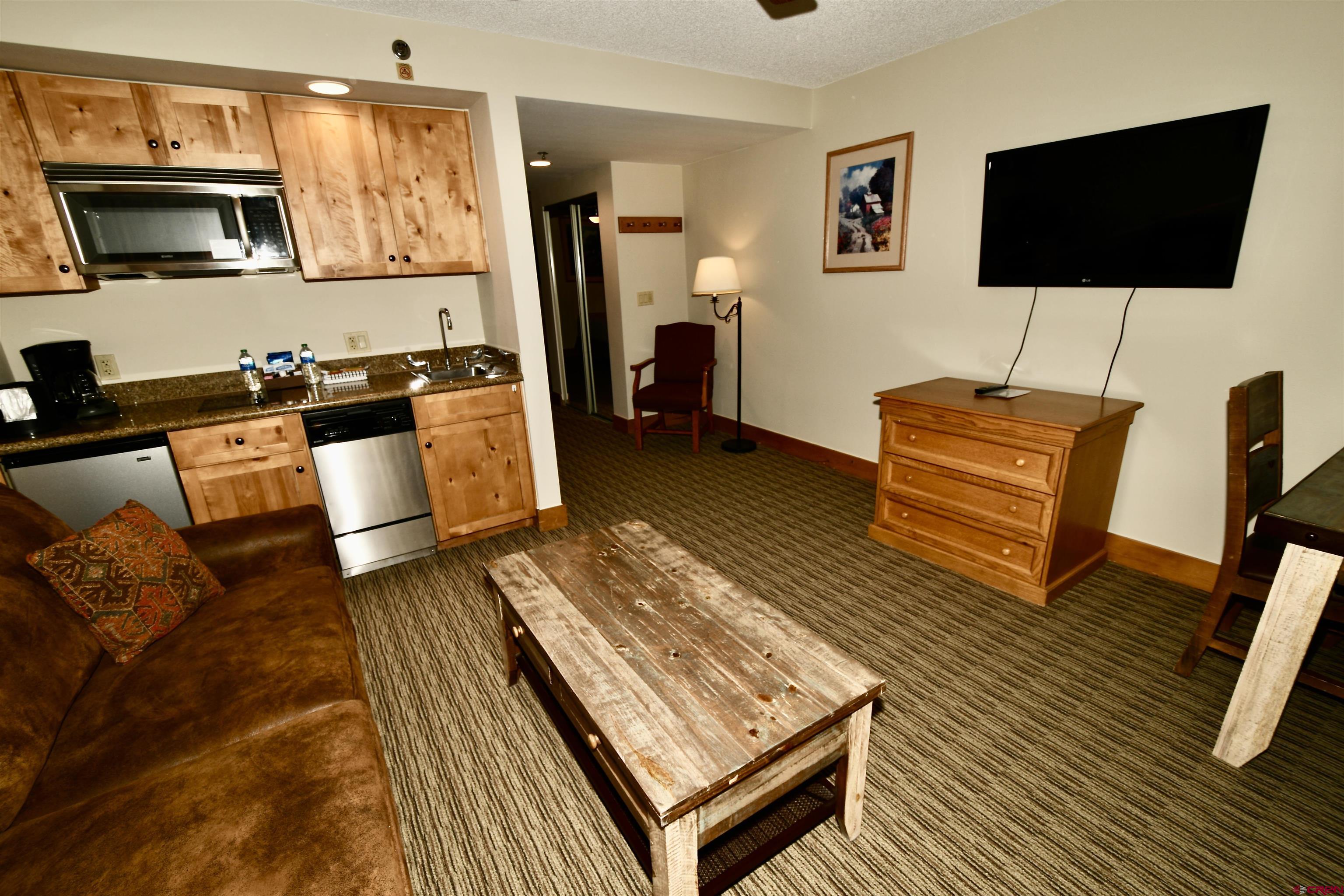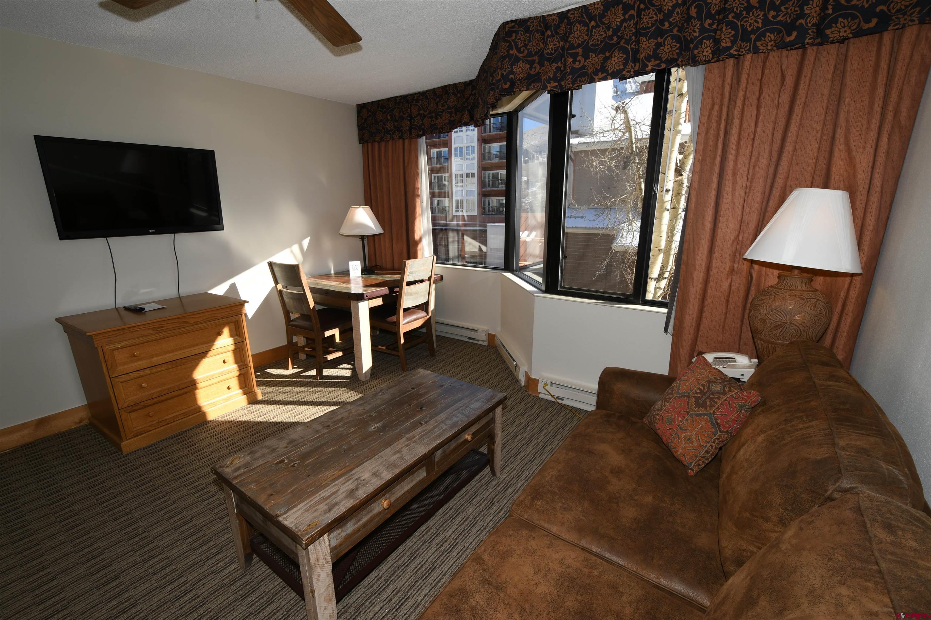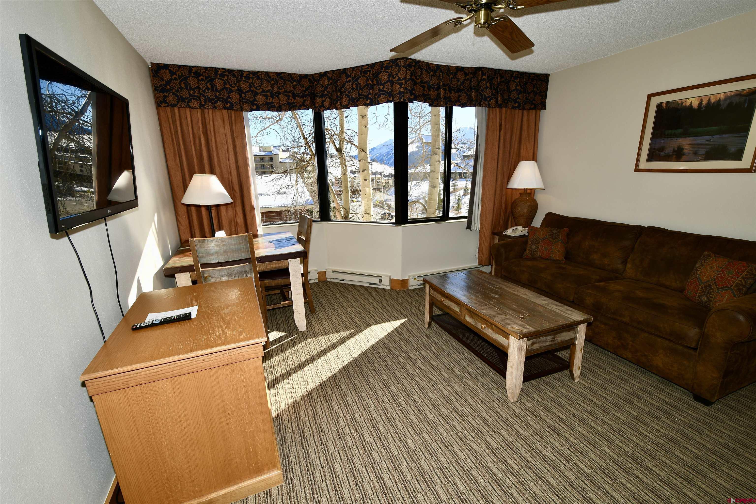 This is an excellent south facing location that is nestled behind large aspen trees in the summer and opens up the views in the winter to highlight Whetstone Mountain. Renovation of the interior carpet, window treatments and paint just completed and special assessment paid. King size bed and a sleeping sofa in the living area. Convenient kitchenette allows for meals in the room. Excellent rental property as well as extensive owner use is allowed. Hotel amenities include: swimming pool, hot tub, work out room, spa, on site restaurant, elevators, front desk and meeting rooms. Excellent location close to the ski slopes, base area shops and next to the free shuttle service to the Town of Crested Butte. Rented by Vail and now has a 60/40 split with 60% going to owner and all cleaning fees, marketing, booking and monthly statements provided by Vail.