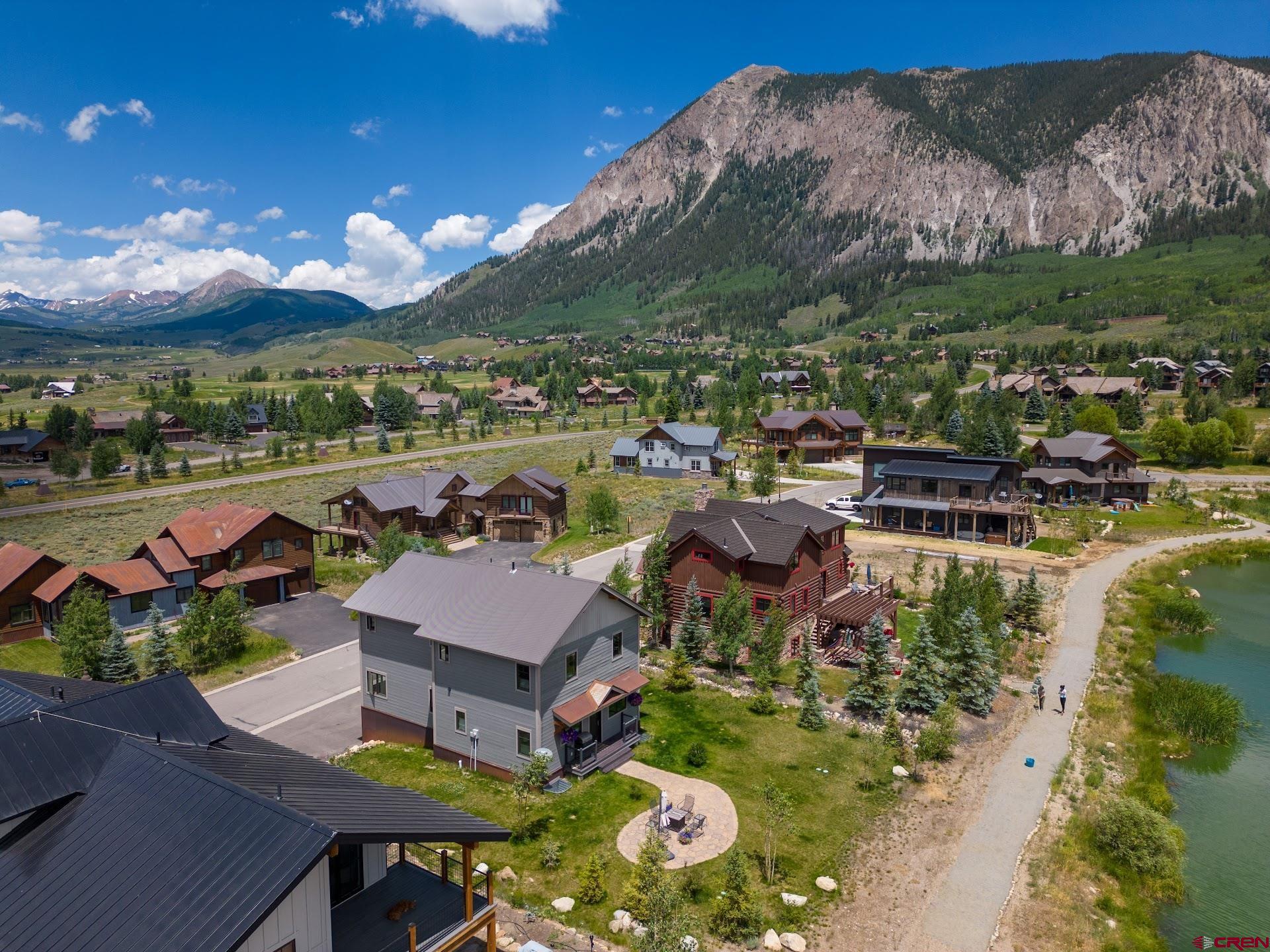 Beautiful craftsmanship in this 3 bdr/3 bth built 2,504 sq. ft. custom home with office that is located on the communal pond in the Larkspur subdivision. This home built in 2017 has the mountain modern feel with an open floor plan and gourmet kitchen. Situated on a beautiful lot that is right on the shores of the lake and a short walk to the tennis courts and small park. Larkspur is located 2.5 miles form downtown Crested Butte, minutes from both winter/summer trailheads and across the street from The Club at Crested Butte. This home features an amazing oversized custom kitchen with a large island that has a beautiful quartz countertop, stainless steel appliances, and a farm style sink with window that frames the lake, which makes even doing dishes a joy. Open living and dinning areas that offer spectacular mountain views up the valley. Small deck off the kitchen and stone patio with mature landscape make this the ideal spot for morning coffee or entertaining. The master bedroom is spacious and has two walk-in closets and attached bathroom boasts a soaking tub, dual vanities, and frameless glass shower. The two other bedrooms have an adjoining bath with soaking tub, dual vanities and private toilet. This home features a four car heated garage that is over 1050 sqft, for cars, storage, all your sporting gear or could be turned into living space with egress windows and plumbing already stubbed in. Site Features: Located in Larkspur, a quiet bedroom community less than 2 miles from Crested Butte. Across the street from the Crested Butte Country Club and accessed from Brush Creek Road, this lot is only 5 minutes away from the Gunnison National Forest and its hundreds of thousands of acres of bicycling, fishing, hunting, wildflower viewing and other great past times. The neighborhood has speed dips that keep the traffic and speed to a minimum, making it safe for the kids to ride their bikes, access the ponds for fishing and swimming and playing at any of the basketball hoops located in each cul-de-sac. Similar homes in the subdivision that are rentals generate between $60,000-$85,000 in Gross revenue a year.