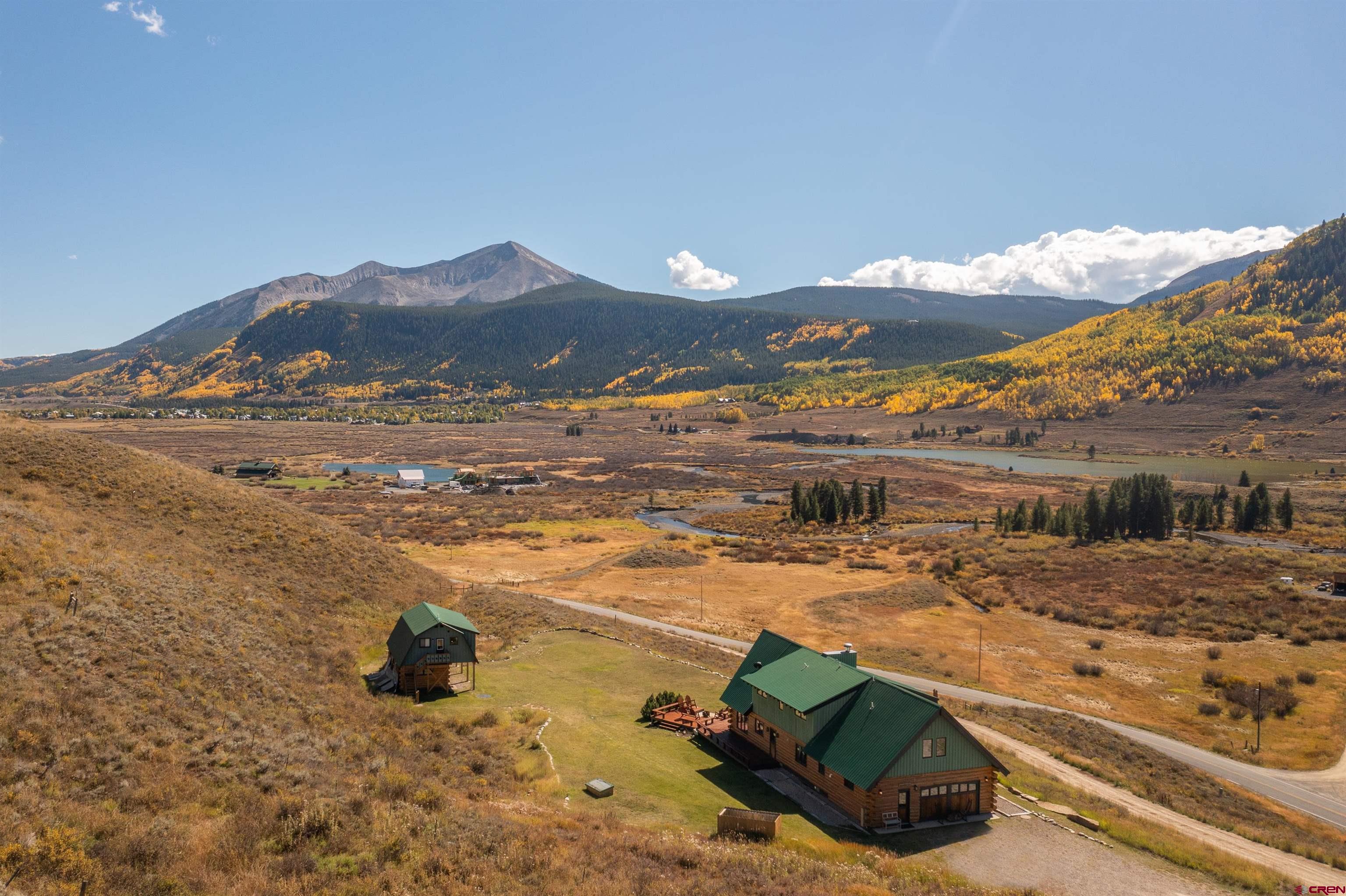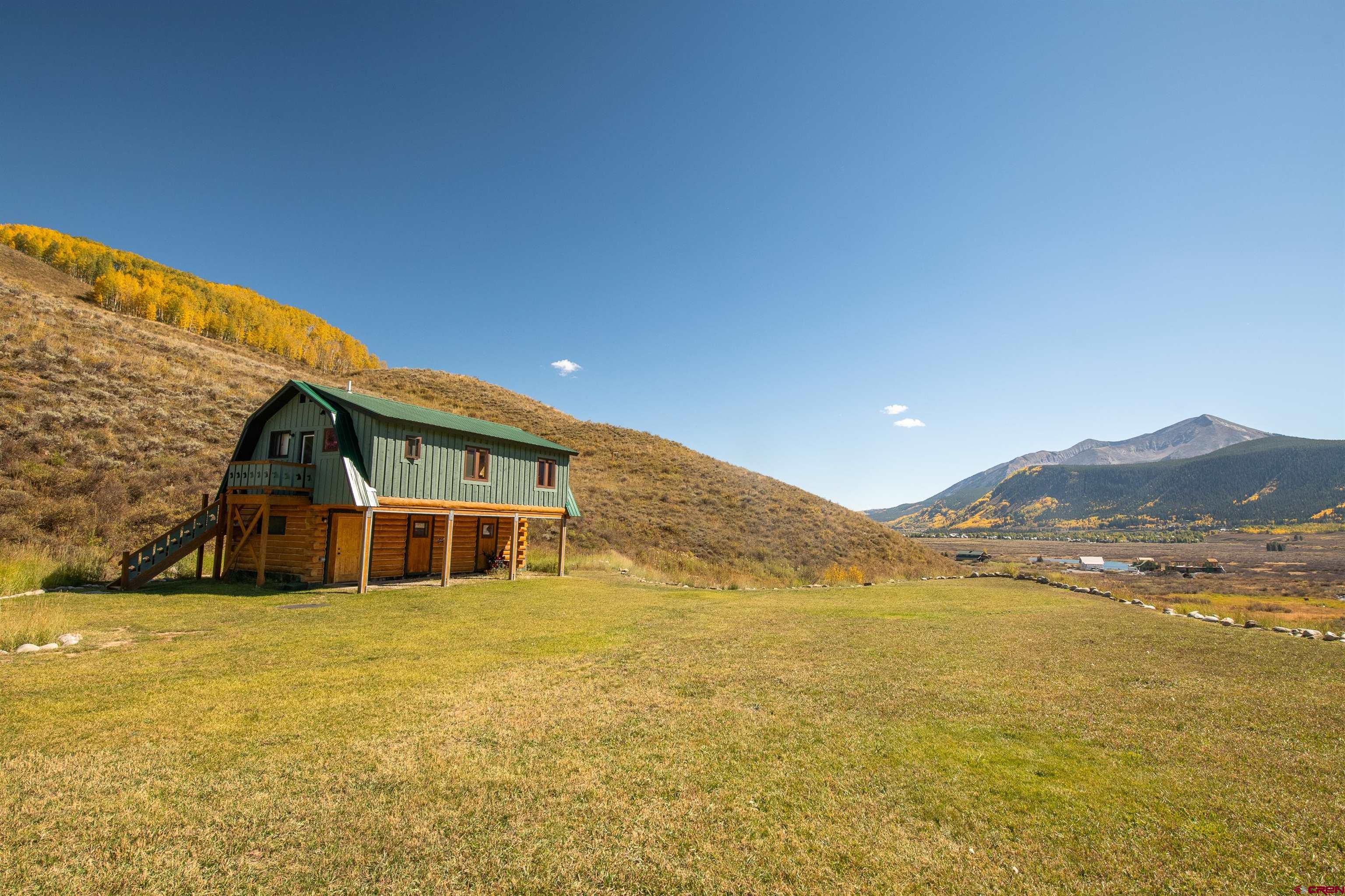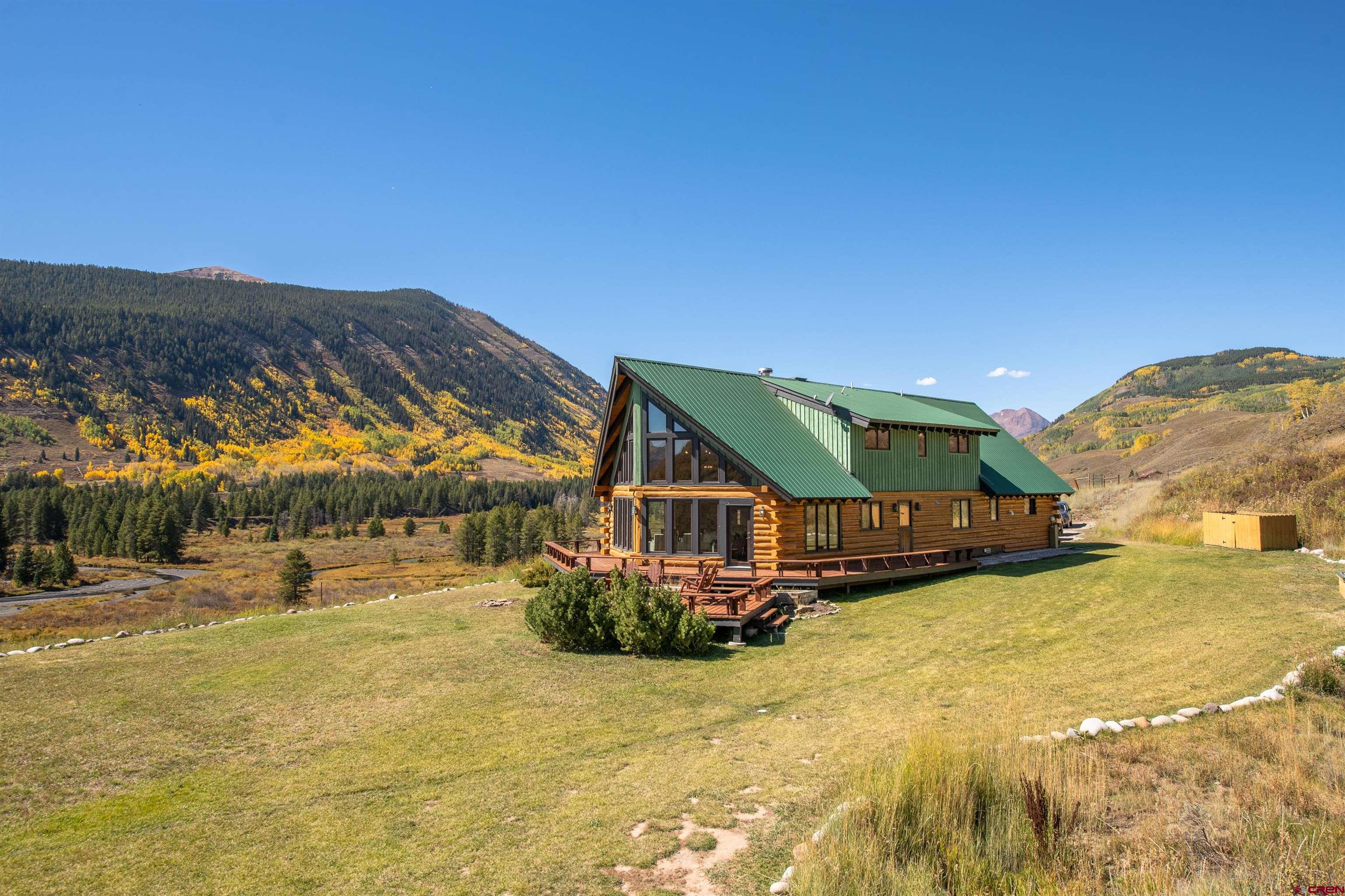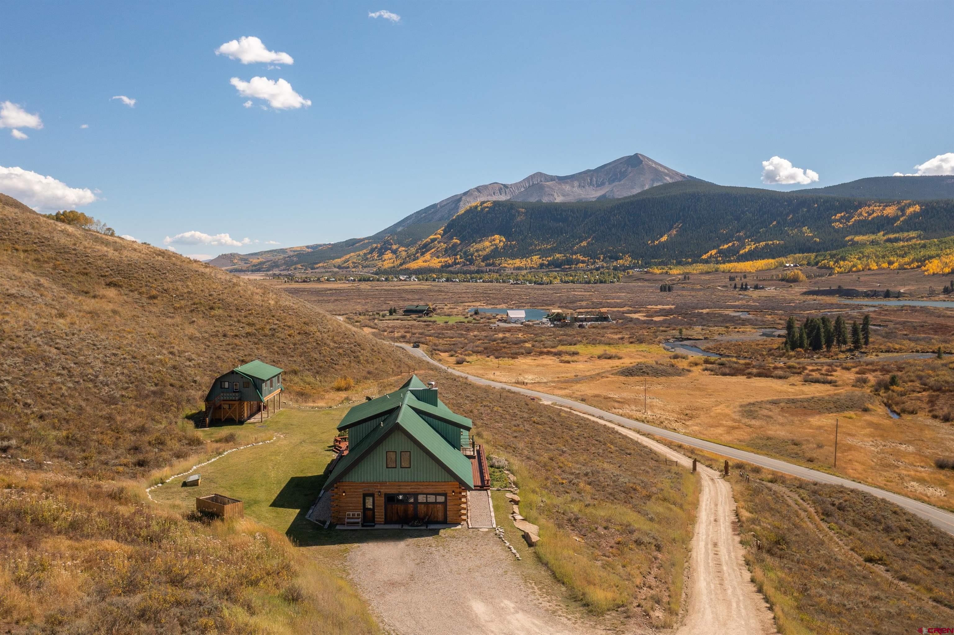 NEW PRICE OPPORTUNITY! ADJUSTED TO $2,495,000!! 1250 Slate River Road provides a rare opportunity to own an authentic mountain log home on spacious acreage in a convenient location. This property is just 5 minutes to downtown Crested Butte and only 5 minutes to skiing and riding at Crested Butte Mountain Resort. The Slate River Valley area offers year-round outdoor recreation including multiple trails for hiking, mountain biking, cross-country skiing, and snowmobiling, as well as close proximity to the Oh-Be-Joyful Recreation Area and Raggeds Wilderness. The main residence and guest residence sit on 10.35 acres in a private hillside setting with stunning views of the surrounding peaks and the Slate River Valley. Enjoy southern exposure and an open, sunny setting. The 3,111 SF home is light and airy thanks to dramatic windows and a vaulted ceiling. The property (including the un-restricted Guest House) features 5 bedrooms including a large master suite, 4 full baths, a game room, and a wood burning fireplace in an open living area. The kitchen has granite countertops and new appliances. This property is ideal for a family who desires a multi-generational, turn-key vacation home that is fully furnished, tastefully decorated, and can sleep up to 12 people. The 608 SF Guest House is a comfortable and private area for additional rental income or an office/den and/or additional sleeping area. It is located above a clean and organized storage area, which could also be utilized to stable horses. There are trails on the property for horseback riding or hiking, with easy access to popular mountain bike rides including the Lupine and Gunsight trails. The generous outdoor space includes a level grassy yard, large deck, and a fire pit all overlooking the meandering Slate River below.