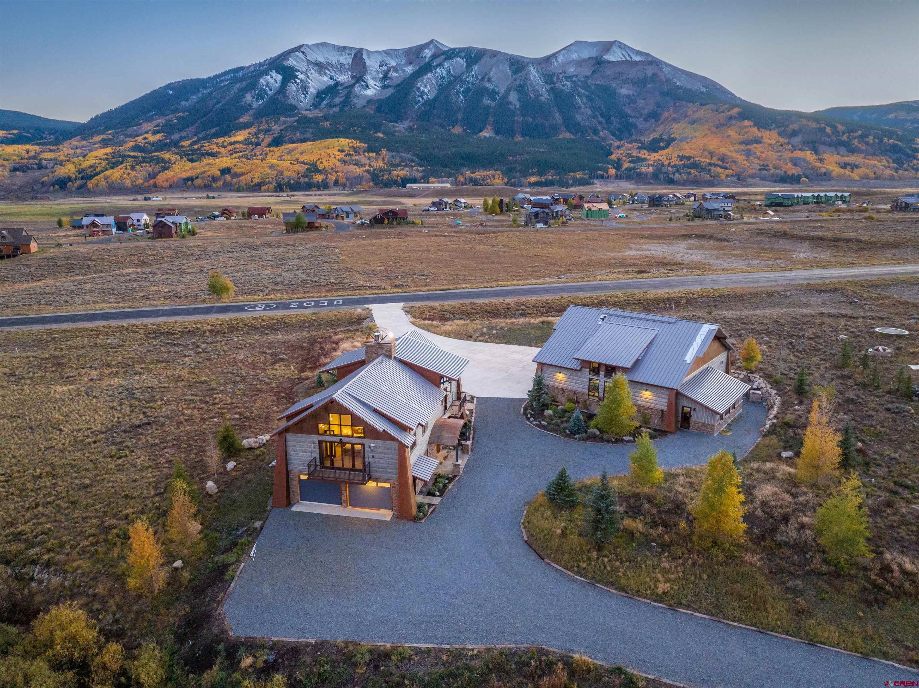Introducing the first offering of its kind in Crested Butte, Colorado! Located “beachfront” at the Crested Butte Airpark (0CO2), arguably the most beautiful airpark in the country, this 1.69 acre runway lot features a high-mountain luxury home and hangar, with 8,132 SF under roof, that has been custom-crafted with the finest attention to detail beginning with the pouring of the foundation through to the finishing touches on the extensive landscaping. A steel post and beam structure wrapped in structurally insulated panels and covered with Everlog concrete siding, stone and steel, insures low maintenance while offering the classic big timber, rustic mountain feel so desired. The owner/contractor designed and situated the residence to showcase and preserve the finest and most expansive views from each room and include the iconic peaks that surround Crested Butte. The open-concept second floor Great Room, gourmet kitchen and dining area are the focal point of this home. Featuring soaring ceilings, generous windows, 5 foot wide masonry fireplace, wet bar, covered cantilevered decks with magical views & wide plank oak flooring the “Wow Factor” never fades. The primary suite is buffered from the living area by a spacious office and separate family room. Enjoy privacy and amazing views while experiencing with your very own balcony, fireplace, personal laundry, spacious walk-in closet with extensive built-in cabinetry and luxurious bathroom, appointed with steam shower, rain shower head, double-end soaker tub and dual vanities with concrete countertops. Two guest bedroom suites on the entry level have been fully appointed with their own private bath, gas fireplace, built in wardrobes and have their own separate exit to the stone patio. Other amenities include: water filtration & softener, in-floor radiant heat, wired sound, security system, structured cat 5 ethernet & cable and 995 SF heated garage. A large residential elevator in addition to the comfortable staircase will facilitate easy access between floors. The 3,233 square foot airplane hangar, of similar construction, has its own pilot’s office/quarters, complete with fireplace and private bath. While built to accommodate up to 3 aircraft, this versatility of this space is endless. Ideal for classic car enthusiast, workshop, screening room and much more. The hangar has a Schweiss Hangar door with a 55’ wide and 15’ tall door opening. The runway is accessible via the 9,500 square foot concrete aircraft ramp. Surrounding the home you’ll enjoy extensive landscaping that includes a massive flagstone patio with gas fire pit and luxury hot tub that take in the best views the valley has to offer. Flower beds, maturing aspen, cottonwood and pine trees that assimilate with the natural environment and are maintained with an in-ground sprinkler system, are the finishing touches on this one-of-a-kind home. This “Legacy Property” is ready for you to make it your home, where you’ll make memories for years to come. The Buckhorn Ranch Subdivision, partially bordering National Forest, has easy access out Brush Creek Road, where you can enjoy miles of trails for both summer and winter activities.