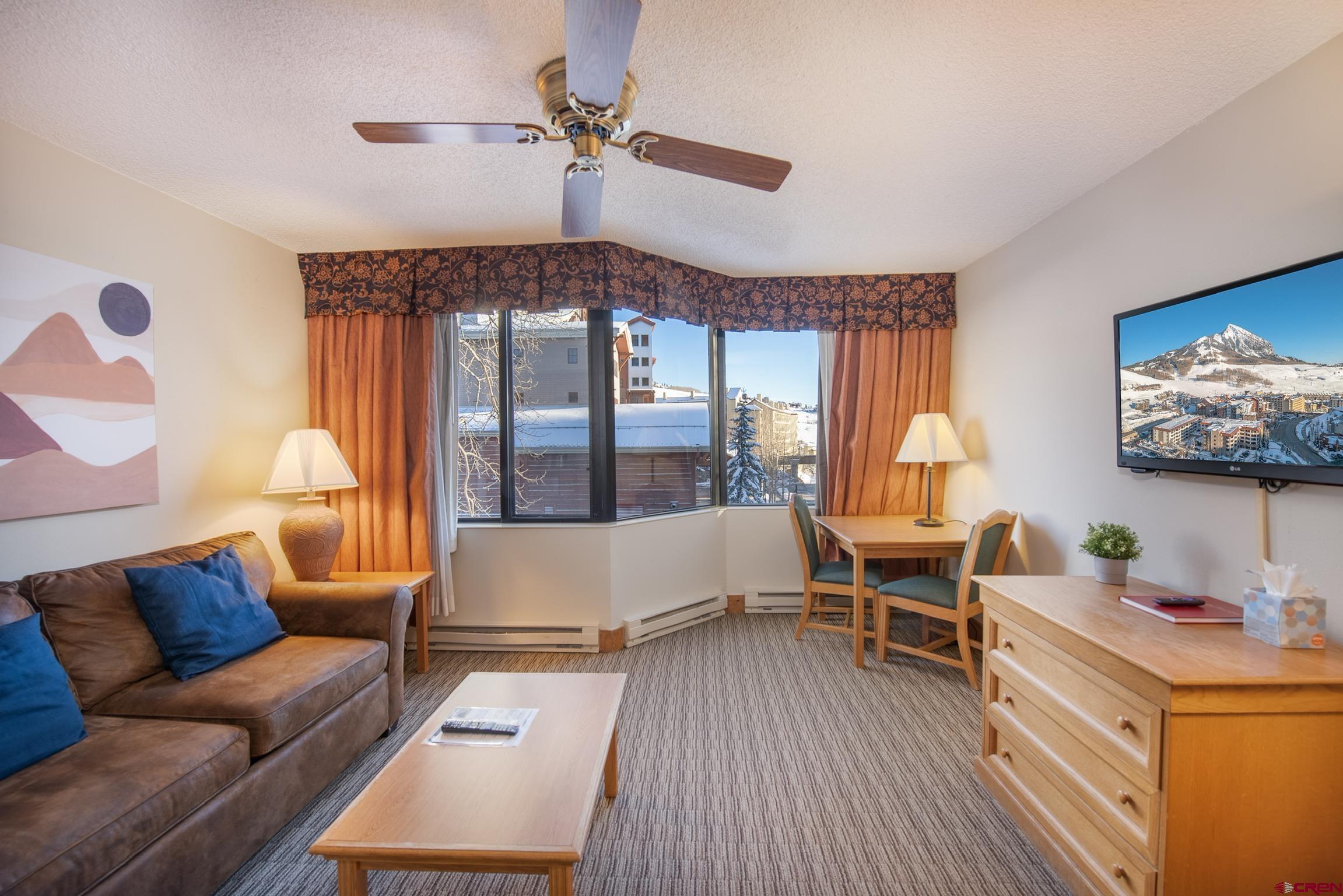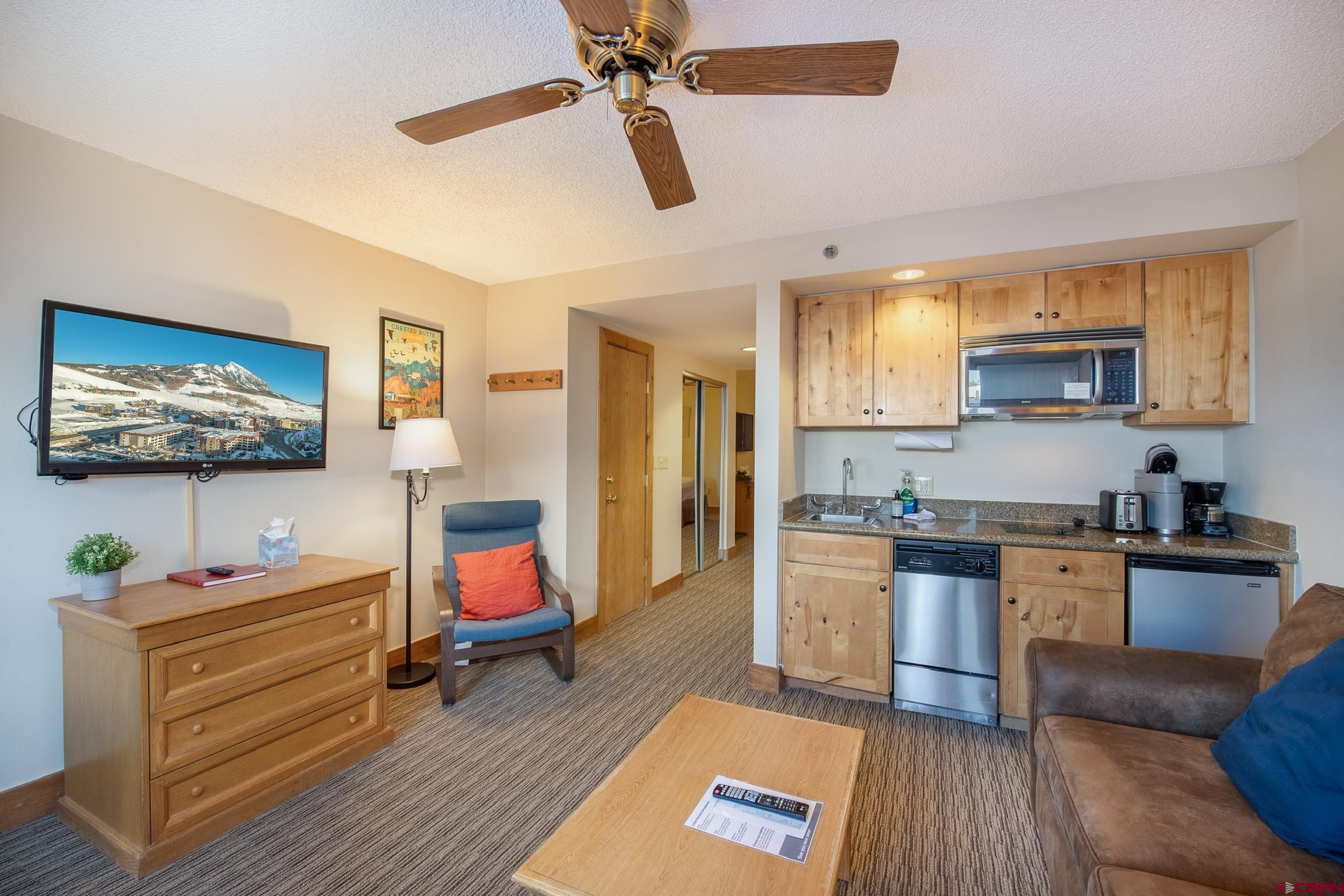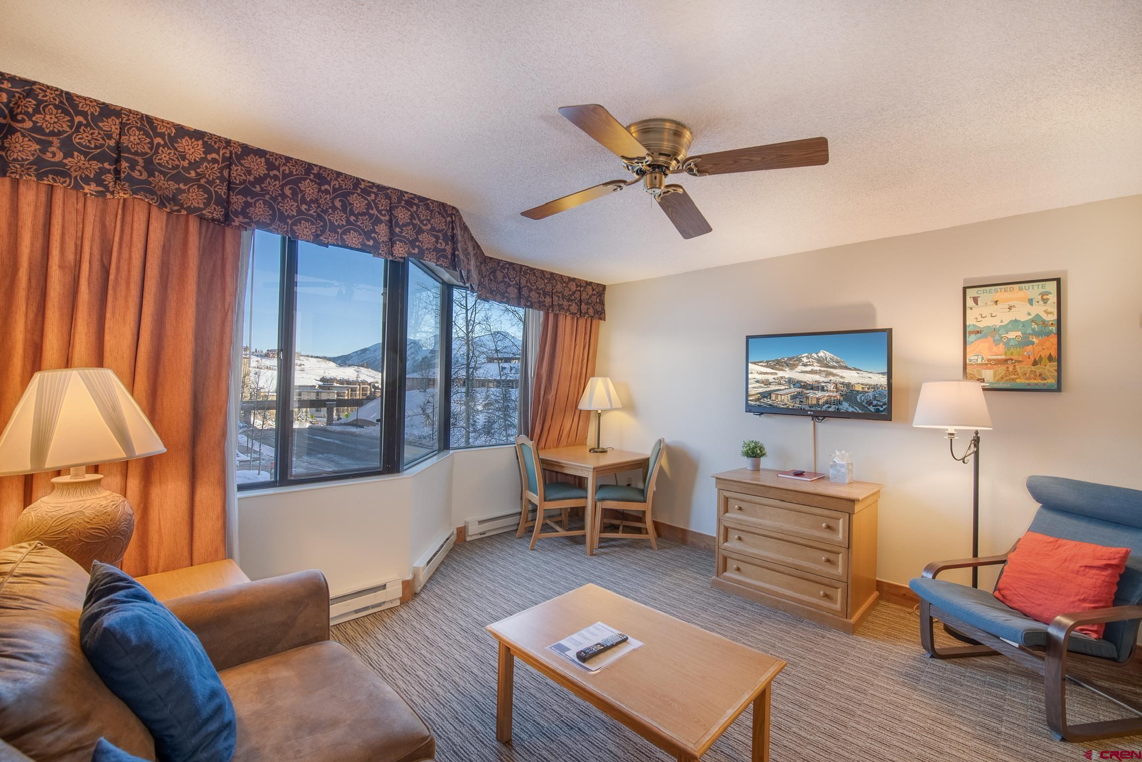 This is an excellent south facing location that highlights Whetstone Mountain views. Renovation of the interior carpet, window treatments and paint just completed. King size bed and a sleeping sofa in the living area. Convenient kitchenette allows for meals in the room. Excellent rental property as well as extensive owner use is allowed. Hotel amenities include: swimming pool, hot tub, work out room, spa, on site restaurant, elevators, front desk and meeting rooms. Excellent location close to the ski slopes, base area shops and next to the free shuttle service to the Town of Crested Butte. Seller rents on VRBO and Air B&B using local manager for cleaning and maintenance. Total 2022 gross earnings for this unit were $41,864.