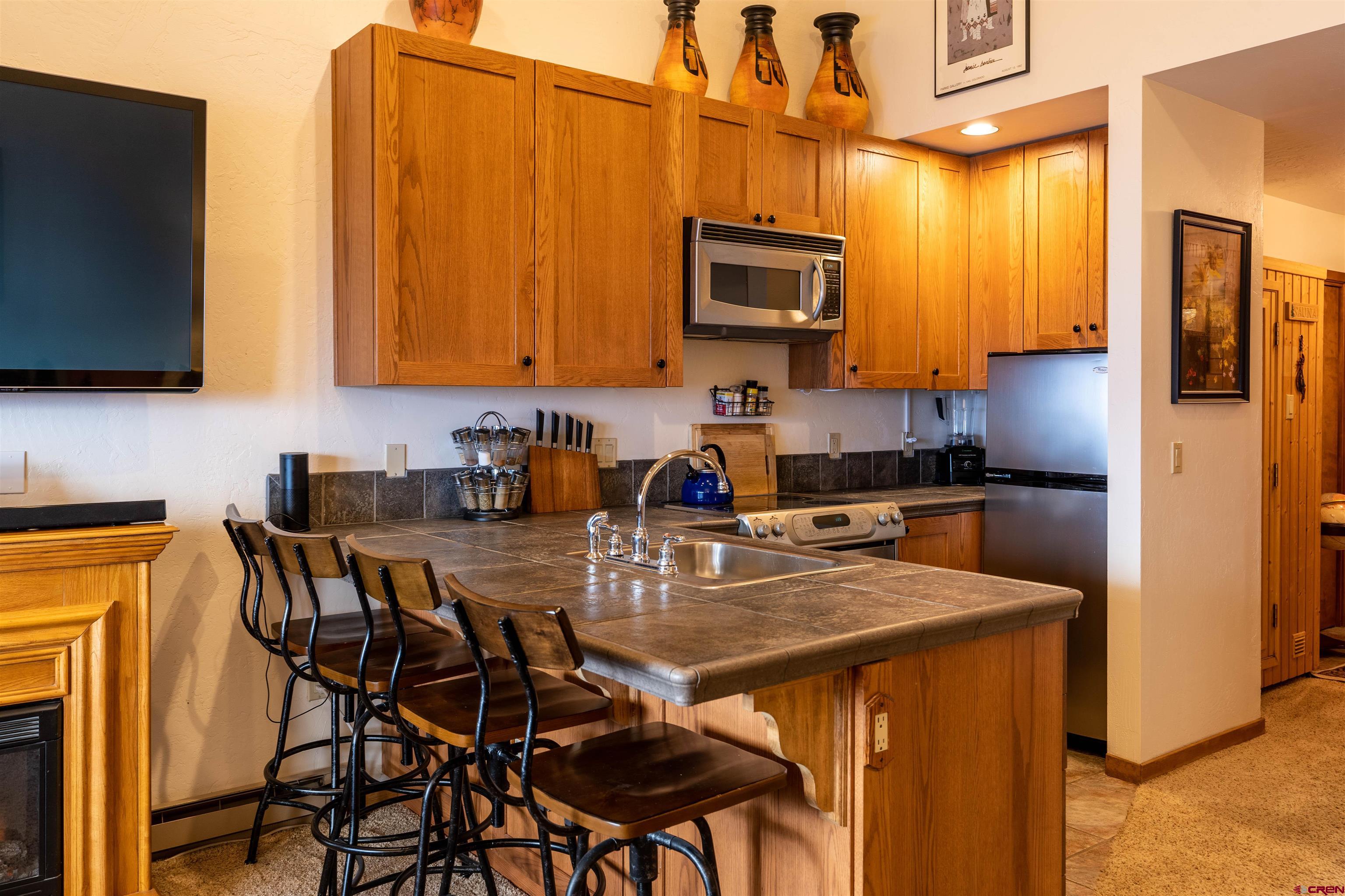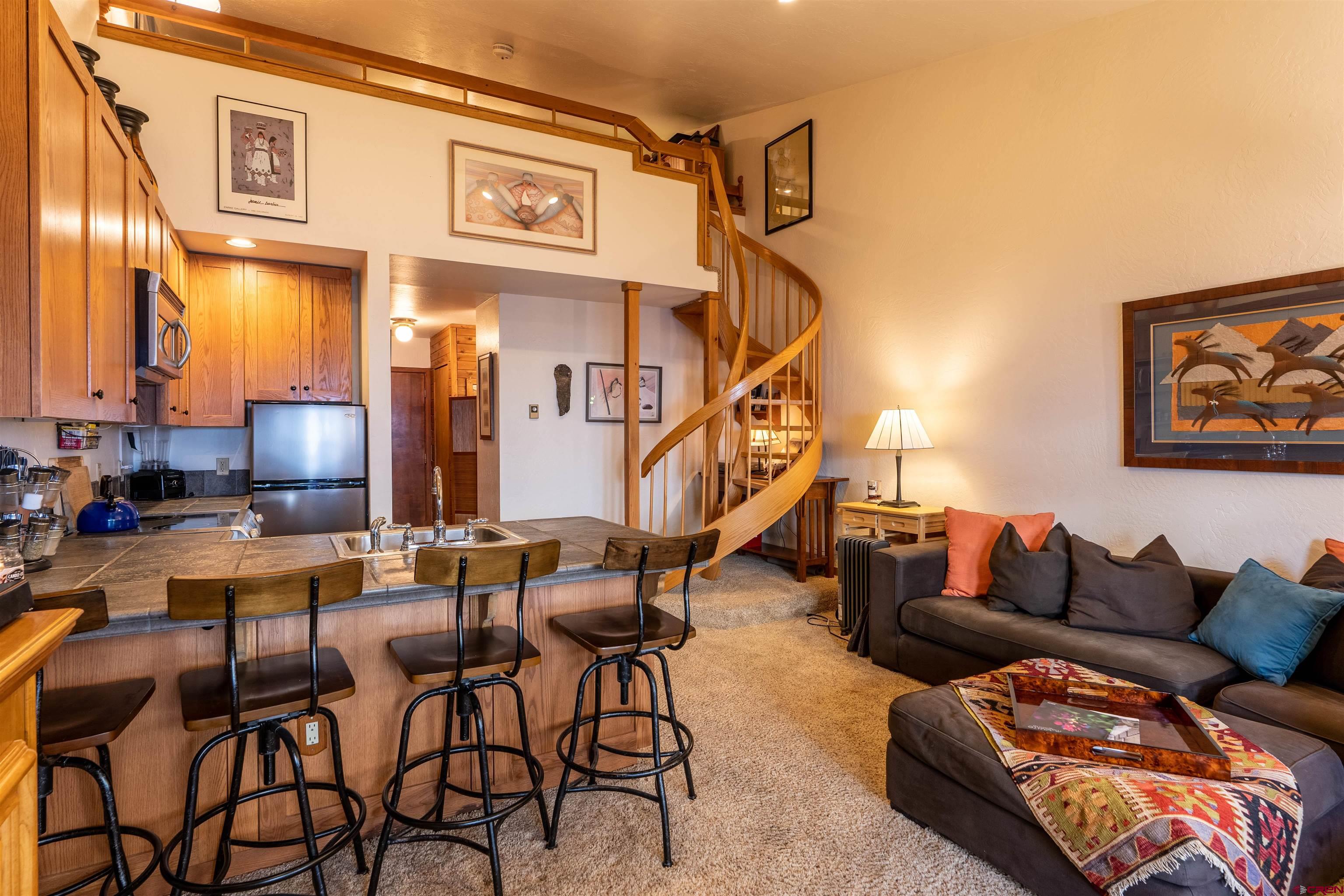 Introducing Skyland Lodge 217A, one of only a few units in the building designed to have a spacious loft with third floor egress. Step inside this turn-key condo, and soak up the natural lighting and views of Mount Crested Butte from the main living room, kitchen and large covered deck! The current owners installed a full kitchen with charcoal tile countertops, a refrigerator, a full-size dishwasher, a microwave and a stove. You will love the oak spiral staircase designed by Architect Michael Helen, a true statement piece that ascends to the bedroom area. The loft was further extended to create more space in the bedroom and below the staircase, which can be used for storage or an office nook. Highlights include a Finnleo steam sauna, vaulted ceilings, electric fireplace, large double closets, and custom built-in cabinets in the living room. This cozy condo is great for entertaining with an open, bright floor plan and is offered furnished. On-site at Skyland Lodge, you will enjoy a laundry room, ski storage room, dumbwaiter servicing all floors, and a hot tub facing Whetstone Mountain. You will also access private Lake Grant, a Skyland resident's favorite amenity, where you can SUP, canoe, fish, and use the pavilion for gatherings and parties. Some of Crested Butte's most well-known hiking and mountain biking trails connect through this area and into National Forest or the Town of Crested Butte. This move-in ready condo offers an excellent opportunity for someone to move in full-time or part-time and enjoy the privileges of multi-uses, not to mention it is the best price condo of its size in the Upper Valley.