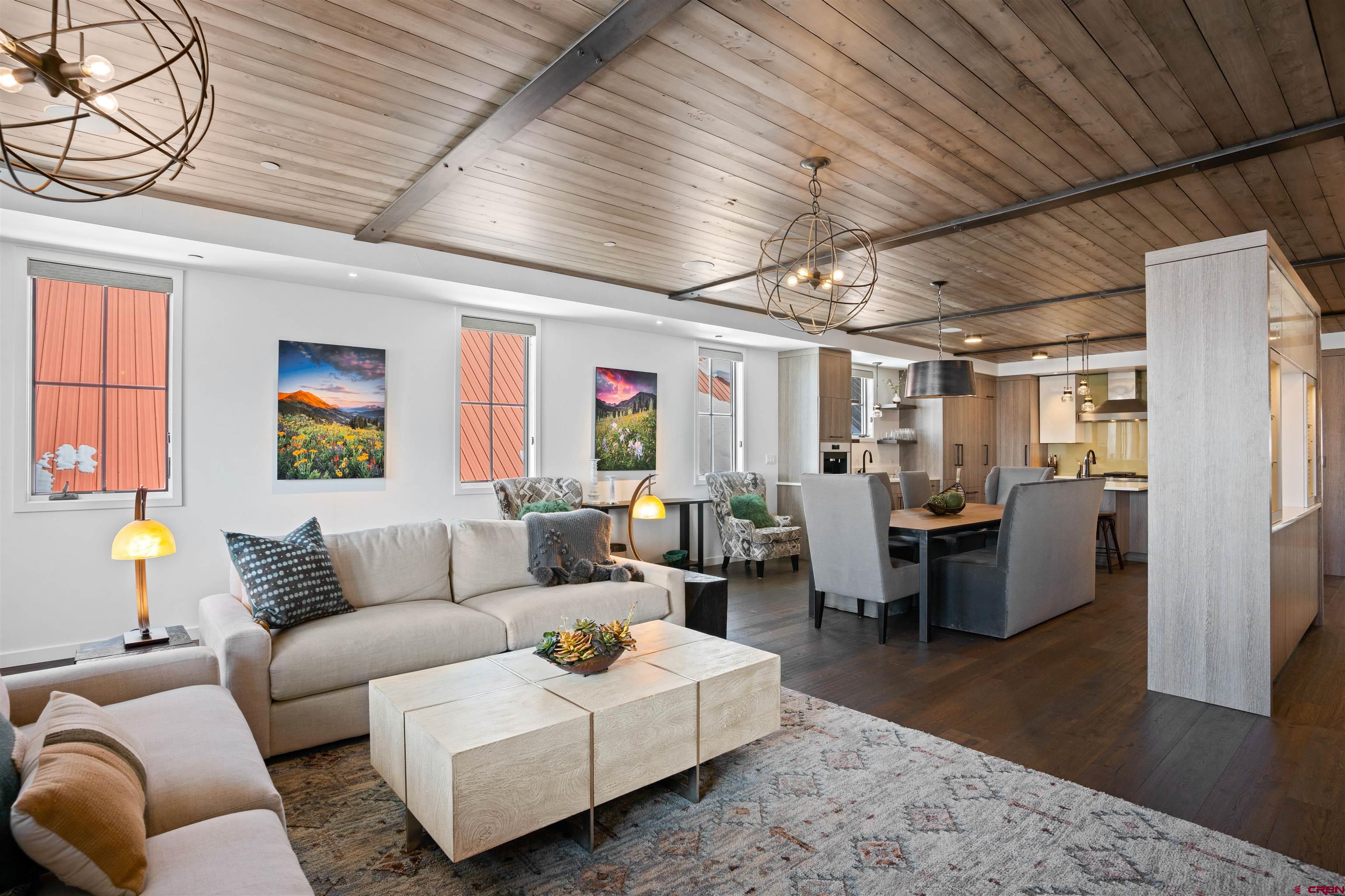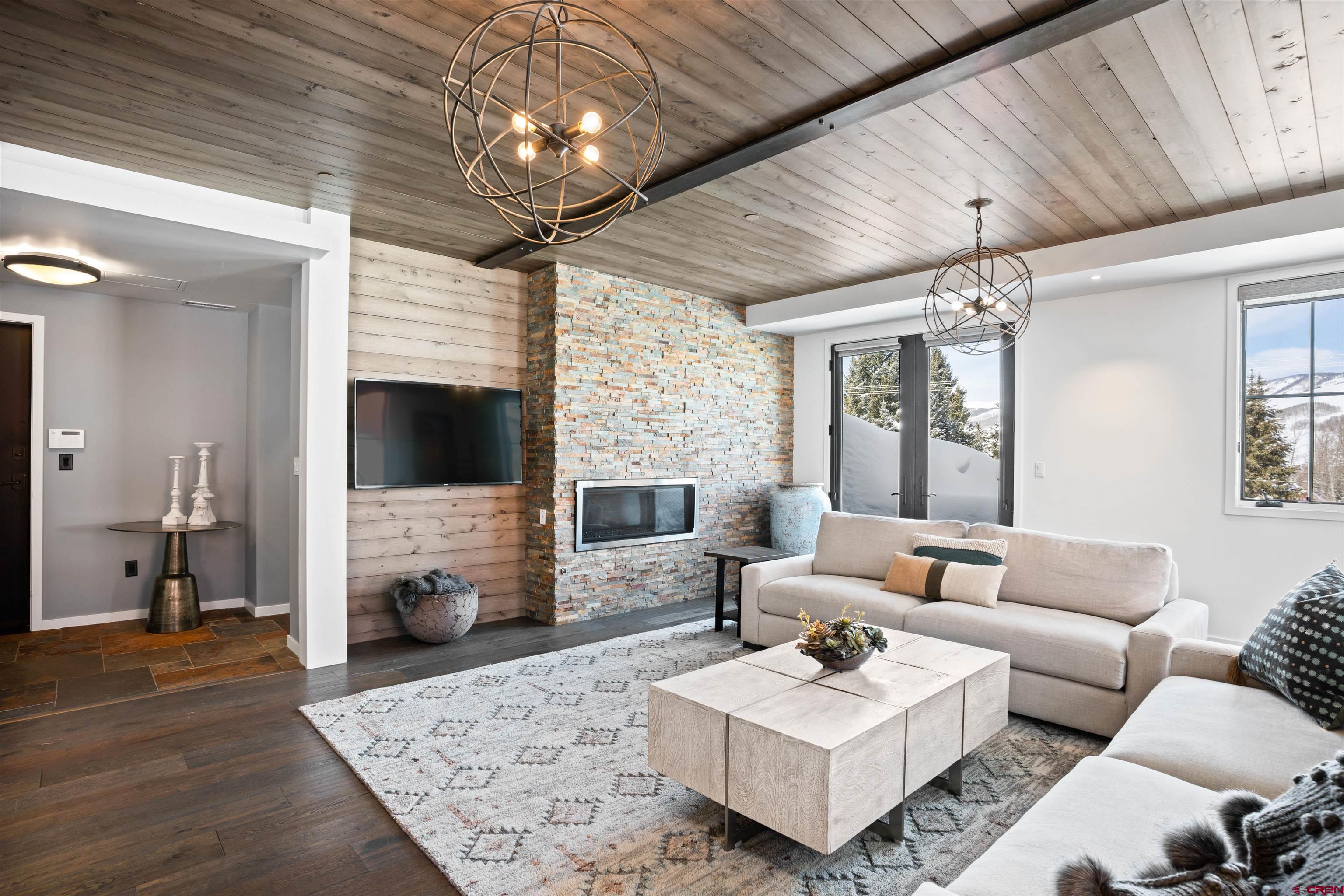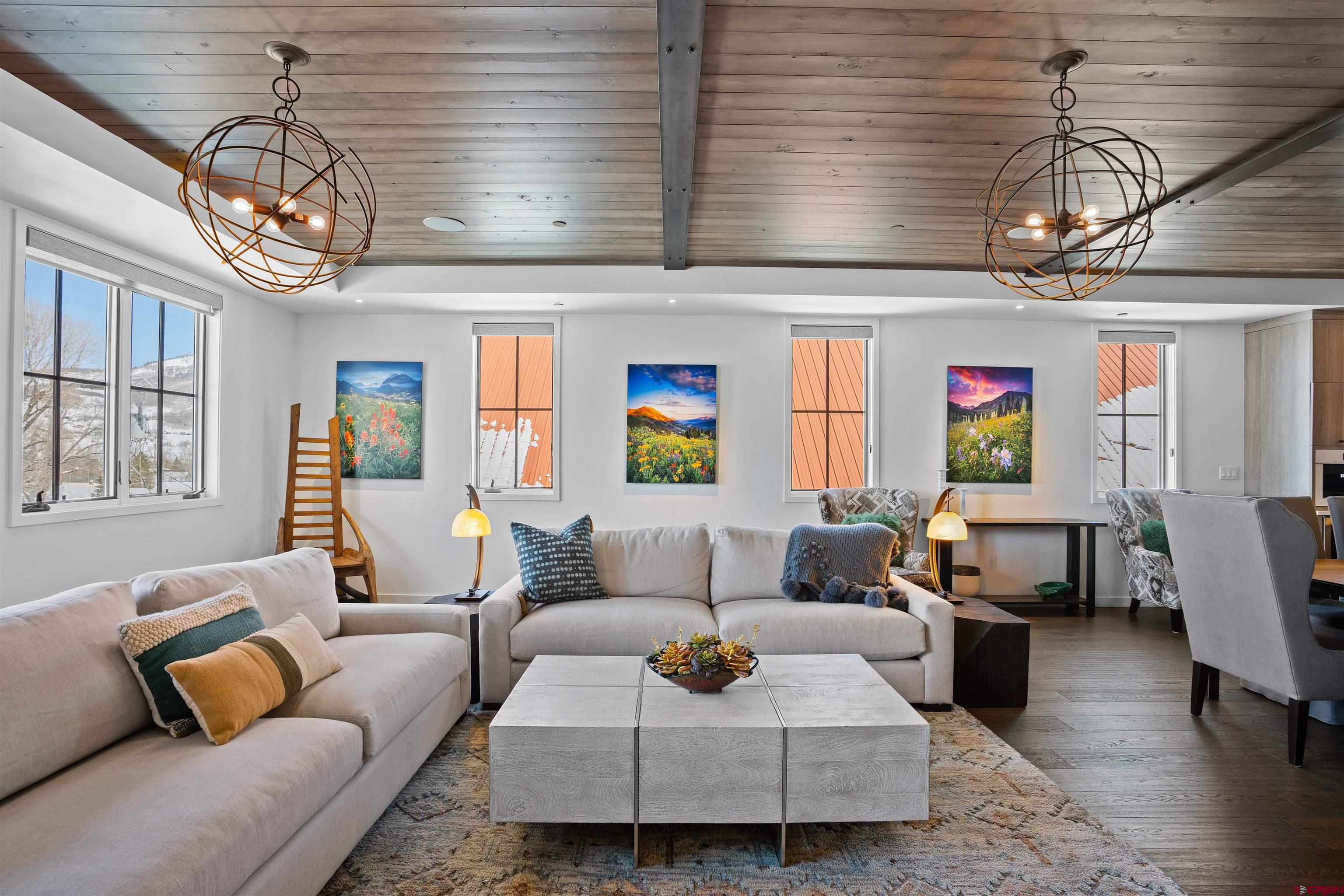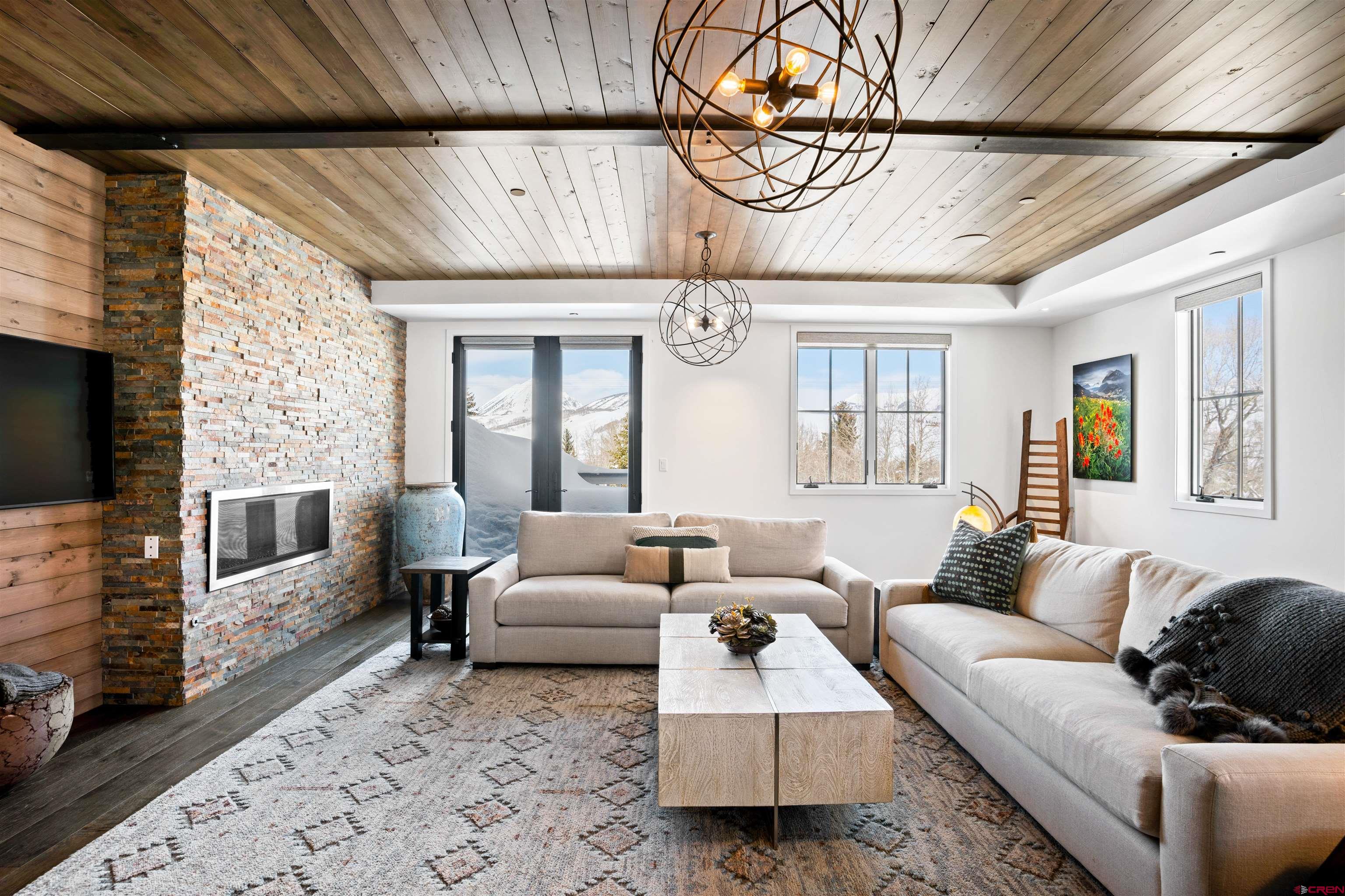 Experience the pinnacle of luxury living in this breathtaking modern mountain penthouse located in the highly sought-after Green Drake building. With over 3,400 total square feet, this magnificent residence boasts 4 spacious bedrooms, 4 lavish bathrooms, and a large private office - all impeccably designed to the highest standards. Crafted by some of the best in the business, Hargrove and Kidd Construction, the stunning interior finish work by Thurston Kitchen and Bath, and the architectural design by Andrew Hadley are a true testament to the exceptional quality of this property. The open floor plan on the top floor is perfect for entertaining and features gorgeous wood floors and ceilings, a gourmet kitchen with Dacor appliances and quartz countertops, built-in coffee bar, large center island, and a dining room with a custom-built buffet. The living room is adorned with a modern fireplace, floor-to-ceiling stacked stone accents, and ample natural light. There are also four bedrooms, two master suites with gas fireplaces and two bedrooms with a shared bath and a lovely balcony with views in every direction. Downstairs, you will find a large fully wired private office with room for a conference table and work stations and a separate bathroom-which all could be rented separately for income. There is also a second office space/storage room that could be a rental option as well. The highlight of the second floor is the 588 sf deck with incredible mountain views. Both floors of the penthouse are ADA accessible with an elevator and level floor plan with wide doors and easy to maneuver flooring. Live in the lap of luxury in the heart of downtown Crested Butte - this property is truly one of a kind and must be seen to be believed. Don't miss your chance to experience the ultimate in sophisticated mountain living.