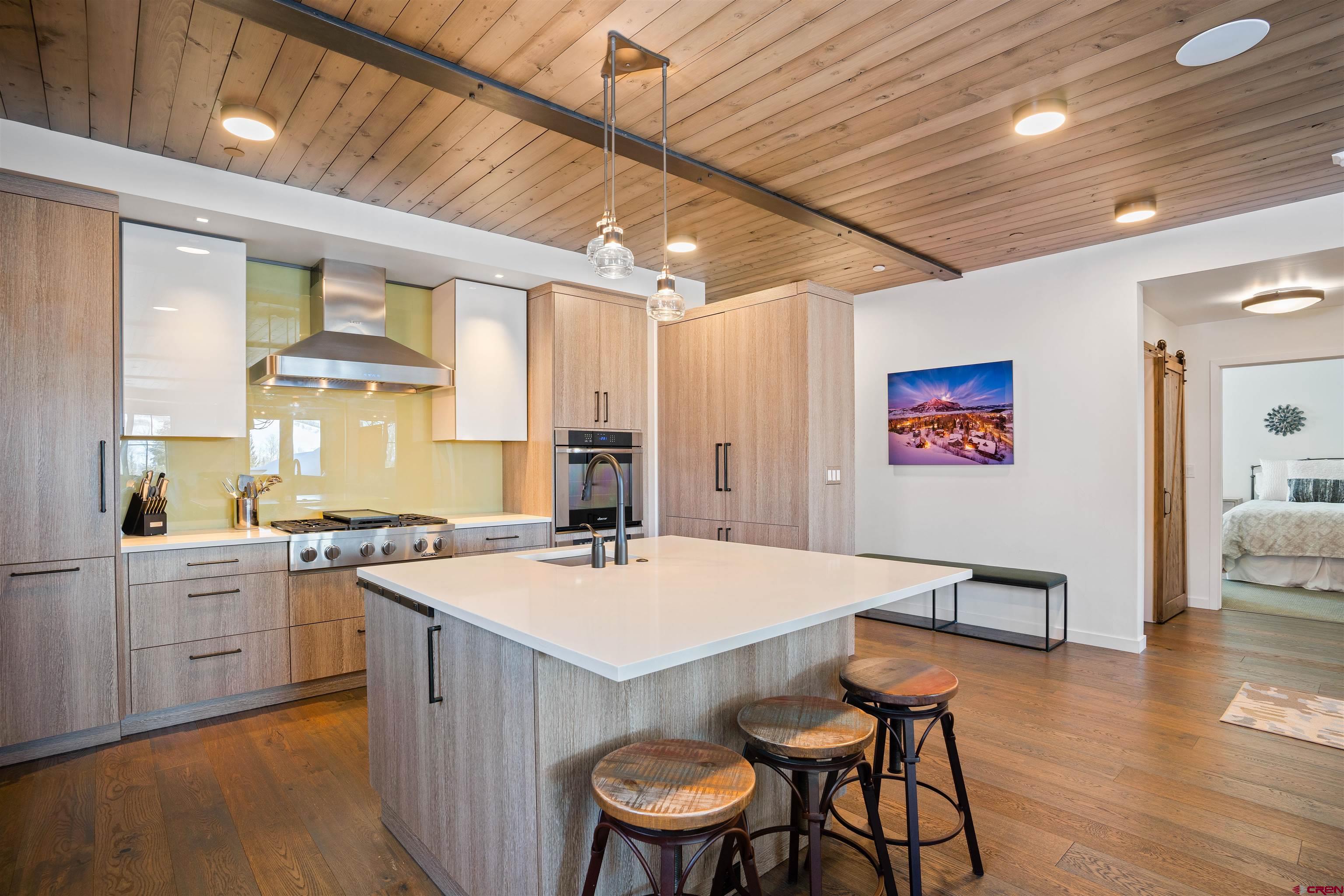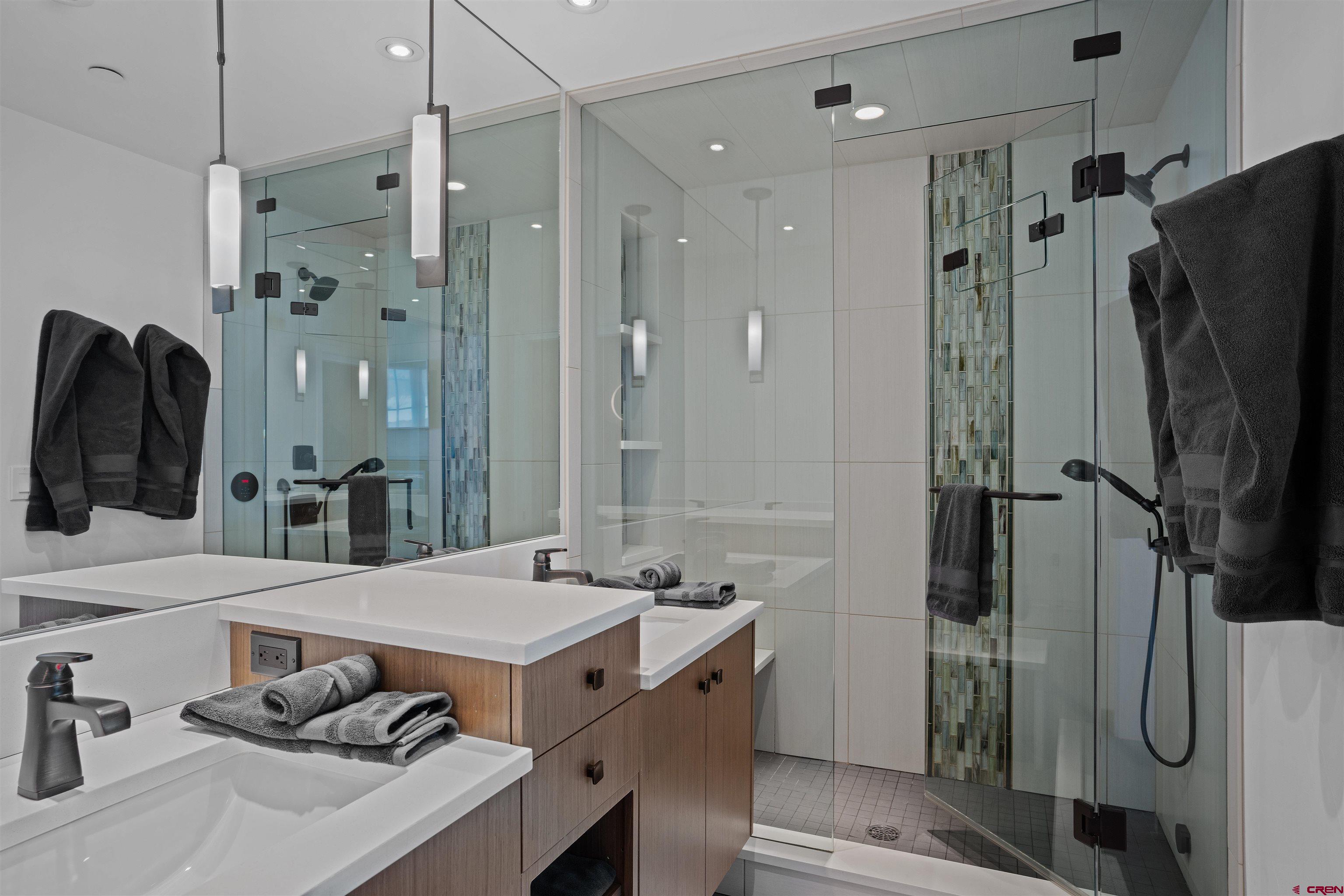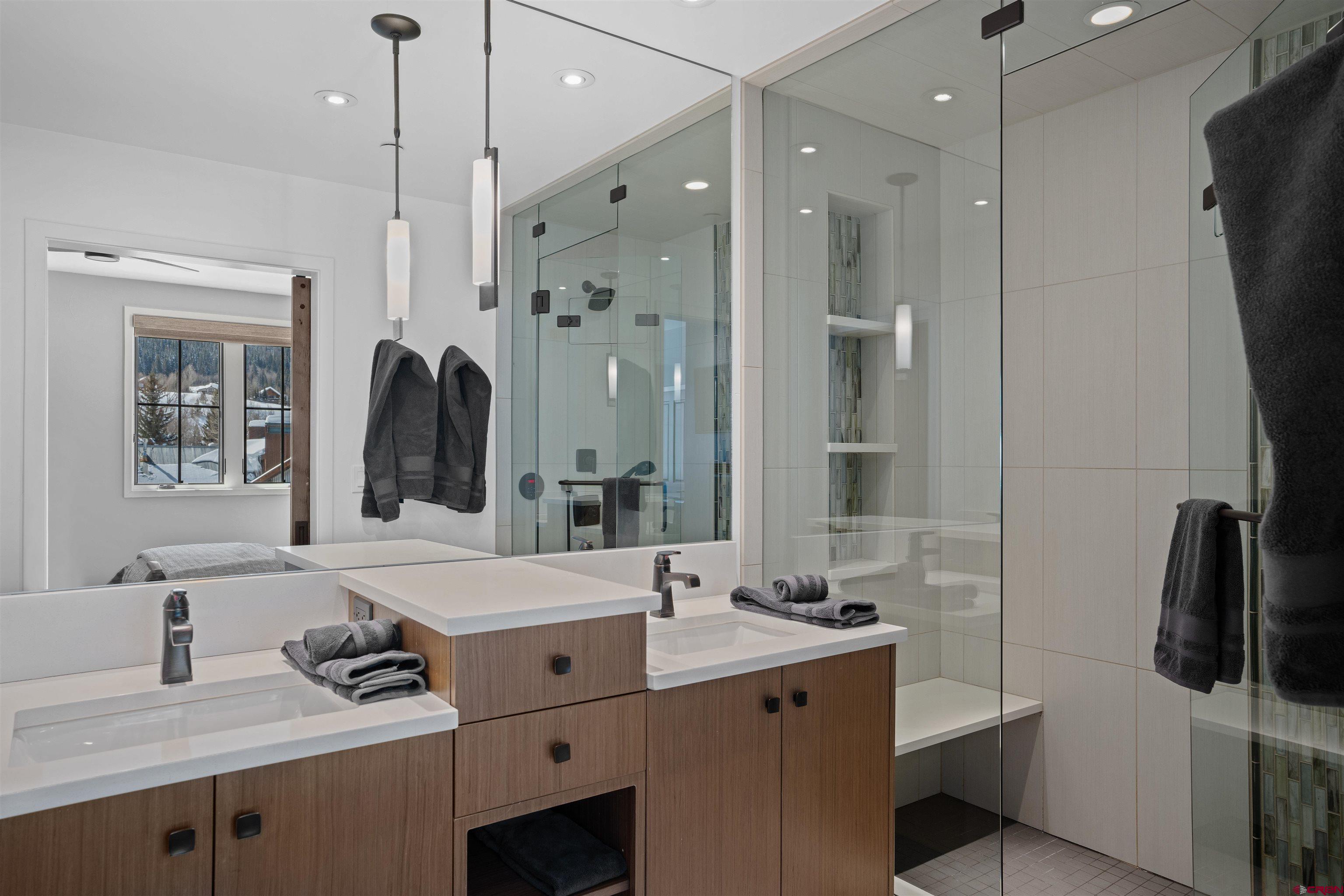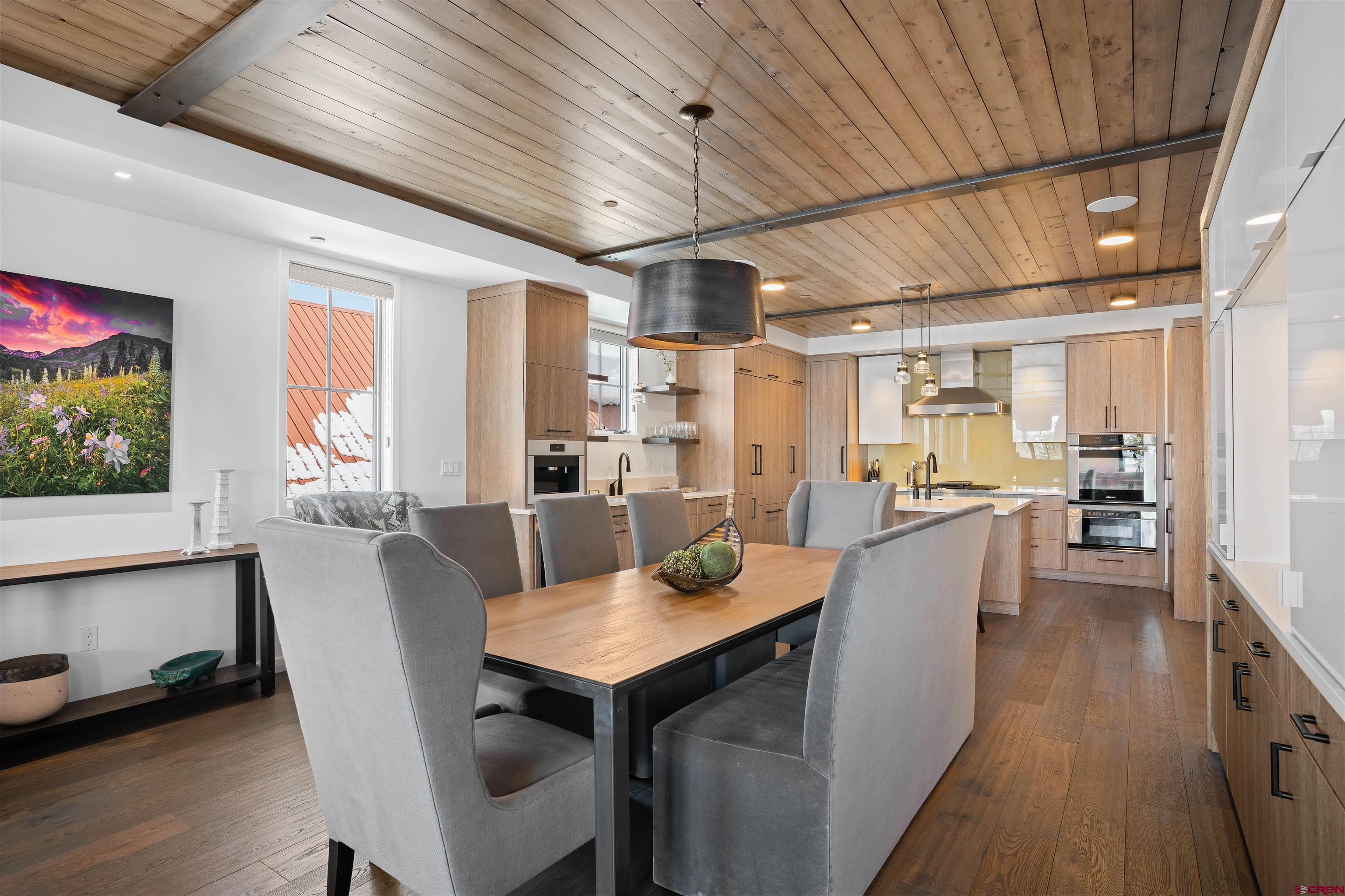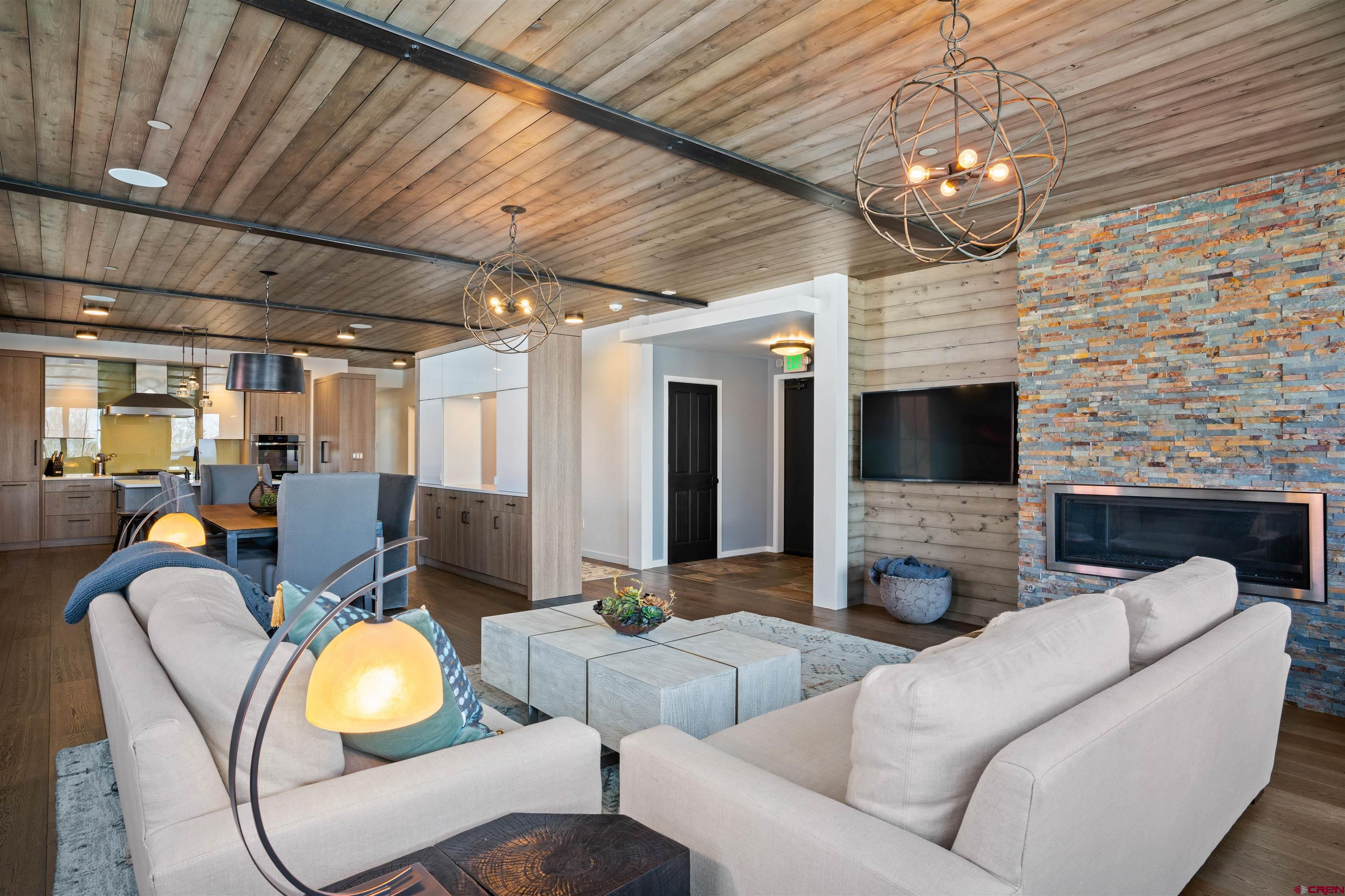 Experience the pinnacle of luxury living in this breathtaking modern mountain penthouse located in the highly sought-after Green Drake building. With over 3,400 total square feet, this magnificent residence boasts 4 spacious bedrooms, 4 lavish bathrooms, and a large private office - all impeccably designed to the highest standards. Crafted by some of the best in the business, Hargrove and Kidd Construction, the stunning interior finish work by Thurston Kitchen and Bath, and the architectural design by Andrew Hadley are a true testament to the exceptional quality of this property. The open floor plan on the top floor is perfect for entertaining and features gorgeous wood floors and ceilings, a gourmet kitchen with Dacor appliances and quartz countertops, built-in coffee bar, large center island, and a dining room with a custom-built buffet. The living room is adorned with a modern fireplace, floor-to-ceiling stacked stone accents, and ample natural light. There are also four bedrooms, two master suites with gas fireplaces and two bedrooms with a shared bath and a lovely balcony with views in every direction. Downstairs, you will find a large fully wired private office with room for a conference table and work stations and a separate bathroom-which all could be rented separately for income. There is also a second office space/storage room that could be a rental option as well. The highlight of the second floor is the 588 sf deck with incredible mountain views. Both floors of the penthouse are ADA accessible with an elevator and level floor plan with wide doors and easy to maneuver flooring. Live in the lap of luxury in the heart of downtown Crested Butte - this property is truly one of a kind and must be seen to be believed. Don't miss your chance to experience the ultimate in sophisticated mountain living.