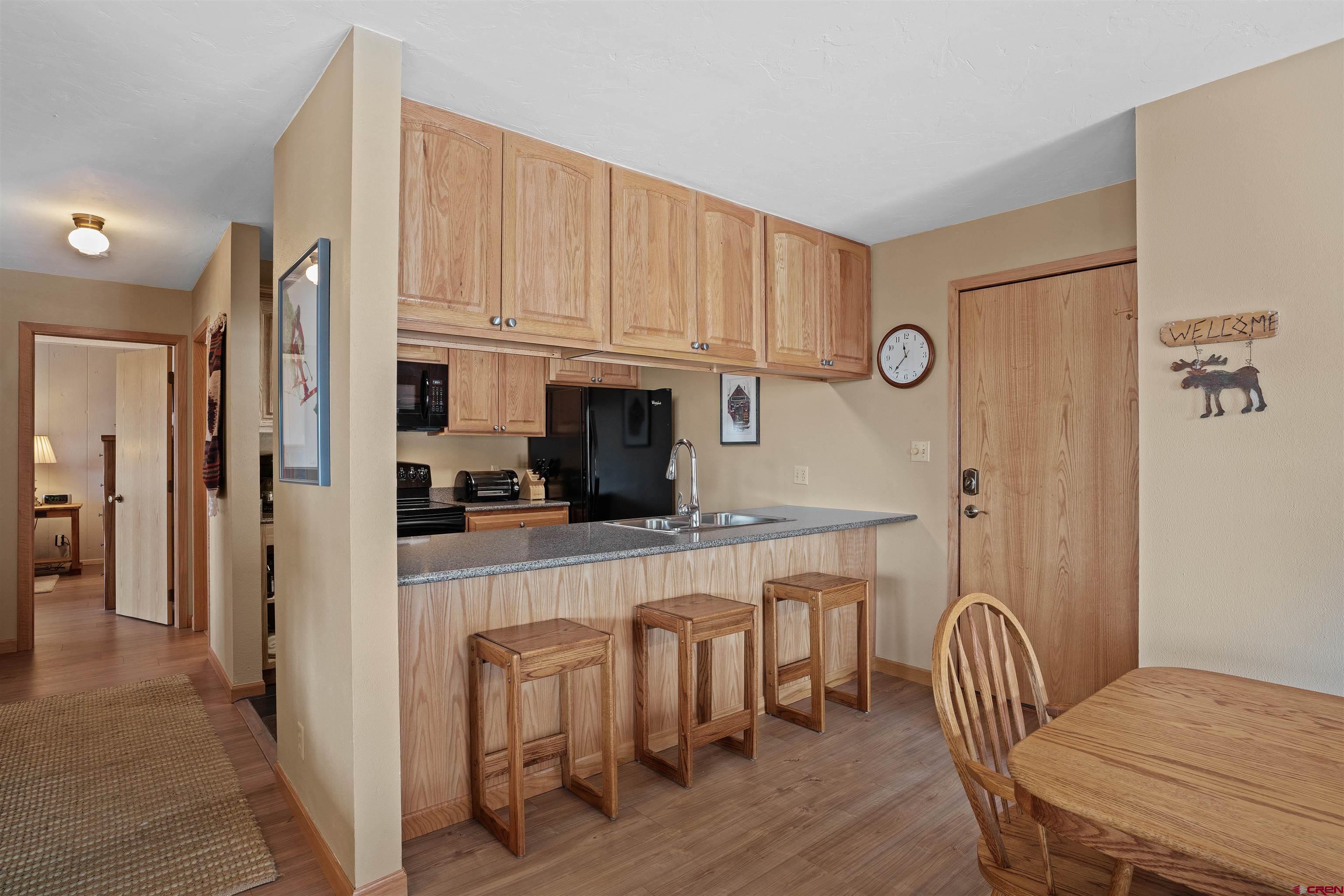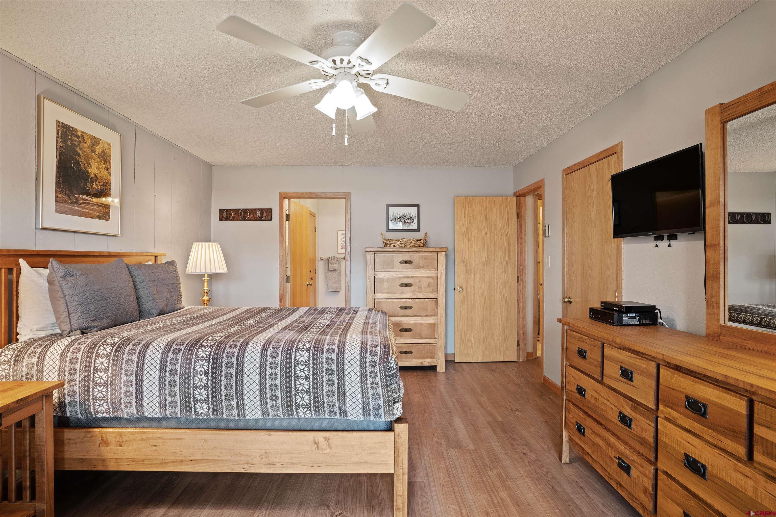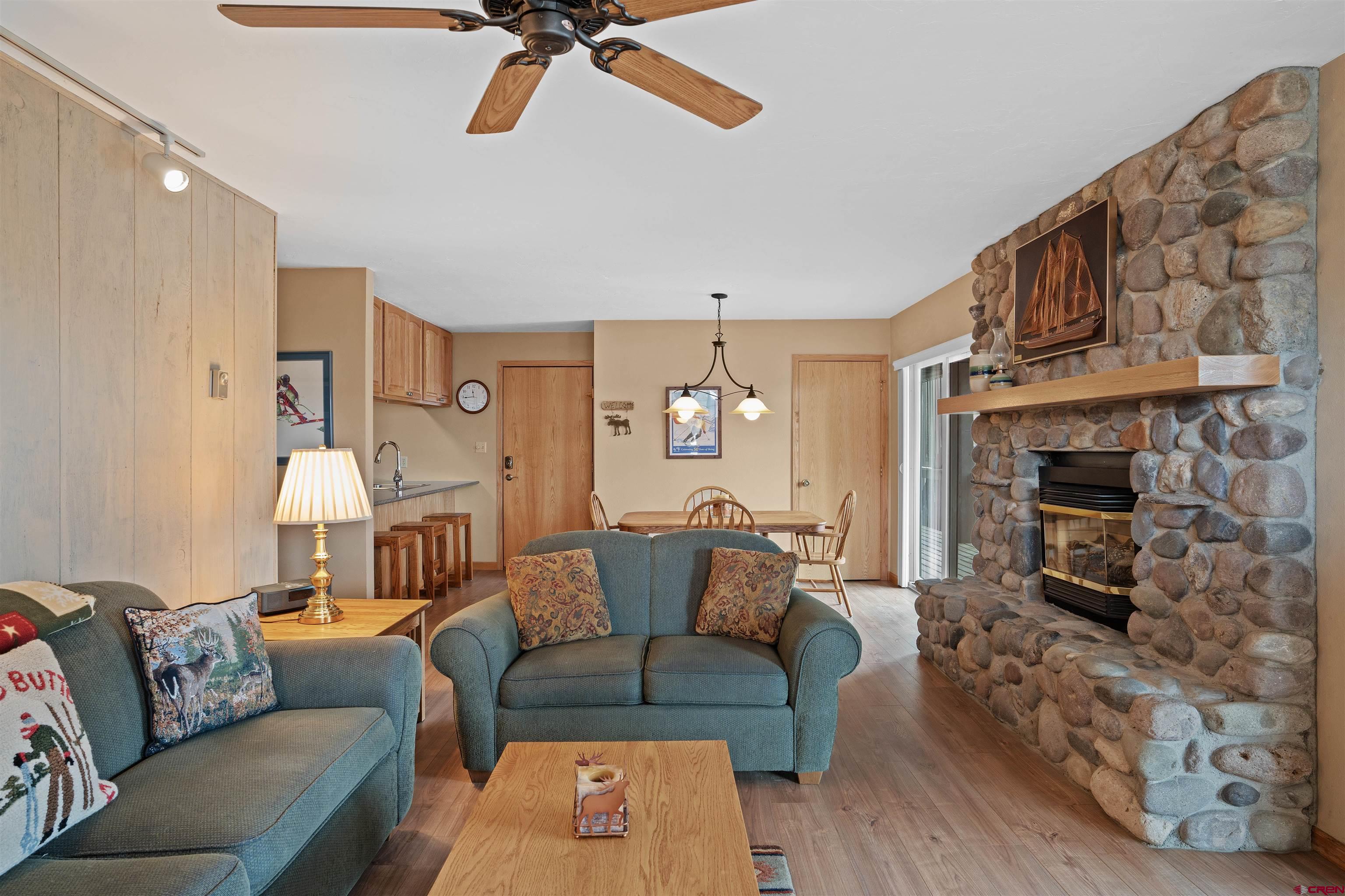 Evergreen #6 is the perfect mountain condo located a short walk to the base area and ski lifts! This corner unit condo offers 2 large bedrooms, 2 bathrooms and a huge wrap around porch with beautiful mountain views. Encompassing 1,018 square feet, you and your guests will feel very comfortable relaxing together and you will enjoy many snowy nights around the gas fireplace after a long day on the slopes or the stunning sunsets in the summer from the west facing covered porch. The living room is spacious with a large window with views and is open to the dining room and there are two brand new sliding glass doors to access outside. The kitchen is well equipped with plenty of storage, counter space, newer appliances and extra seating at the bar. The primary bedroom is massive with two closets that can be utilized as owner's closets if you choose to rent the property. The en-suite bathroom has a brand new stand up tile shower and glass doors and an additional closet for extra storage. You can also access the porch from the primary bedroom! The second bedroom also has plenty of space for a king bed or bunk beds. Across the hall is the second bathroom with an oversized vanity and bathtub. This condo has only had one owner for the last 35 years and they have taken impeccable care of the property. They just recently updated it with all new windows and sliding glass doors throughout, a brand new hot water heater, fresh paint, and new flooring. This is a very popular building for vacation rentals and this property would do very well in the rental pool. The sellers are offering it fully furnished so it is set up for you to enjoy right away! The building has a lovely outdoor hot tub and indoor sauna and you will love soaking your tired muscles after a long day in the mountains. This is a year round destination with amazing hiking and biking trails nearby and world-class skiing. This is the perfect home base for all of your adventures!