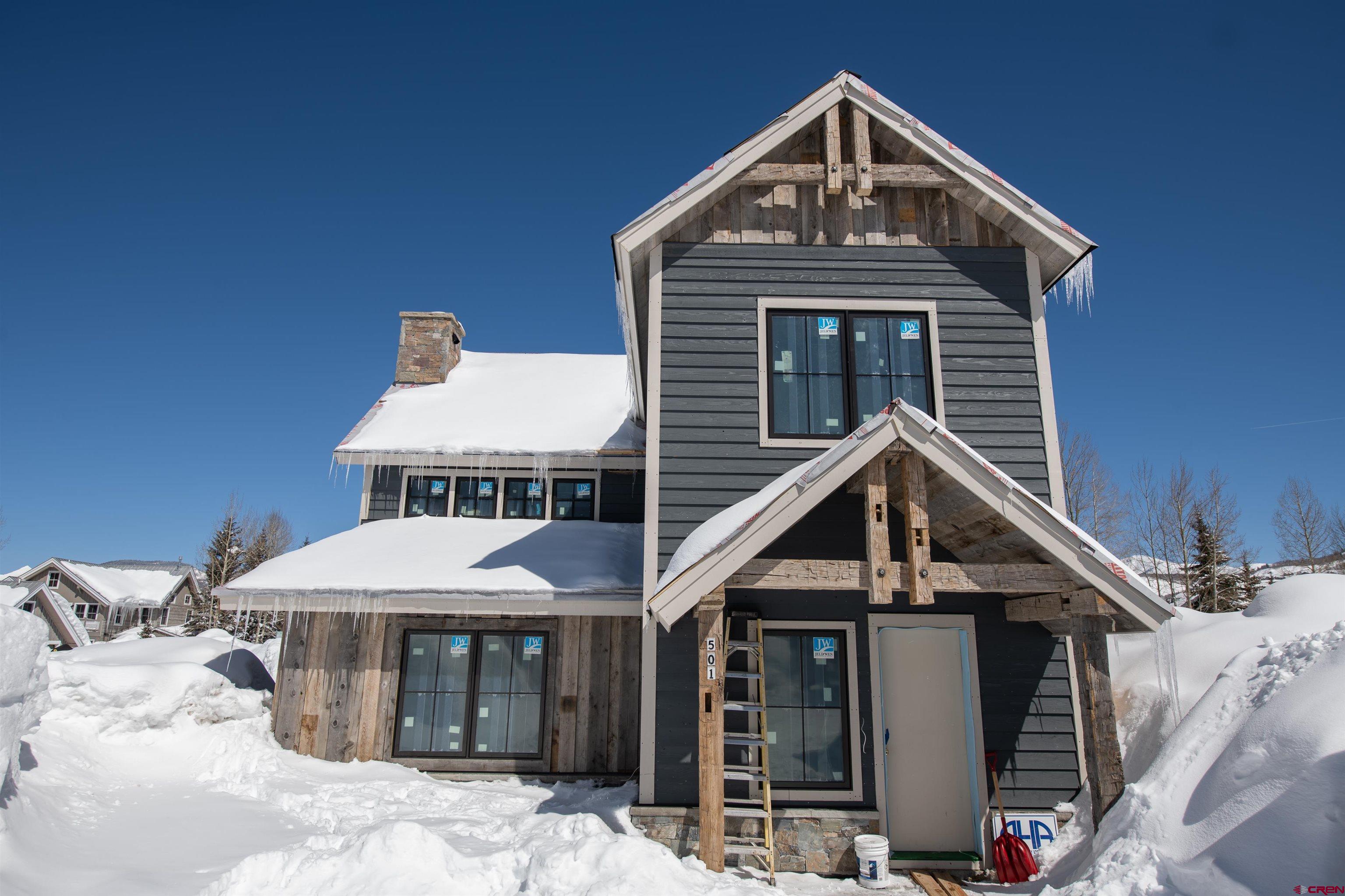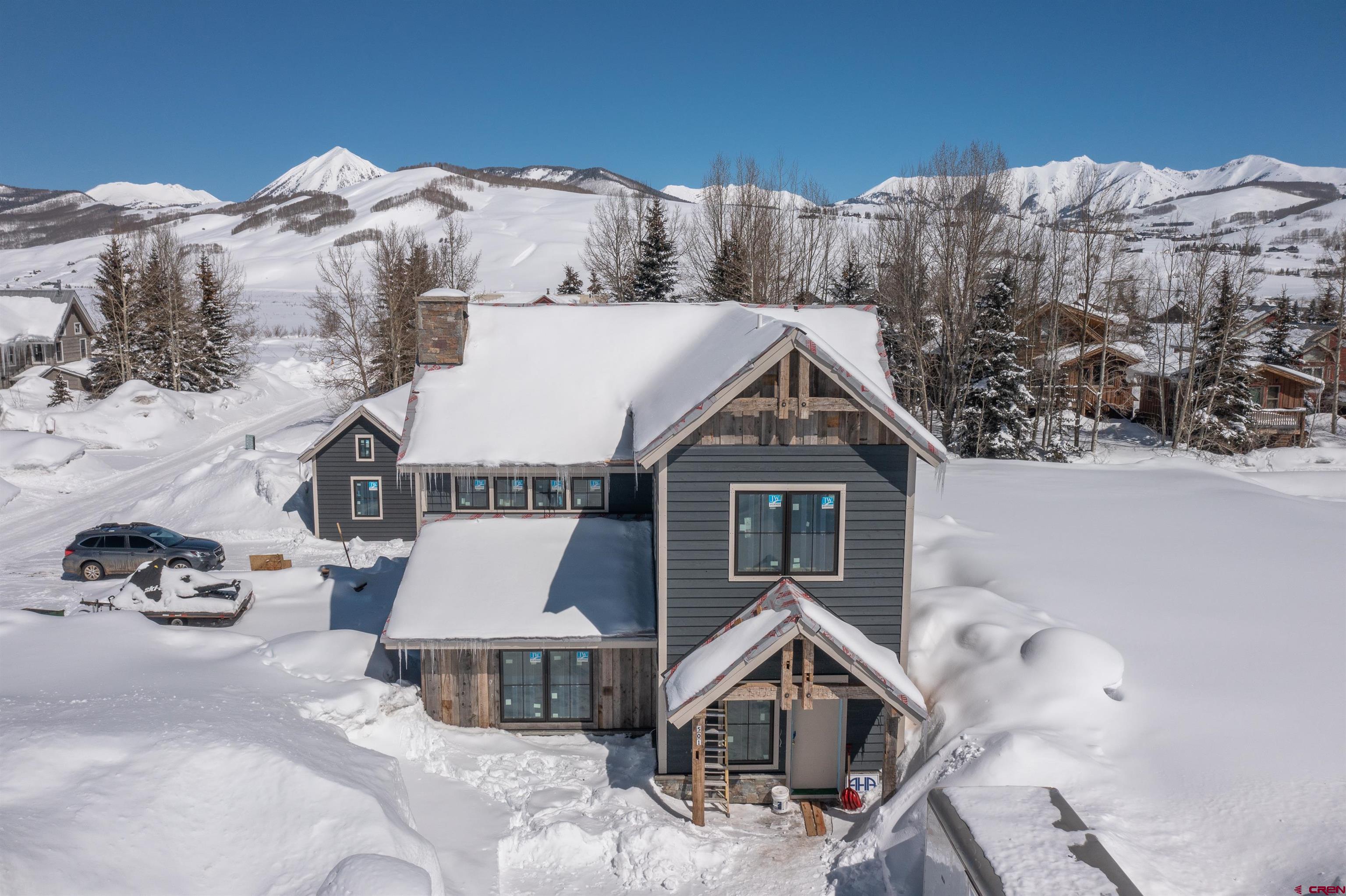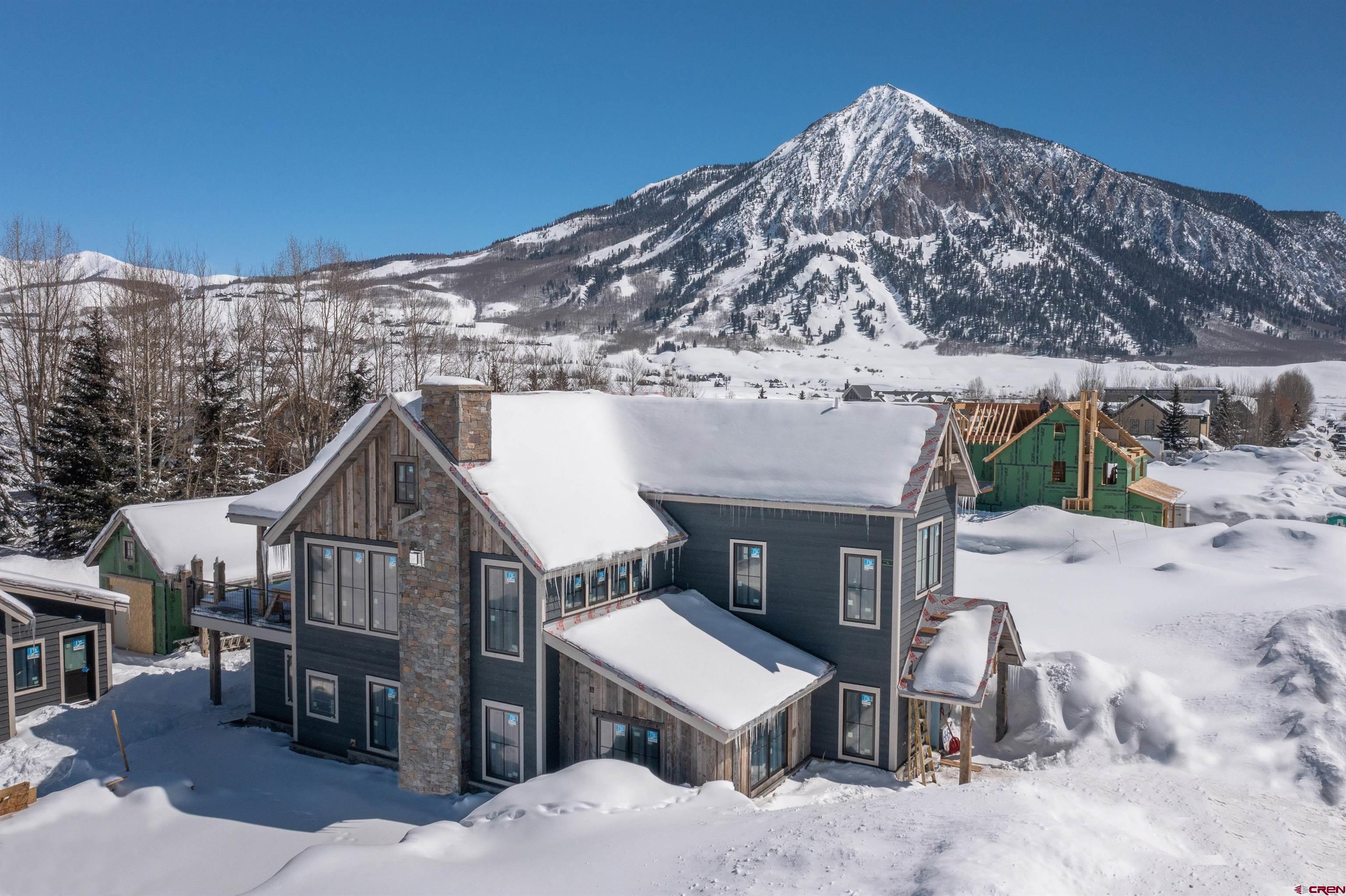 Recognized as a Crested Butte top home builder by Mountain Living Magazine in 2023, Midtown Mountain's latest and most exquisite design-build at 501 Teocalli Avenue is nearing completion and will be ready for possession in July! This is the company's 5th generation mountain modern home build and one of their very best. The home's layout features four bedrooms, five bathrooms, a separate 264 SF accessory cabin and a detached, two-car 585 SF garage with EV chargers and a space for an RV. Interior design highlights include vaulted ceilings, a stunning mix of architectural steel and reclaimed wood beams, wide plank oak flooring, Caesarstone and quartzite tops and an amazing chef's kitchen outfitted in Wolf and SubZero with a 7 x 8 ft center island! The living room's three sided glass fireplace is incredible with it's steel and stone treatments. The home's decor will include Restoration Hardware furnishings. Sitting on an oversized .22 acre corner parcel, the south facing home enjoys beautiful Colorado solar gain and dramatic views of Gibson's Ridge, Mt. Emmons and Mt. Crested Butte. The deck off the main living area is one of the biggest in Town and the yard is huge! It’s a quick walk or pedal to Elk Avenue dining and shopping and the ski resort shuttle stop is one block away!