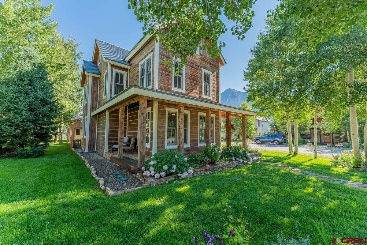 Nestled under tall aspens and surrounded by exquisite gardens, 829 Belleview Avenue offers respite from the bustle of downtown while still only a short walk or ride to the shops and restaurants of Elk Avenue. Unwind in one of the many outdoor living spaces, breathe in the fresh mountain air, and revel in the views. As you approach the covered porch and main entry, the plank wood chinked siding greets you with a familiar mountain feel. The generous entry is complete with slate tile and has plenty of room for your gear. This entry level consists of two spacious guest bedrooms, a shared guest bathroom, primary bedroom suite, and laundry room. The primary suite enjoys an abundance of natural light, views of Mt. Crested Butte, walk-in closet, steam shower, soaking tub, and hardwood floors. The second floor is home to the beautifully crafted open living, dining and kitchen along with a separate office and powder bath. Highlights include vaulted ceilings, custom woodwork and beams, distinctive stone fireplace, and hardwood floors. Step through the French doors onto the deck to enjoy a quiet morning coffee, late afternoon cocktail, or a meal with loved ones. Off the dining area is a wet bar with wine cooler. The kitchen features granite counters, custom cabinetry, and farmhouse sink. The spacious third floor bedroom is perfect for guests with private full bath and built-in shelving. Accessed off the alley is the detached 2-car garage providing additional parking and storage. Recent updates include all new exterior stain and new radon mitigation system in the crawlspace. Offered partially furnished, this home is move-in ready to start living your best mountain life.