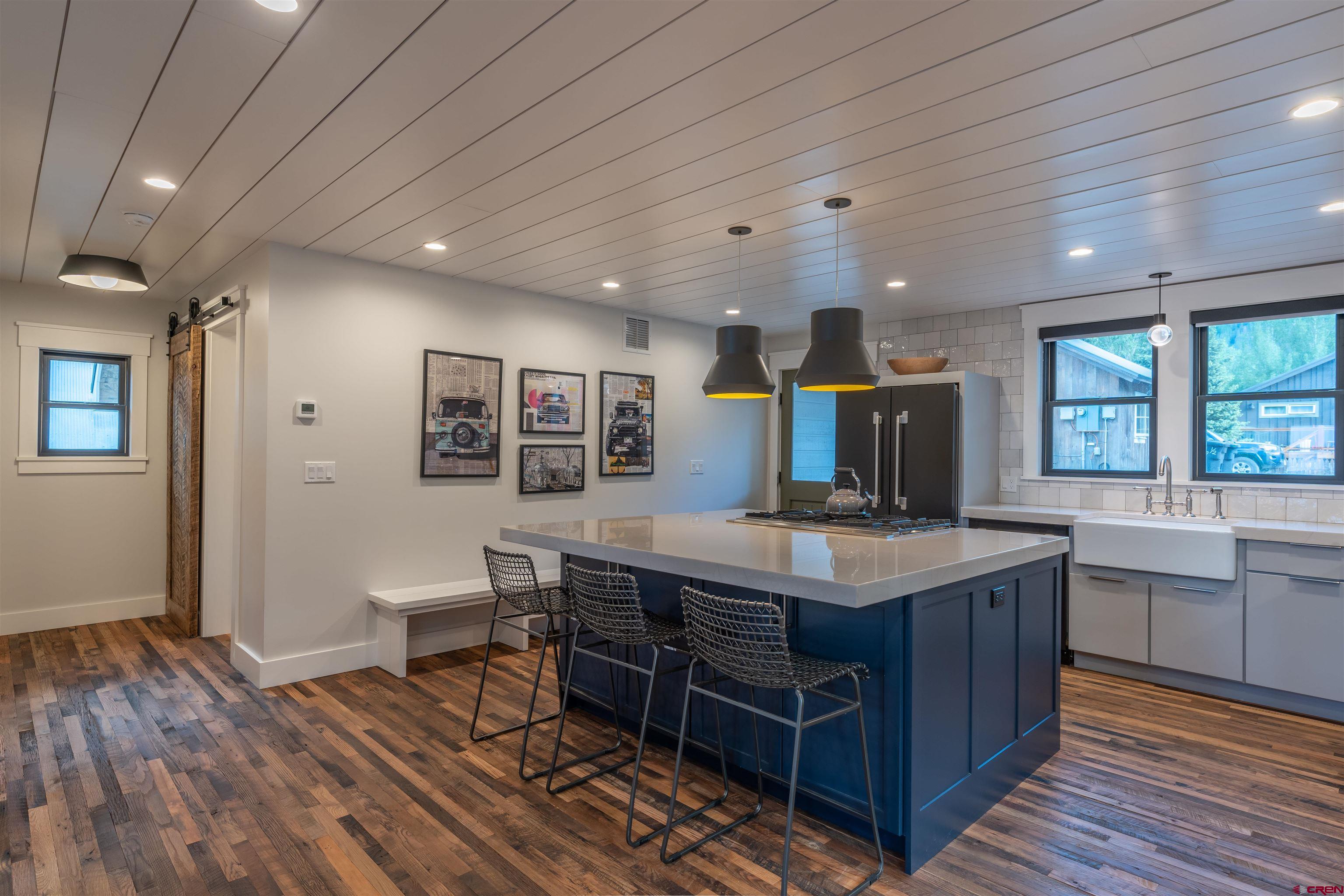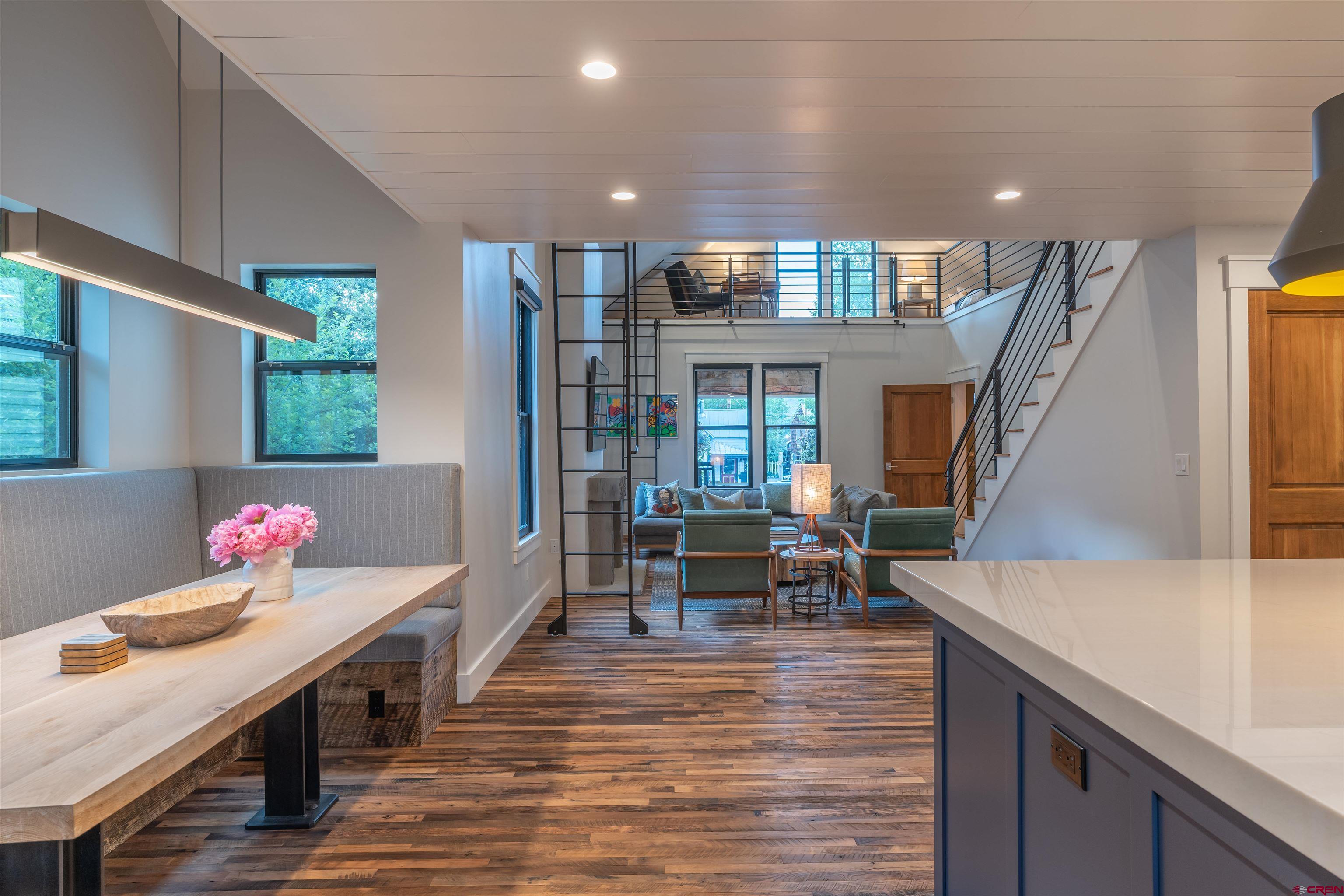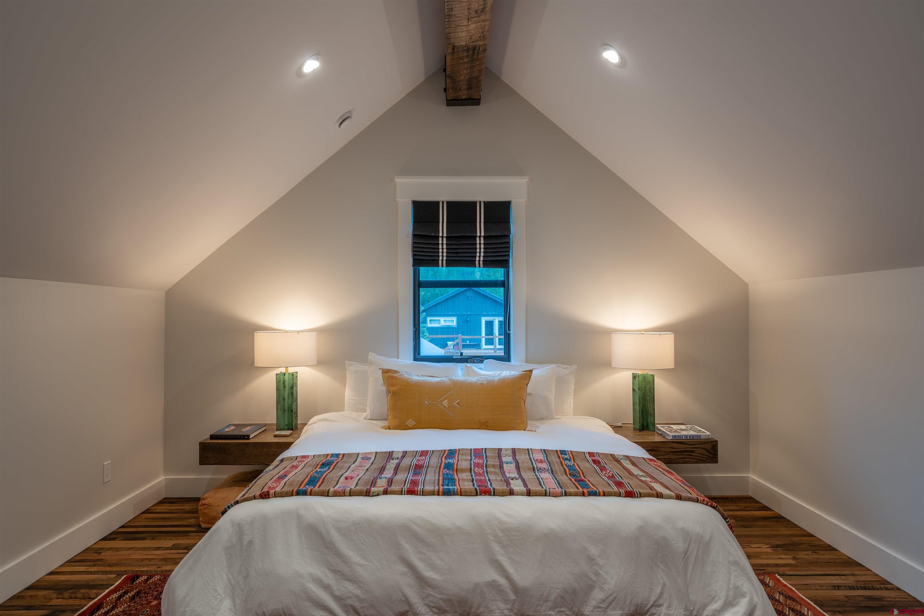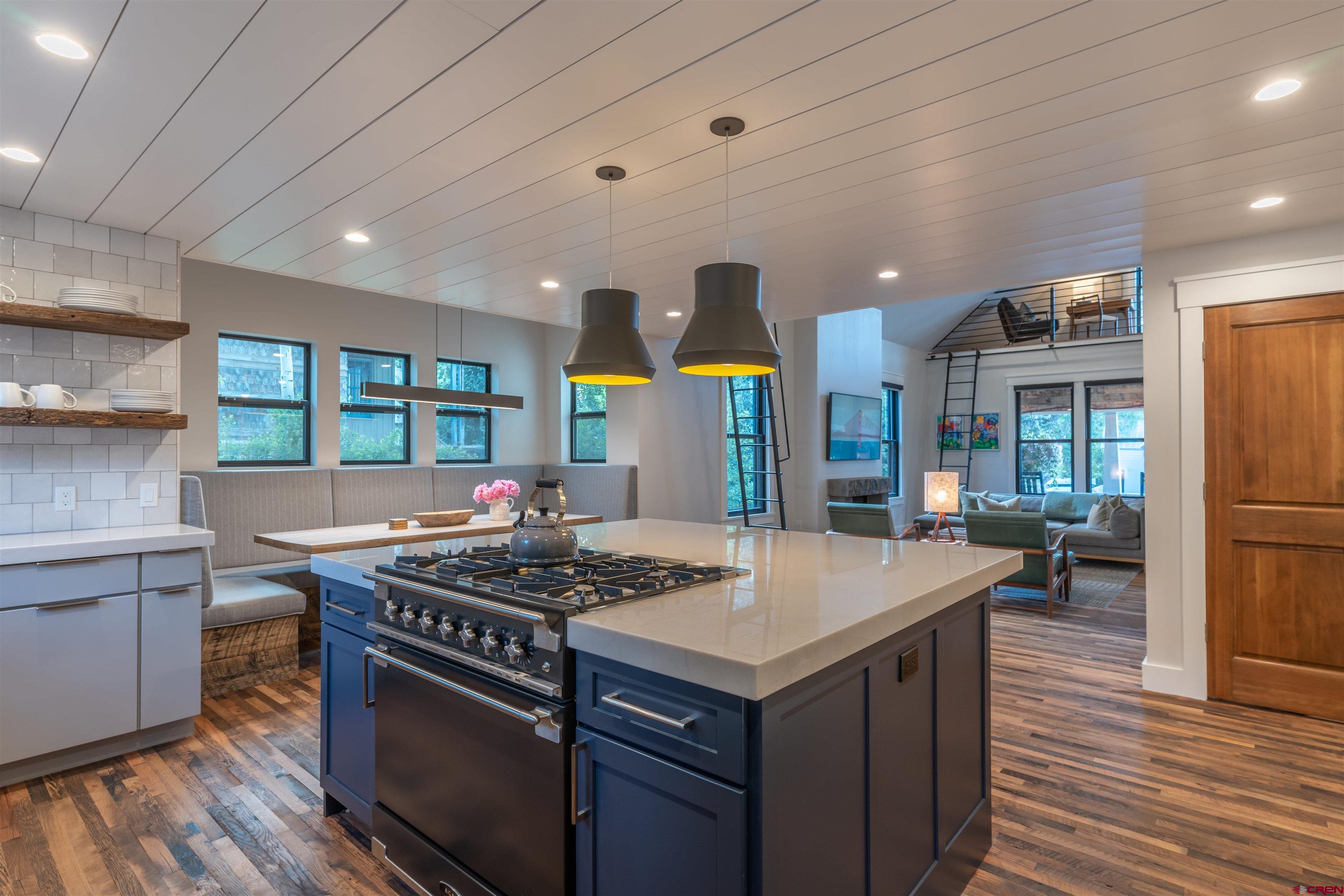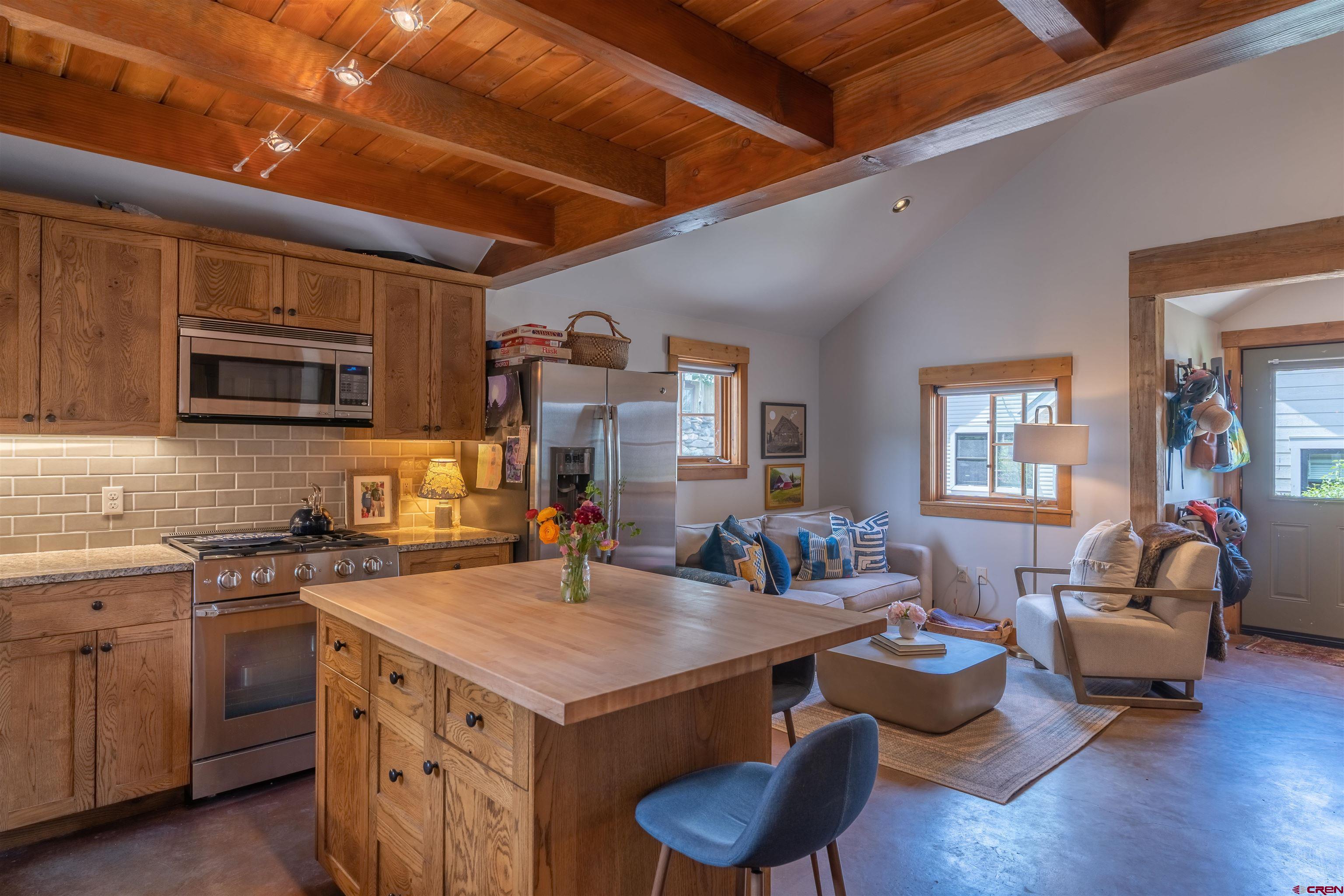 426 Elk Avenue is an incredible combination of historical significance, modern brilliance and detailed craftsmanship. Since 1900, this iconic house has witnessed life in the heart of Downtown Crested Butte and has been a centerpiece of the community. The home only recently realized its full potential through a complete and loving renovation; no detail was overlooked in the re-creation. Using Wabi Sabi, a Japanese method that embraces imperfections as the inspiration and method, the builder, owner and interior designer collaborated to create a home that exudes refinement in every detail. It is the perfect combination of mountain luxury and historic charm. The living room showcases the narrow slatted reclaimed Oak flooring, vaulted ceilings welcoming in the beautiful Colorado sunshine and stone surround gas fireplace. The custom bookshelf is a perfect accent to the living room and is complete with a rolling iron ladder. The builder isn't just a builder, he is an artisan and salvaged wood from the renovation to build custom features including the beautiful built-in dining table. The kitchen boasts lunation quartzite slab countertops, custom painted cabinets, stunning black AGA appliances and open shelving made from reclaimed wood. The primary bedroom allows you to relax as soon as you walk in the door thanks to the elegant upholstered accent wall, natural lighting and subtle yet refined furnishings. The first floor bathroom has custom hand painted fired clay tile in the walk-in shower and a floating vanity with hand crafted cement vessel sink. Upstairs, the guest bedroom is equally charming with gorgeous wood beam accents, custom built furniture including floating nightstands and a walk-in closet. The second bathroom includes Belgian Bluestone flooring, a handmade vanity crafted from reclaimed wood, double sinks and hand painted fired clay tile in the shower. Perched above the living room is a spacious loft area that works for extra sleeping space and the perfect work from home location with a great view of Mt. Crested Butte. The owner had the brilliant idea to add a door from the loft into the bathroom for easy access. Enjoy the health and wellness benefits of the hidden infrared sauna and shower with Belgian Bluestone throughout. The exterior features a coveted front porch elevated above Elk Avenue, detailed landscaping, charming iron fence and private flagstone patio in the back. Finally, the newly built accessory dwelling includes one bedroom, one bathroom, cement flooring with in-floor heat and a generous loft. This is your chance to own an iconic piece of Crested Butte history that is brand new and completely turn-key, just bring your clothes, bikes and favorite vintage.