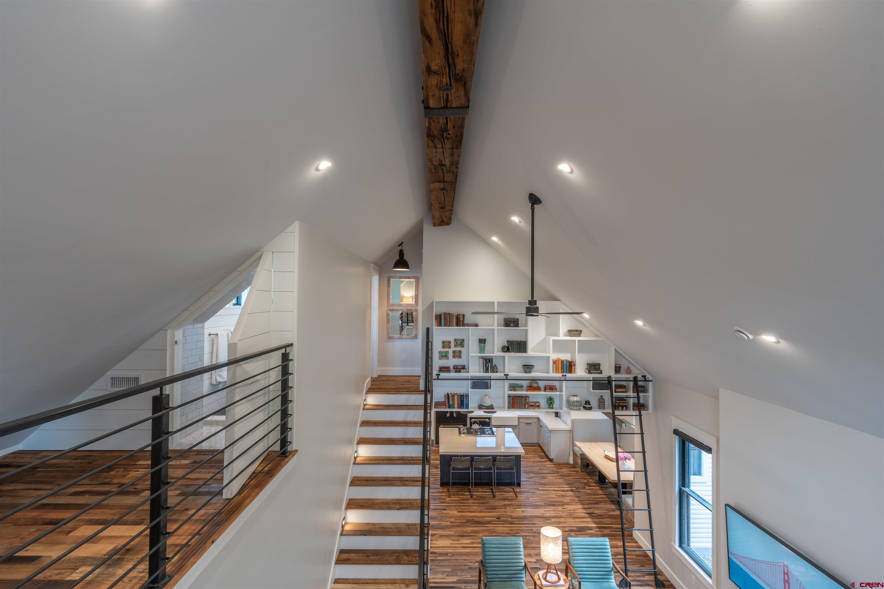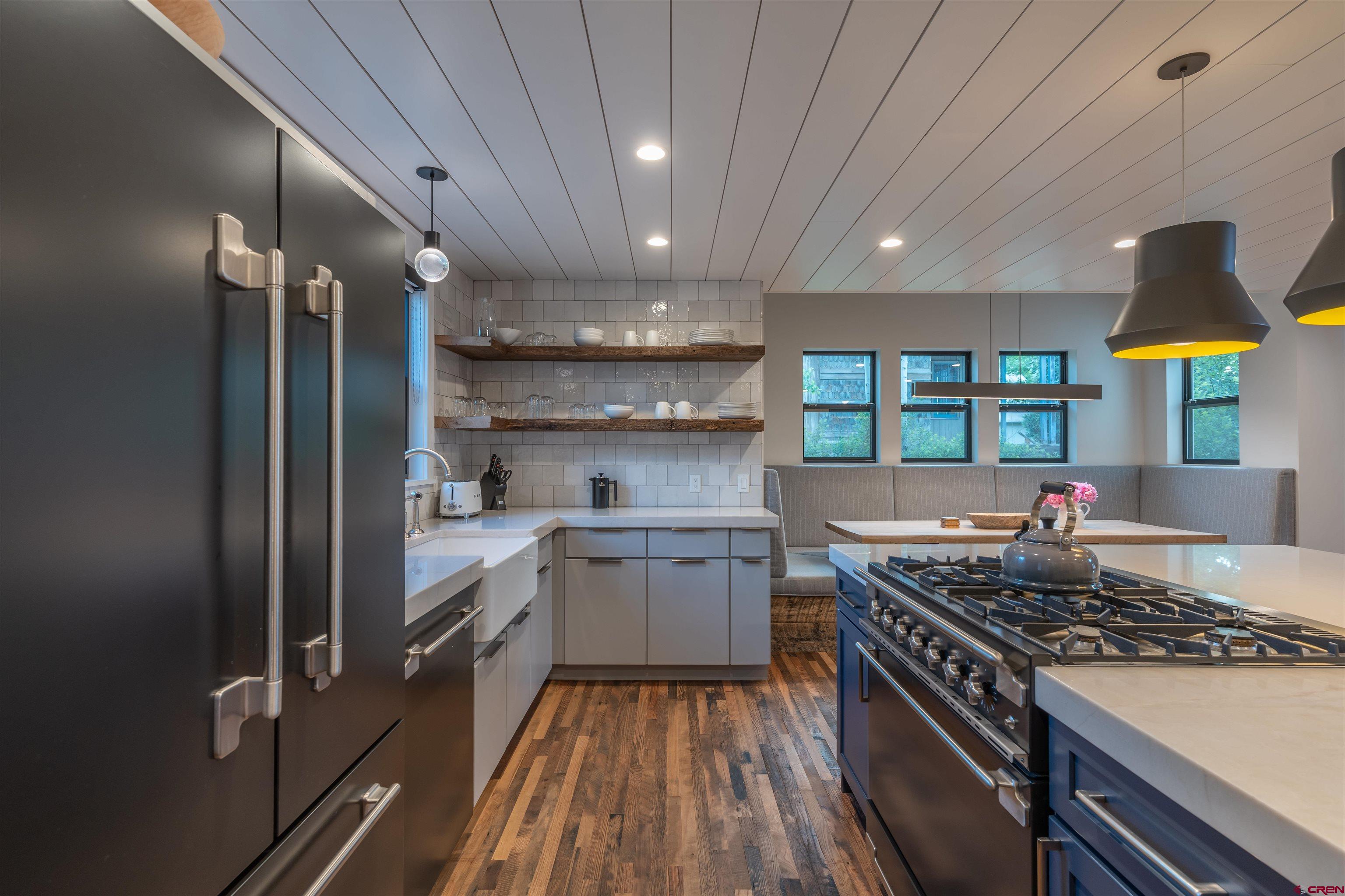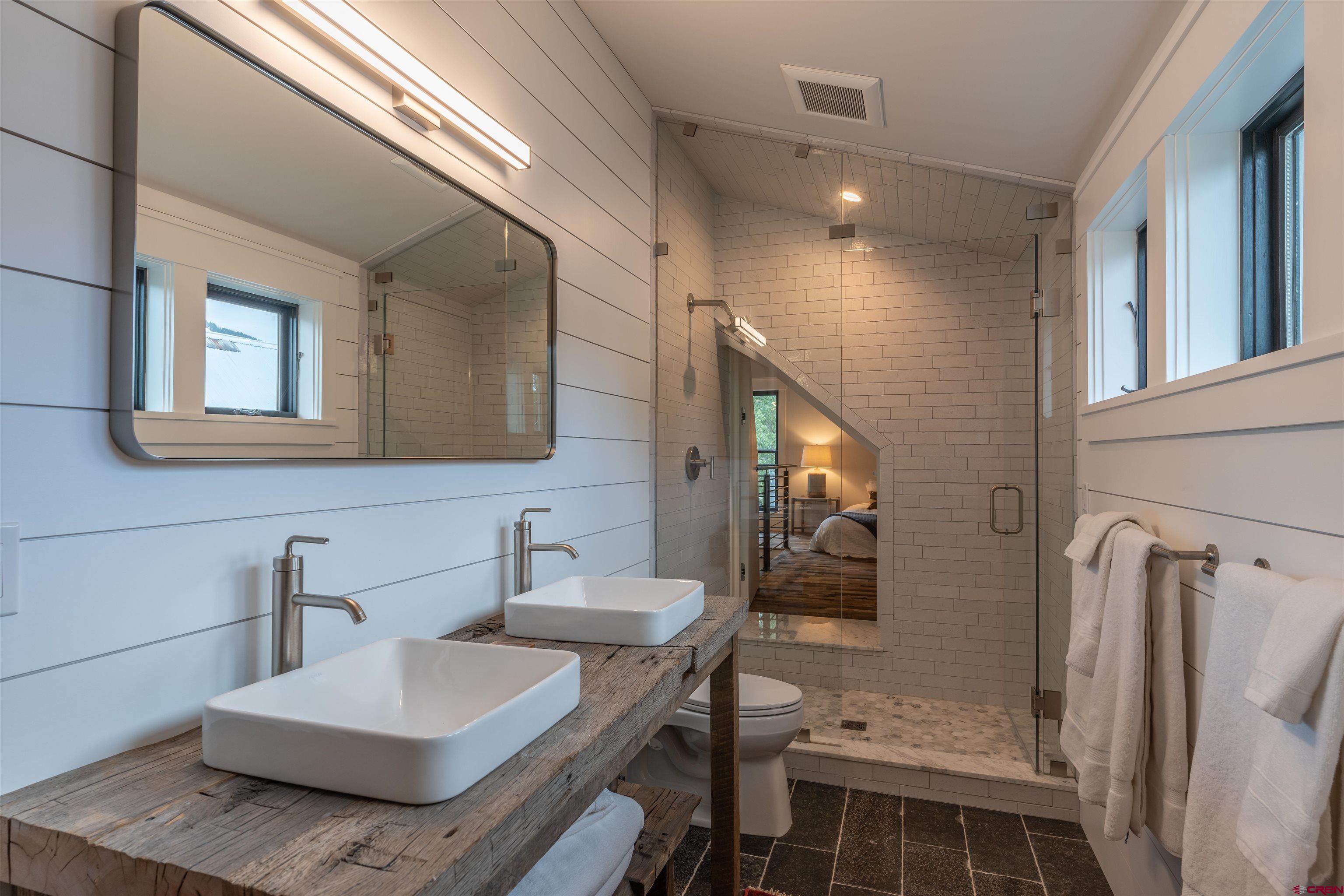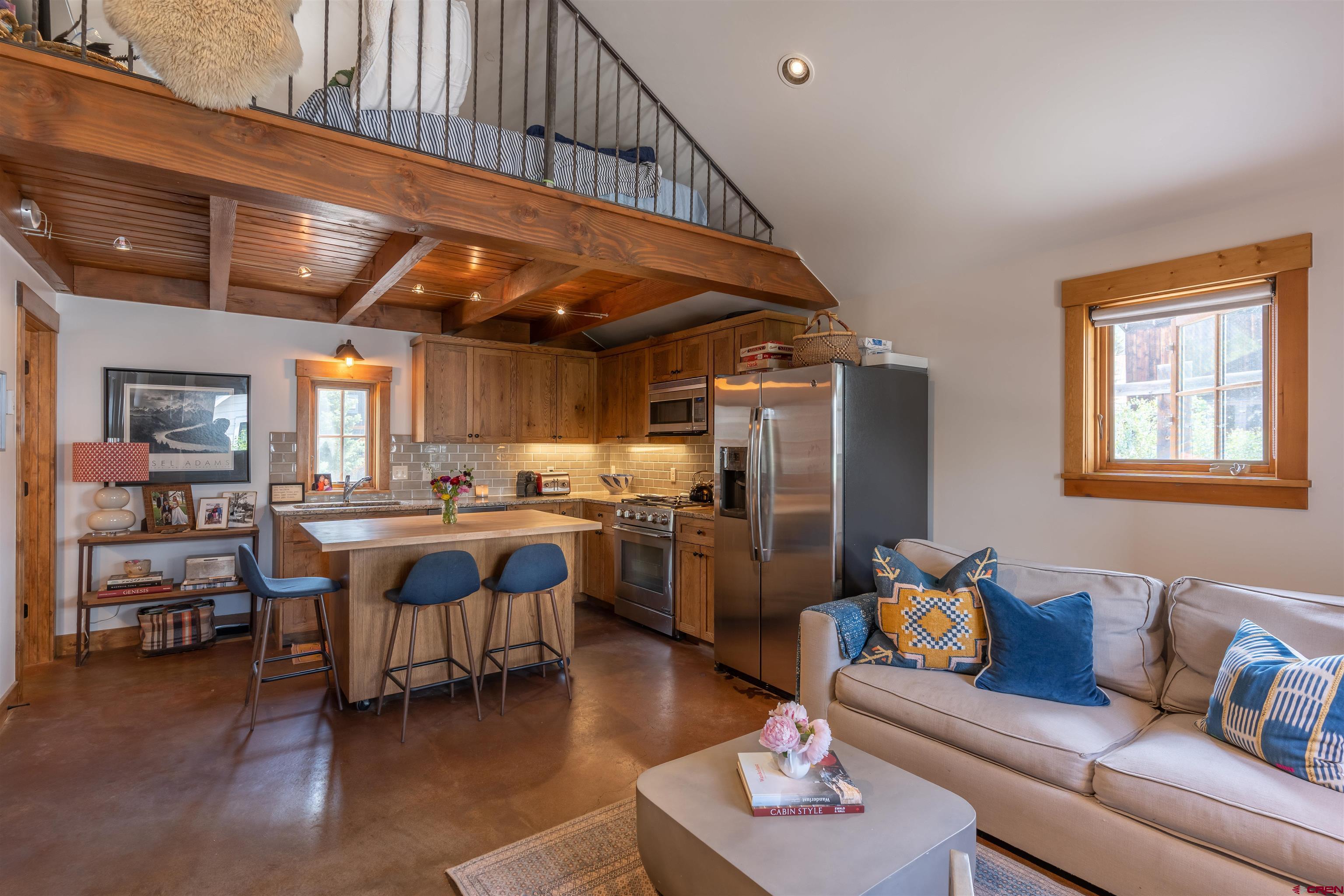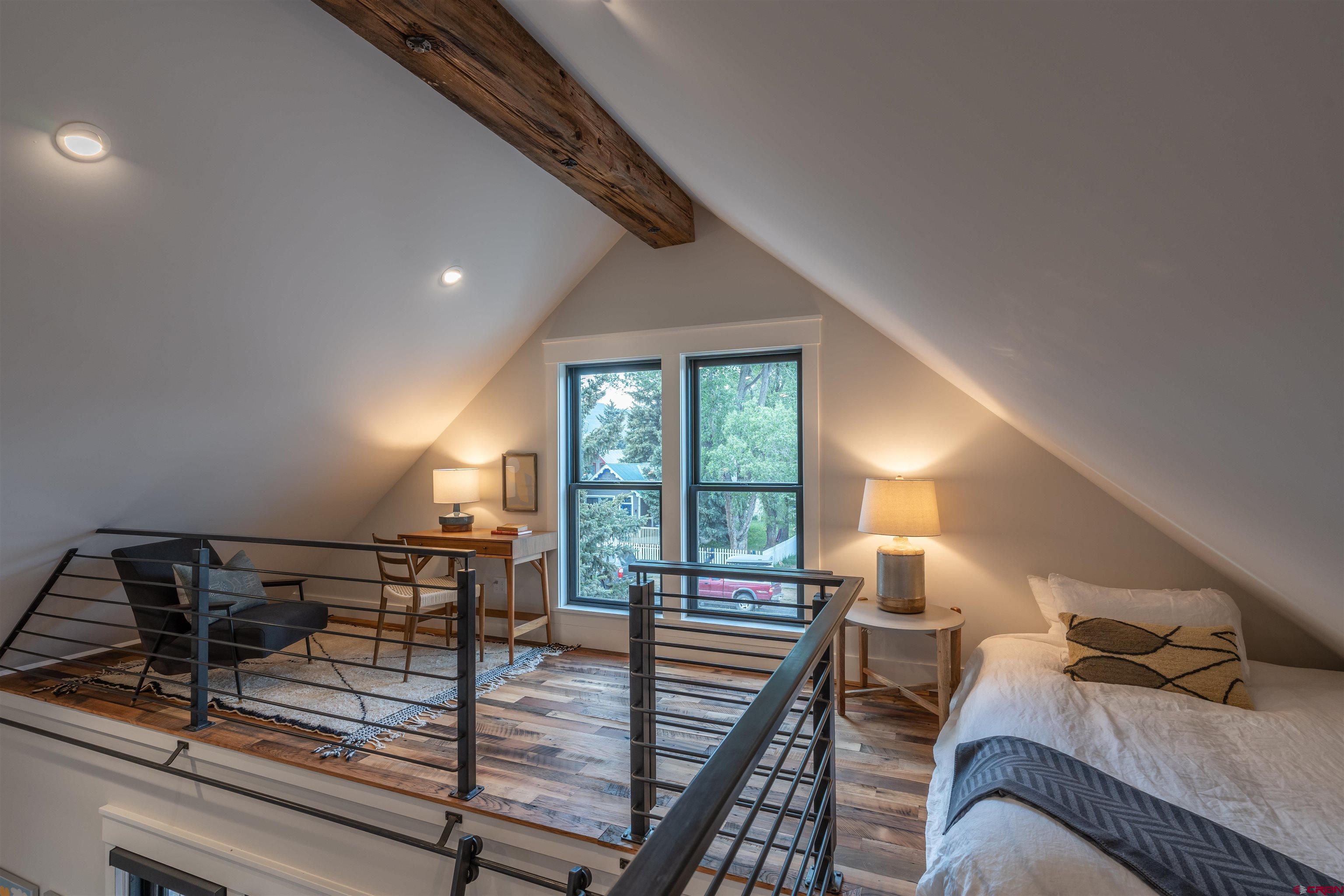 426 Elk Avenue is an incredible combination of historical significance, modern brilliance and detailed craftsmanship. Since 1900, this iconic house has witnessed life in the heart of Downtown Crested Butte and has been a centerpiece of the community. The home only recently realized its full potential through a complete and loving renovation; no detail was overlooked in the re-creation. Using Wabi Sabi, a Japanese method that embraces imperfections as the inspiration and method, the builder, owner and interior designer collaborated to create a home that exudes refinement in every detail. It is the perfect combination of mountain luxury and historic charm. The living room showcases the narrow slatted reclaimed Oak flooring, vaulted ceilings welcoming in the beautiful Colorado sunshine and stone surround gas fireplace. The custom bookshelf is a perfect accent to the living room and is complete with a rolling iron ladder. The builder isn't just a builder, he is an artisan and salvaged wood from the renovation to build custom features including the beautiful built-in dining table. The kitchen boasts lunation quartzite slab countertops, custom painted cabinets, stunning black AGA appliances and open shelving made from reclaimed wood. The primary bedroom allows you to relax as soon as you walk in the door thanks to the elegant upholstered accent wall, natural lighting and subtle yet refined furnishings. The first floor bathroom has custom hand painted fired clay tile in the walk-in shower and a floating vanity with hand crafted cement vessel sink. Upstairs, the guest bedroom is equally charming with gorgeous wood beam accents, custom built furniture including floating nightstands and a walk-in closet. The second bathroom includes Belgian Bluestone flooring, a handmade vanity crafted from reclaimed wood, double sinks and hand painted fired clay tile in the shower. Perched above the living room is a spacious loft area that works for extra sleeping space and the perfect work from home location with a great view of Mt. Crested Butte. The owner had the brilliant idea to add a door from the loft into the bathroom for easy access. Enjoy the health and wellness benefits of the hidden infrared sauna and shower with Belgian Bluestone throughout. The exterior features a coveted front porch elevated above Elk Avenue, detailed landscaping, charming iron fence and private flagstone patio in the back. Finally, the newly built accessory dwelling includes one bedroom, one bathroom, cement flooring with in-floor heat and a generous loft. This is your chance to own an iconic piece of Crested Butte history that is brand new and completely turn-key, just bring your clothes, bikes and favorite vintage.