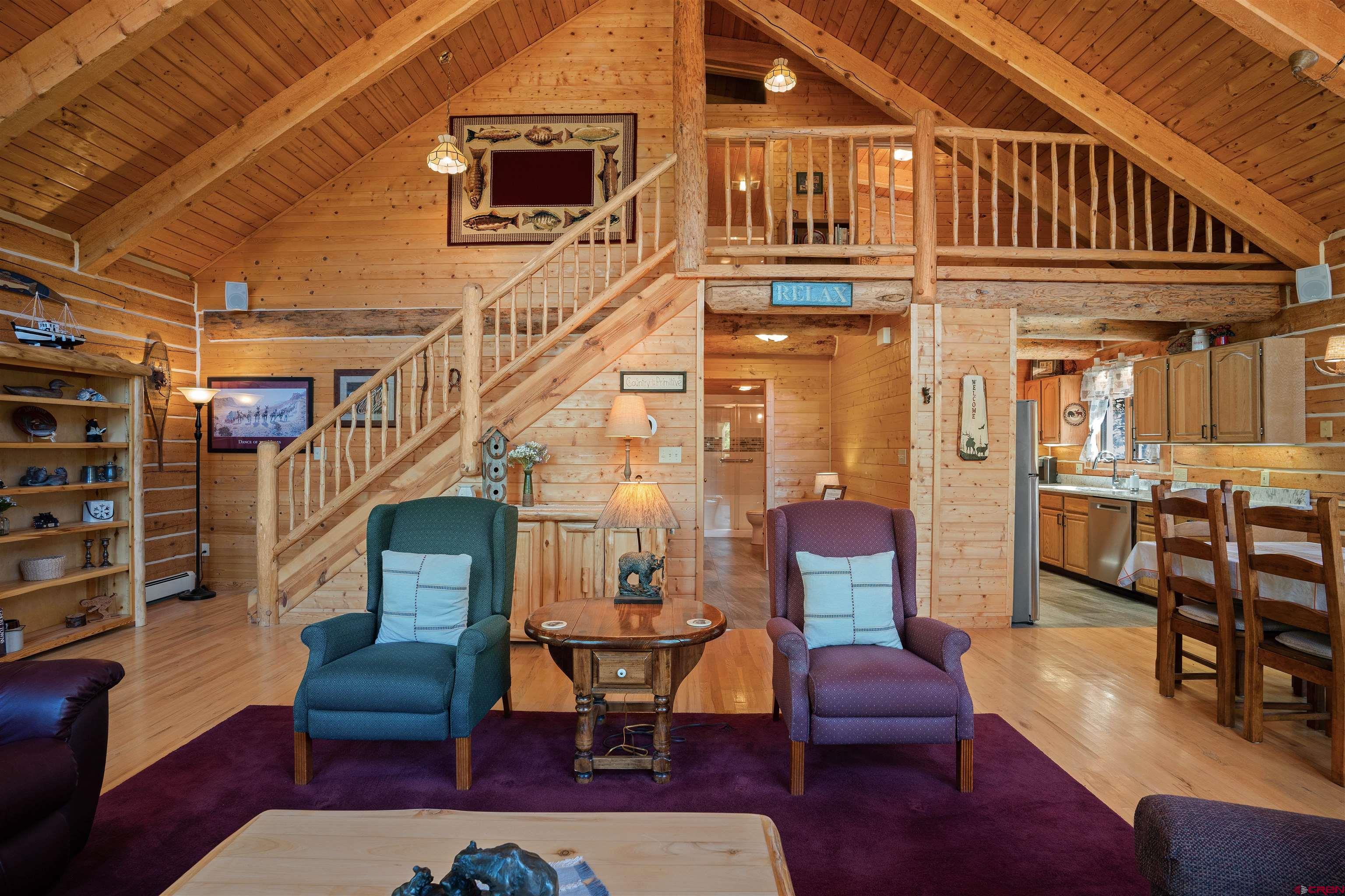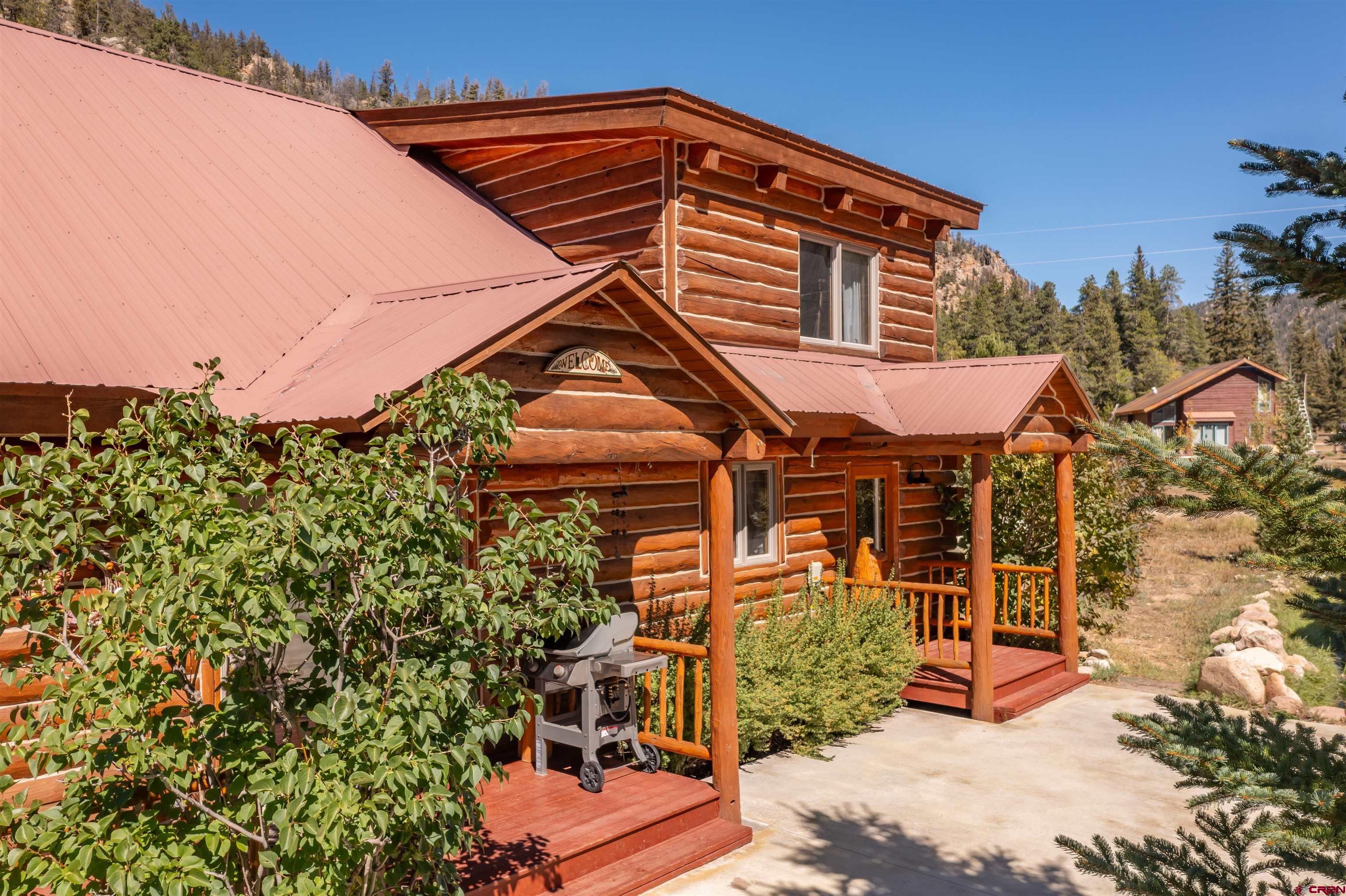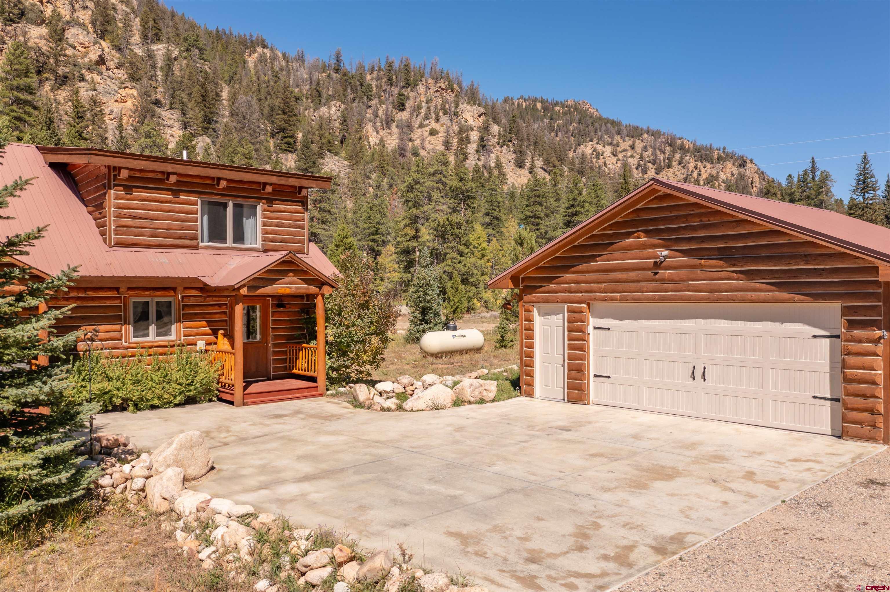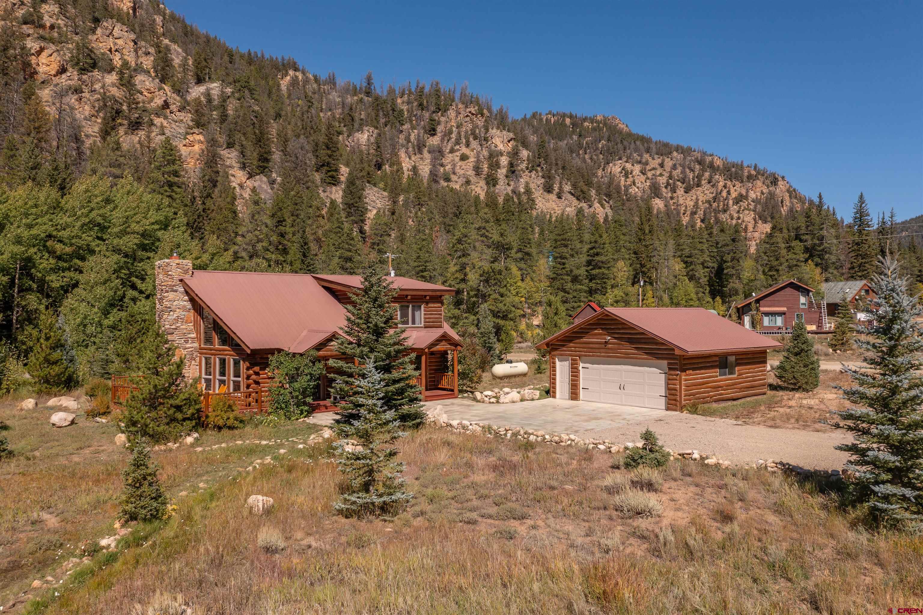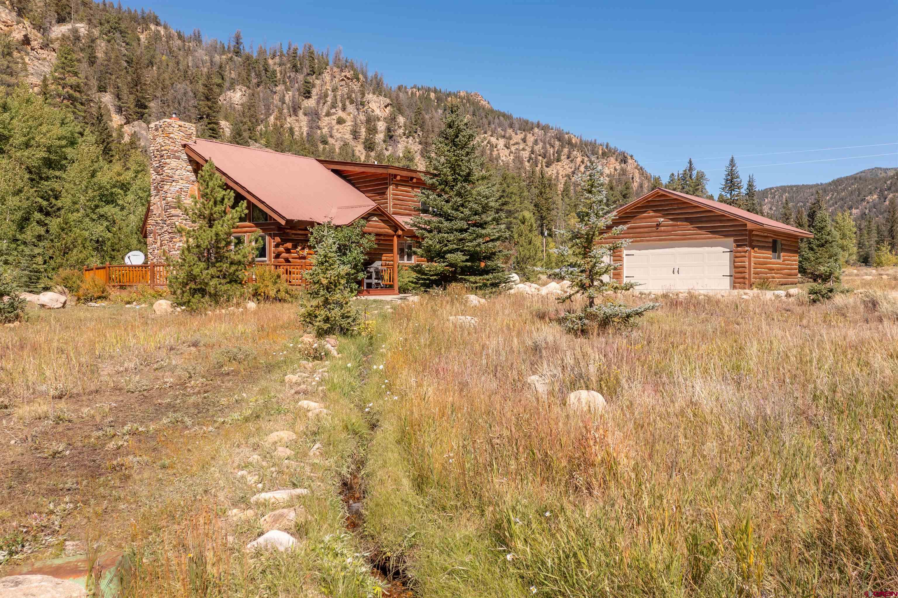 This exquisite log cabin is nestled within the scenic confines of Spring Creek Canyon, perfectly positioned on a sprawling, level lot spanning 0.92 acres adorned with majestic mature Aspen and Pine trees. You'll be captivated by the grandeur of soaring vaulted ceilings, adorned with intricate tongue and groove woodwork, complemented by floor-to-ceiling windows that bathe the interior in natural light. The centerpiece of the living room is a magnificent stone, wood-burning fireplace that adds both warmth and charm. This living space offers breathtaking canyon vistas, making it an ideal spot for relaxation.The kitchen has been beautifully renovated with new appliances, new countertops, new hardware and more plus it seamlessly adjoins the living area, creating a convenient layout for hosting and entertaining. The main floor boasts a generously sized bedroom and a full bathroom, ensuring comfortable living on this level. The bathroom has been updated with new flooring, vanity and countertop, sink, plumbing and a brand new shower surround and toilet. Ascending the stairs, you'll find a lofted landing that not only provides spectacular views but also serves as a versatile space for a home office or play area. Two additional bedrooms and another completely updated full bathroom grace the upper level, with the larger bedroom featuring a spacious closet and two windows framing picturesque canyon panoramas. Outside, a detached two-car garage awaits and has a brand new insulated garage door, complete with ample storage space and a practical workbench. Nature enthusiasts will relish in the abundant wildlife sightings on the property and the opportunity to stargaze from the front deck under the vast night sky. For outdoor adventurers, the location is a dream come true, with direct access to the renowned Doctor's Park trail for mountain biking enthusiasts and hundreds of miles of National Forest just a short distance away. Anglers will appreciate the proximity to the Taylor River, known for its world-class fishing. Spring Creek's strategic locale places it only 30 minutes from both Crested Butte and Gunnison. Notably, the owners have recently installed a brand new boiler, hot water heater, new washer and dryer and fully insulated the crawlspace, ensuring the home's continued comfort and efficiency. They have also stained the exterior and added a large cement pad in the driveway. Included in this offering are rare water rights to the Axtel Ditch for irrigation and it adds incredible ambiance as a babbling brook just off the porch. This residence has been meticulously cared for and is being offered partially furnished, making it an exceptional opportunity to embrace the mountain lifestyle in style and comfort.