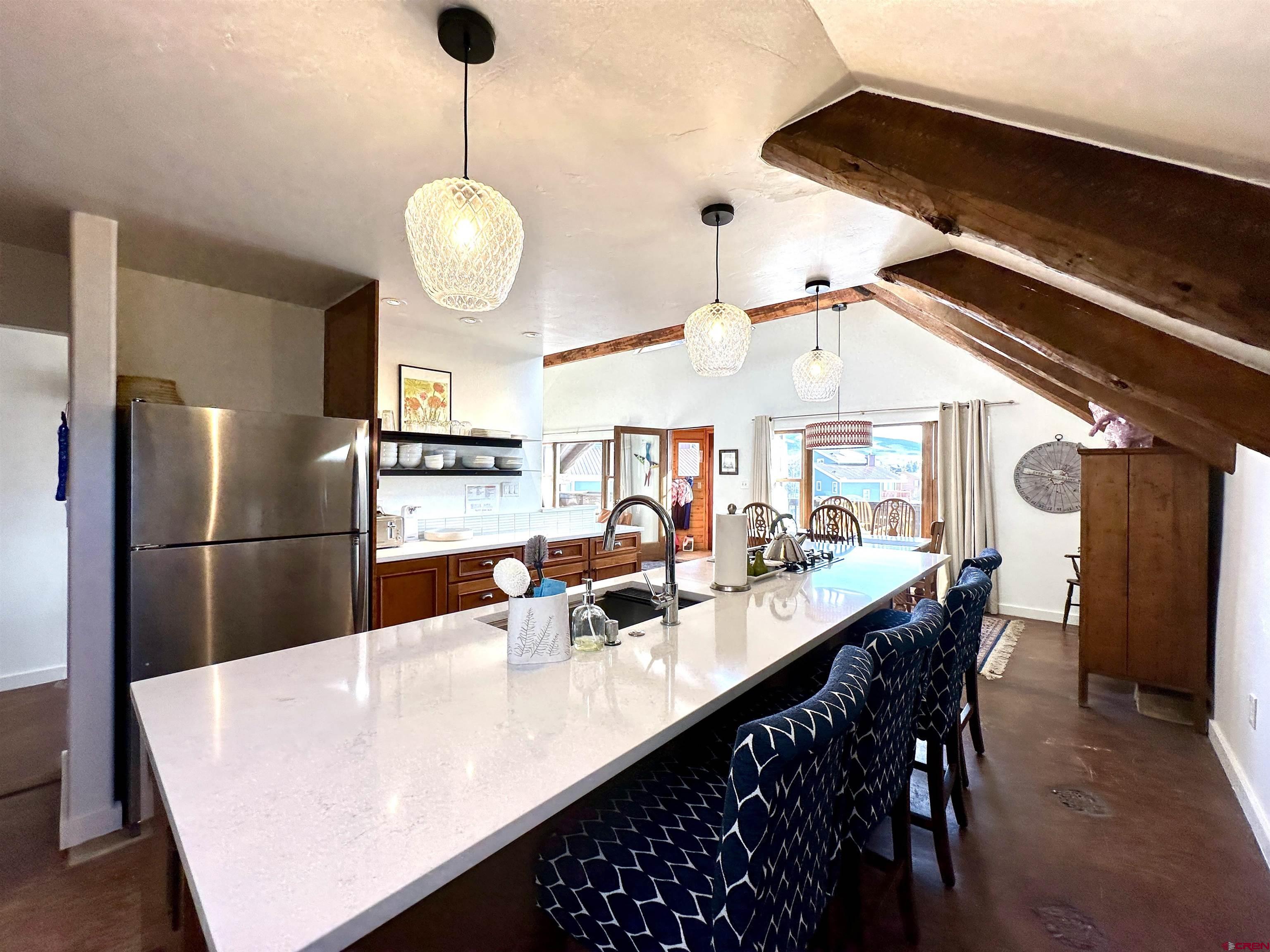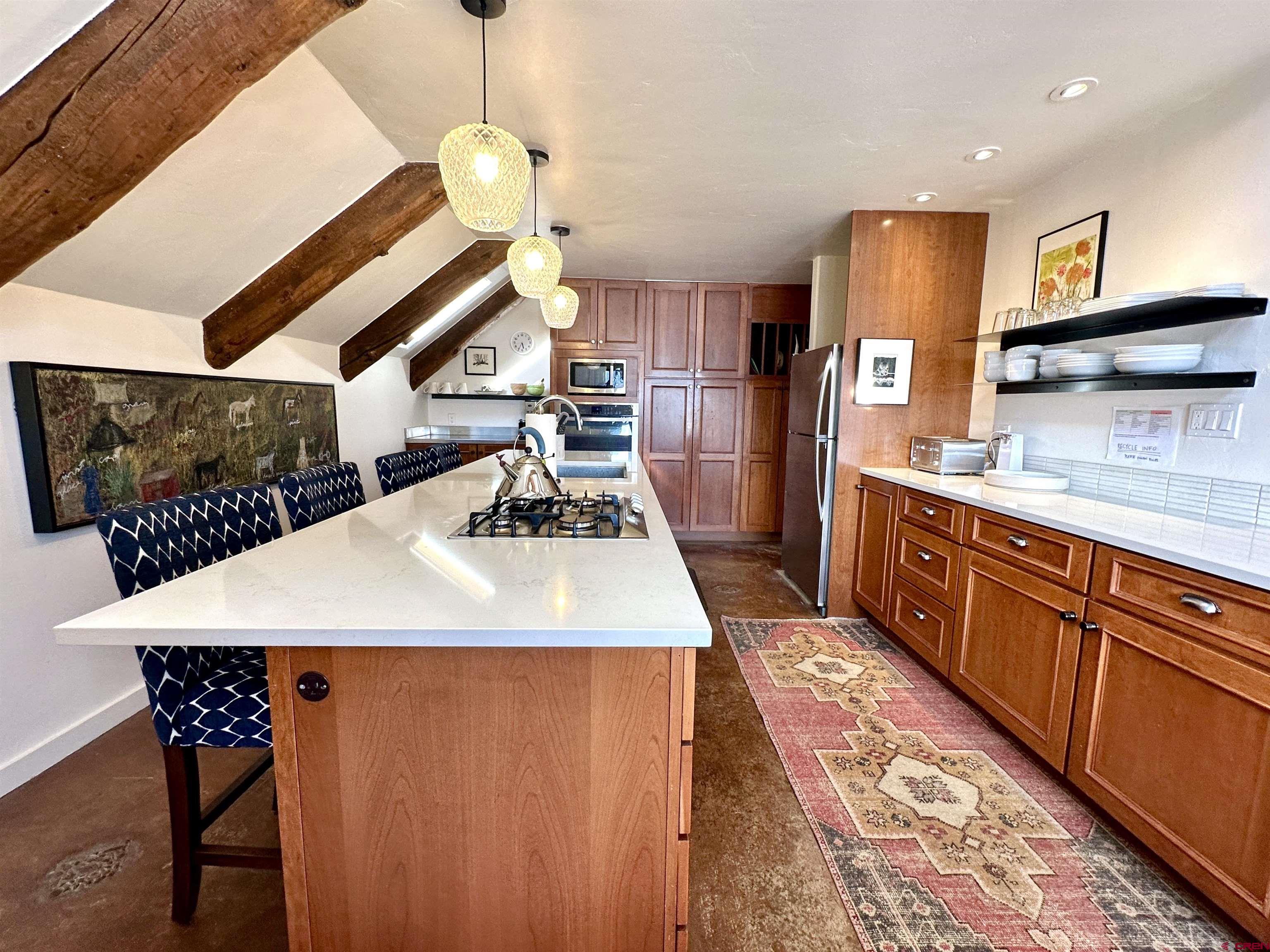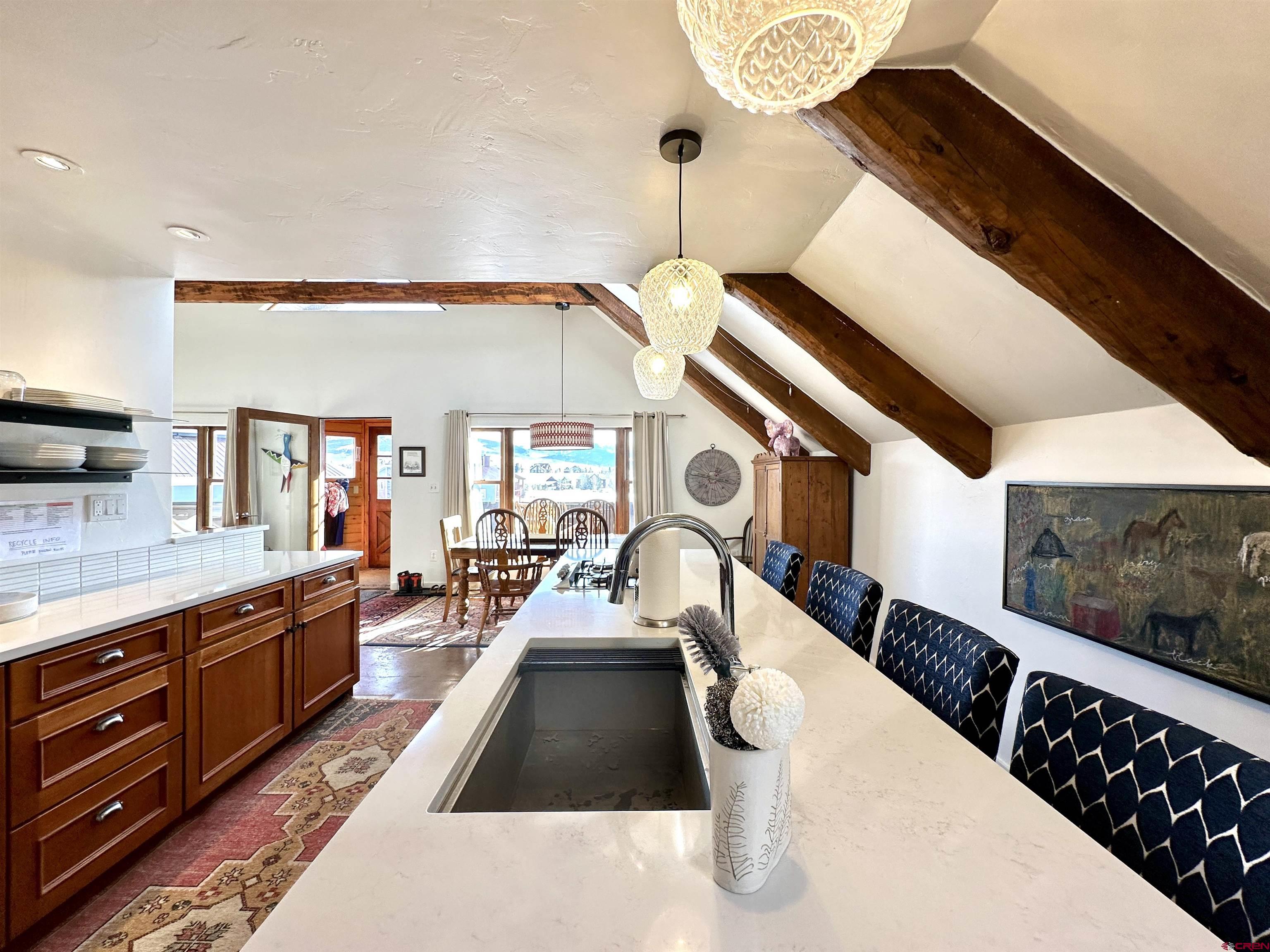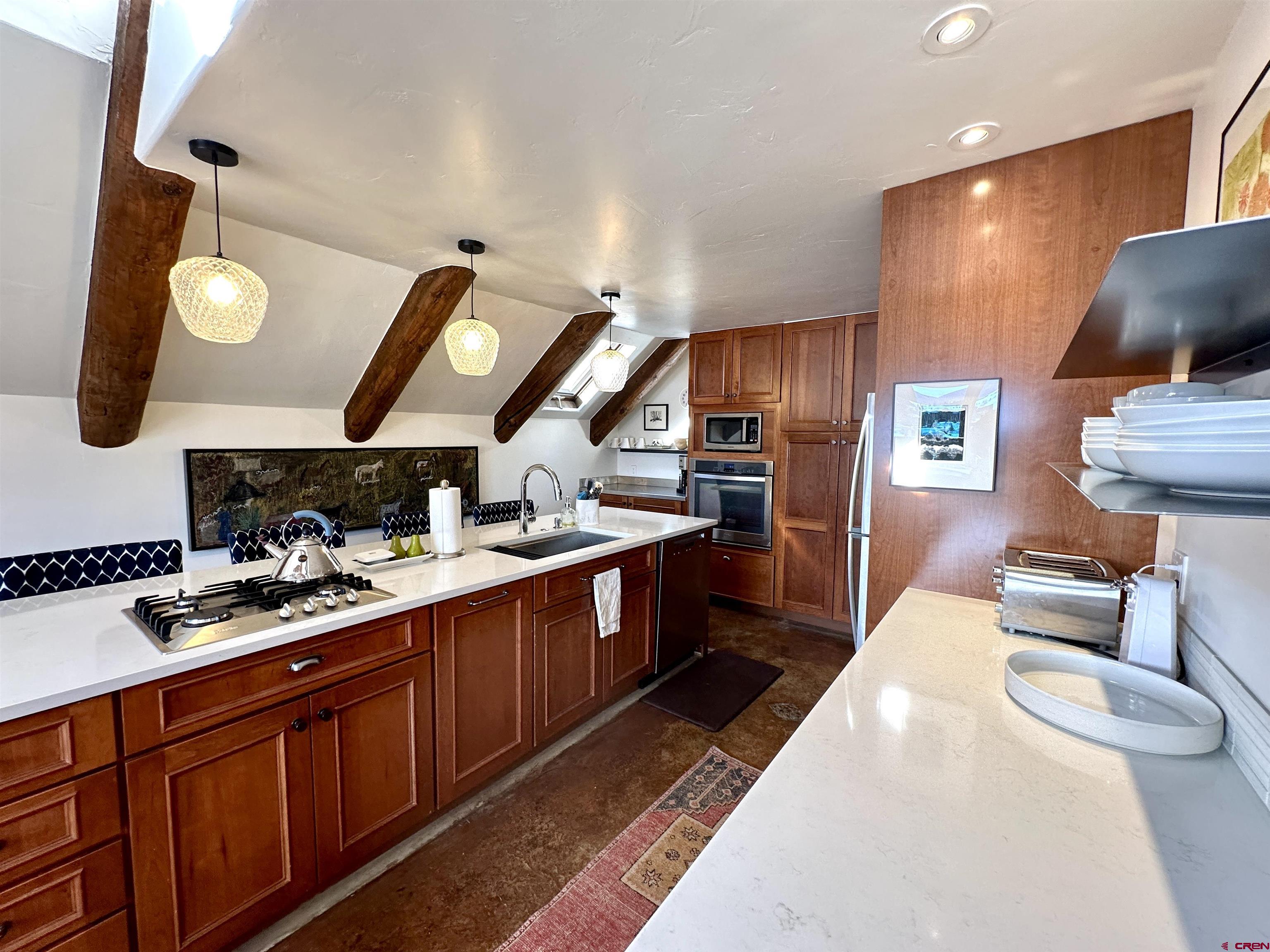 Nestled within the desirable Riverbend neighborhood, a mere stone's throw from the historic downtown of Crested Butte, 92 Aspen Lane, Unit 4B is an exceptional opportunity. This remodeled top-floor unit, featuring 3 bedrooms and 2 bathrooms, offers a blend of mountain elegance and contemporary comfort. Step into this inviting abode, and you'll be greeted by the expansive vaulted ceilings adorned with beautiful wood beams. The efficient gas in-floor heating system ensures warmth underfoot as you traverse the cement floors, creating a cozy ambiance throughout. The unit is strategically positioned as south-facing, allowing an abundance of natural sunlight to flood the space and providing a warm and inviting atmosphere year-round. The heart of this home lies in its spacious kitchen, showcasing cherry cabinets and a convenient island. Upgraded kitchen appliances include the stovetop, oven, dishwasher, and microwave. Fresh paint throughout the condo adds a touch of modernity, while a brand-new washer and dryer offer added convenience. As you enter, the mudroom proves to be a perfect practical addition, providing an excellent space for storing your outdoor gear and keeping your living area tidy. Bask in the awe-inspiring mountain views from the covered balcony, or unwind in the living room with a picturesque sight of Crested Butte Mountain. Perfect for outdoor enthusiasts, the nearby Deli Trail offers year-round adventures from biking in the summer to Nordic skiing in the winter. Enjoy the convenience of a quick 10-minute drive to the world-class skiing of Crested Butte Mountain Resort. Schedule a showing today and make this condo your elevated mountain retreat. Your ideal mountain lifestyle awaits!