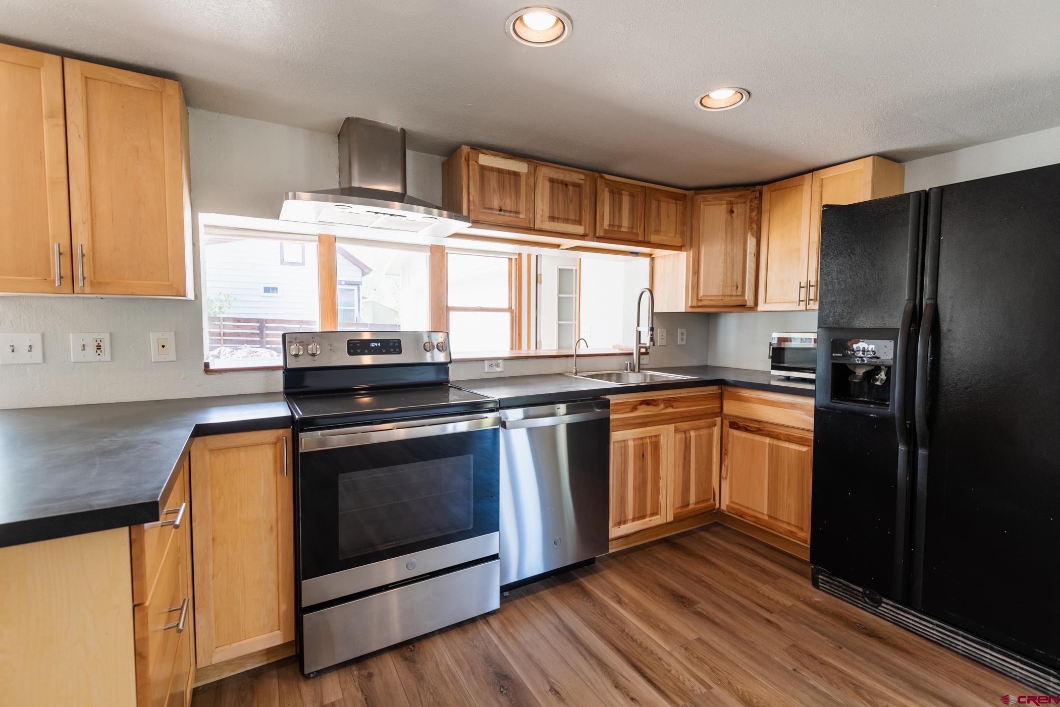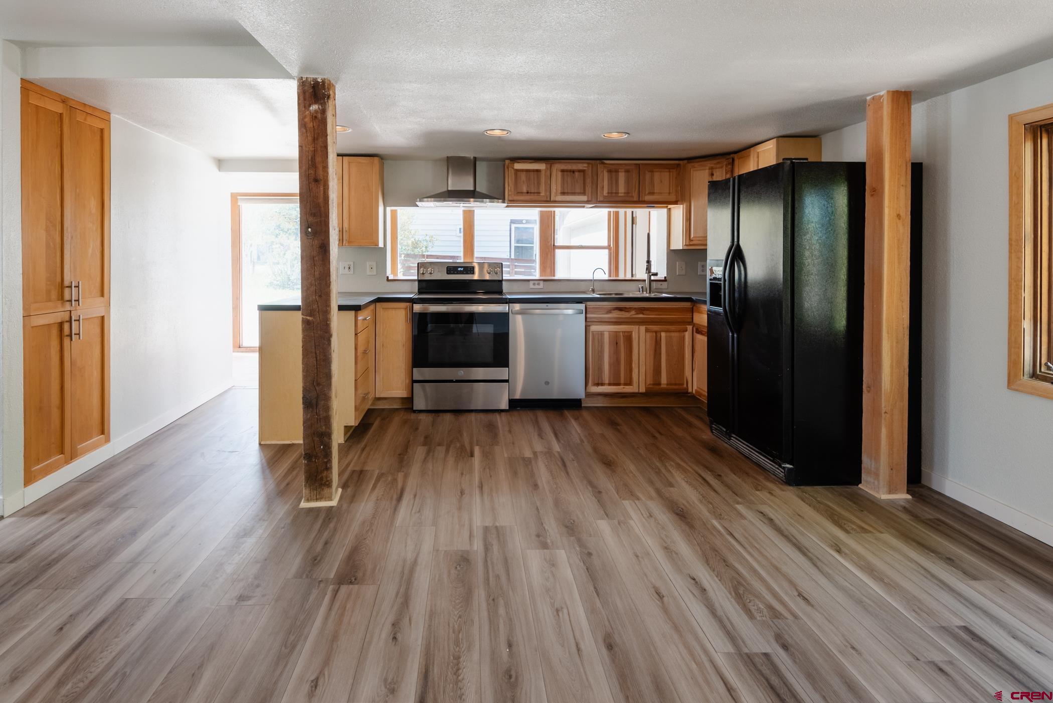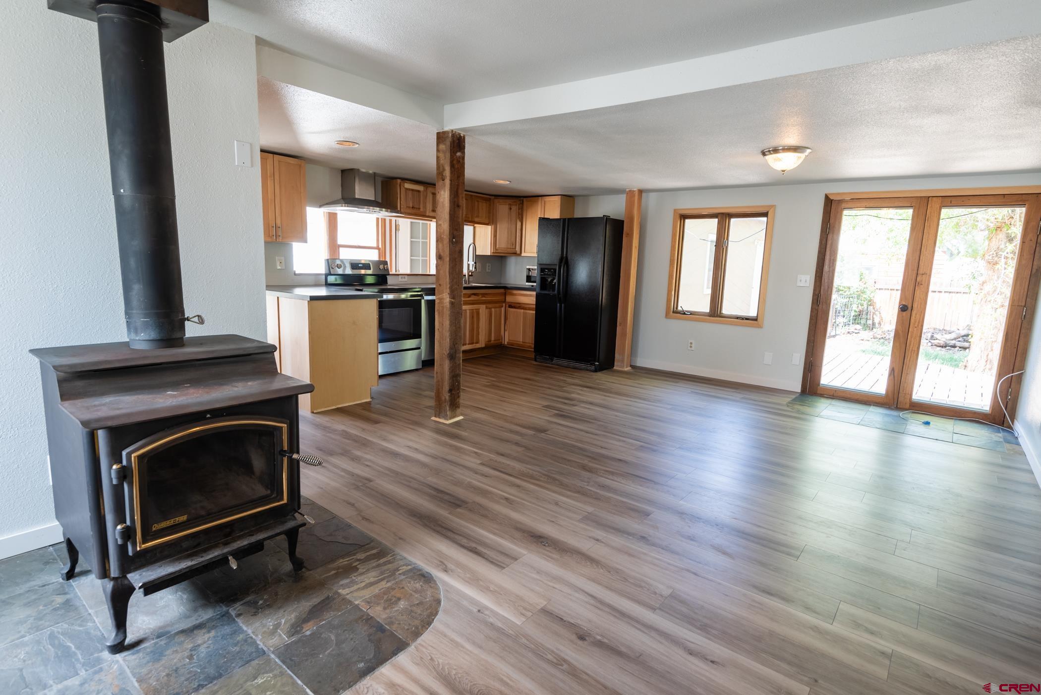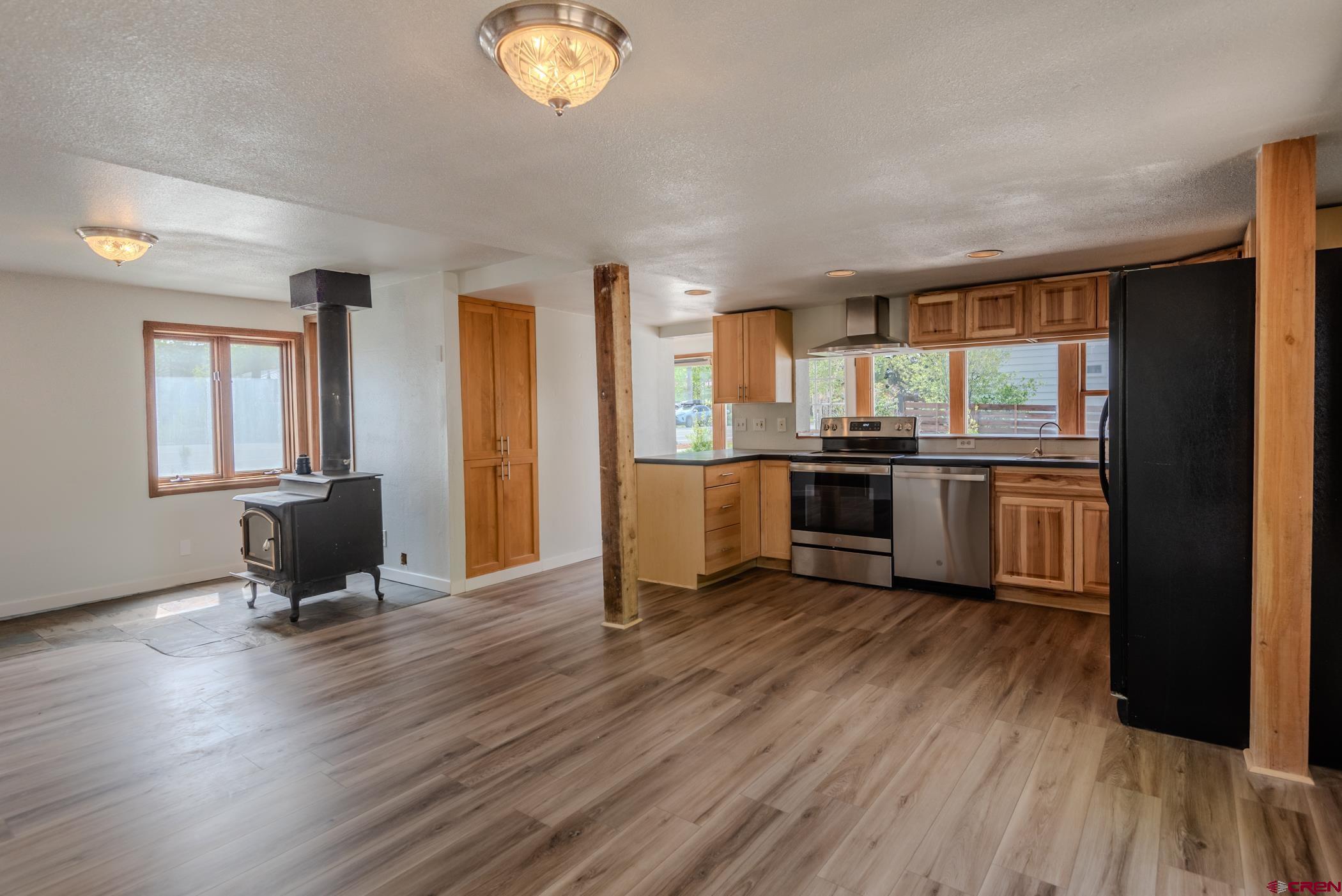 Welcome to 423 N Spruce Street, a wonderful opportunity to own a cozy three-bedroom, one-bath ranch-style home in the heart of Gunnison. This property makes for an ideal investment or a perfect starter home. The home features an inviting open concept living arrangement, highlighted by a charming wood stove in the living room. The entire house boasts new vinyl plank flooring, enhancing its modern appeal and easy maintenance. The kitchen, open to the living area, includes a distinctive wood bar area, perfect for casual dining and entertaining. One of the standout features of this home is the heated, oversized two-car garage, offering 569 square feet of space for vehicles, storage, or even a workshop. The backyard is perfect for barbecues and entertaining during the warmer months, providing a private and comfortable outdoor space. Located just a short walk from downtown, the grocery store, and all Gunnison schools, this property is situated in one of the most convenient locations in town. Don't miss out on the chance to invest in a prime piece of real estate in Gunnison. Contact us today to schedule a viewing and make this charming home yours!