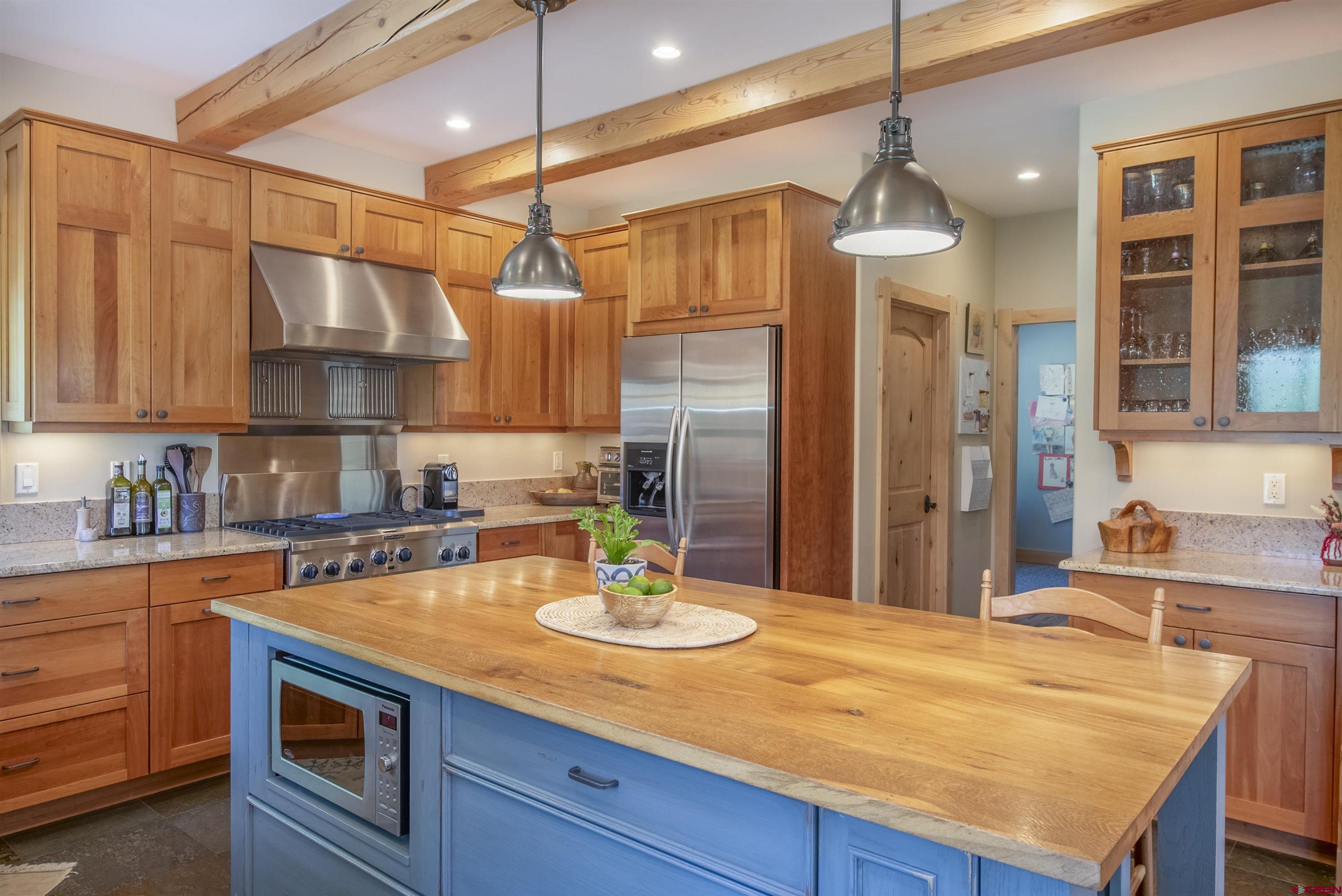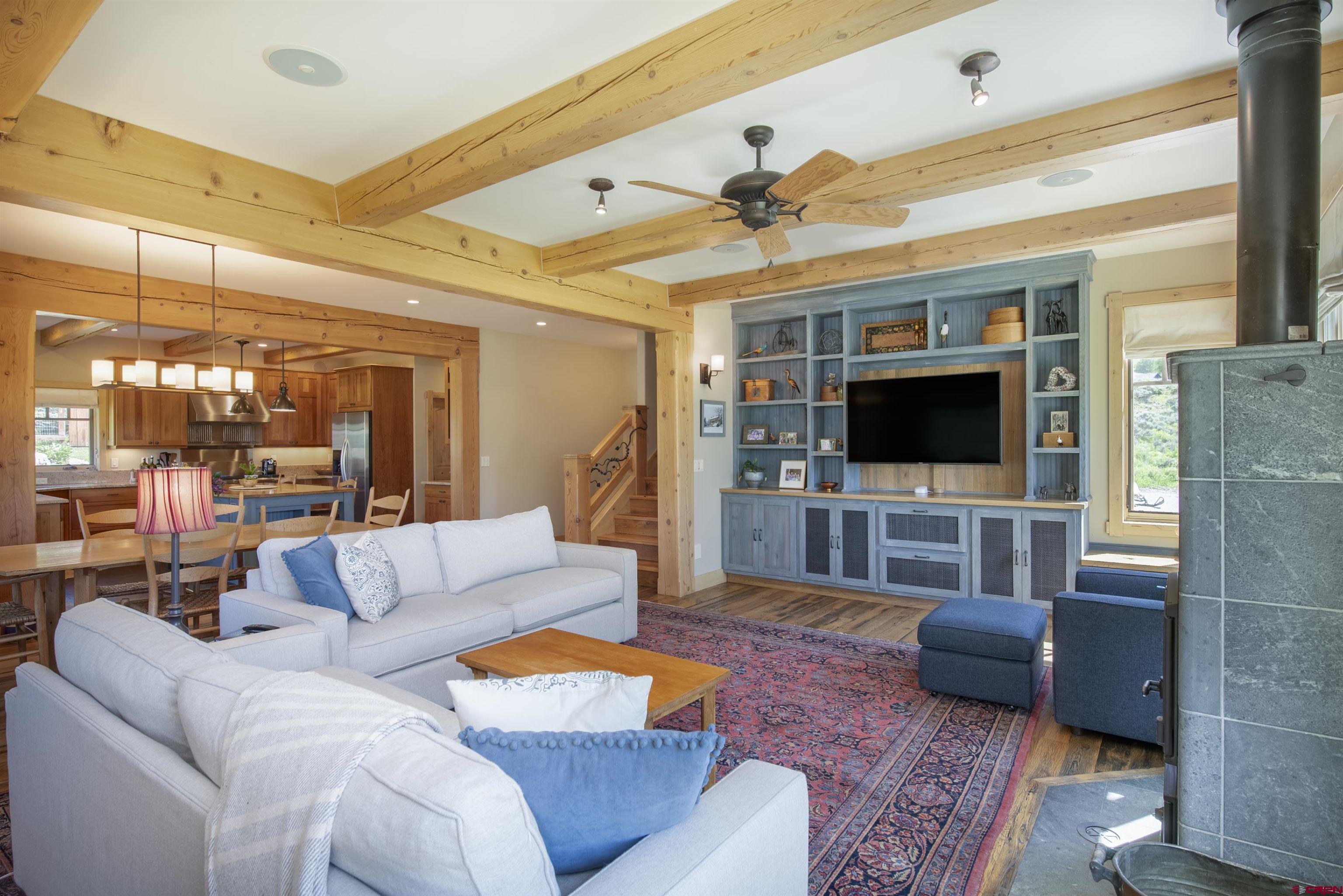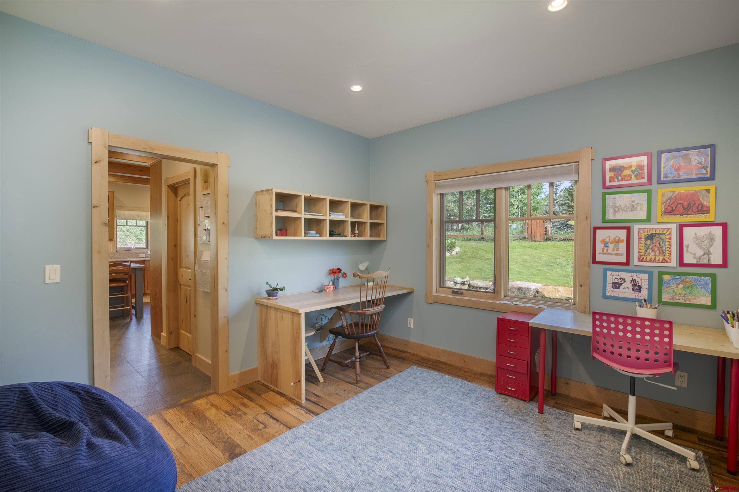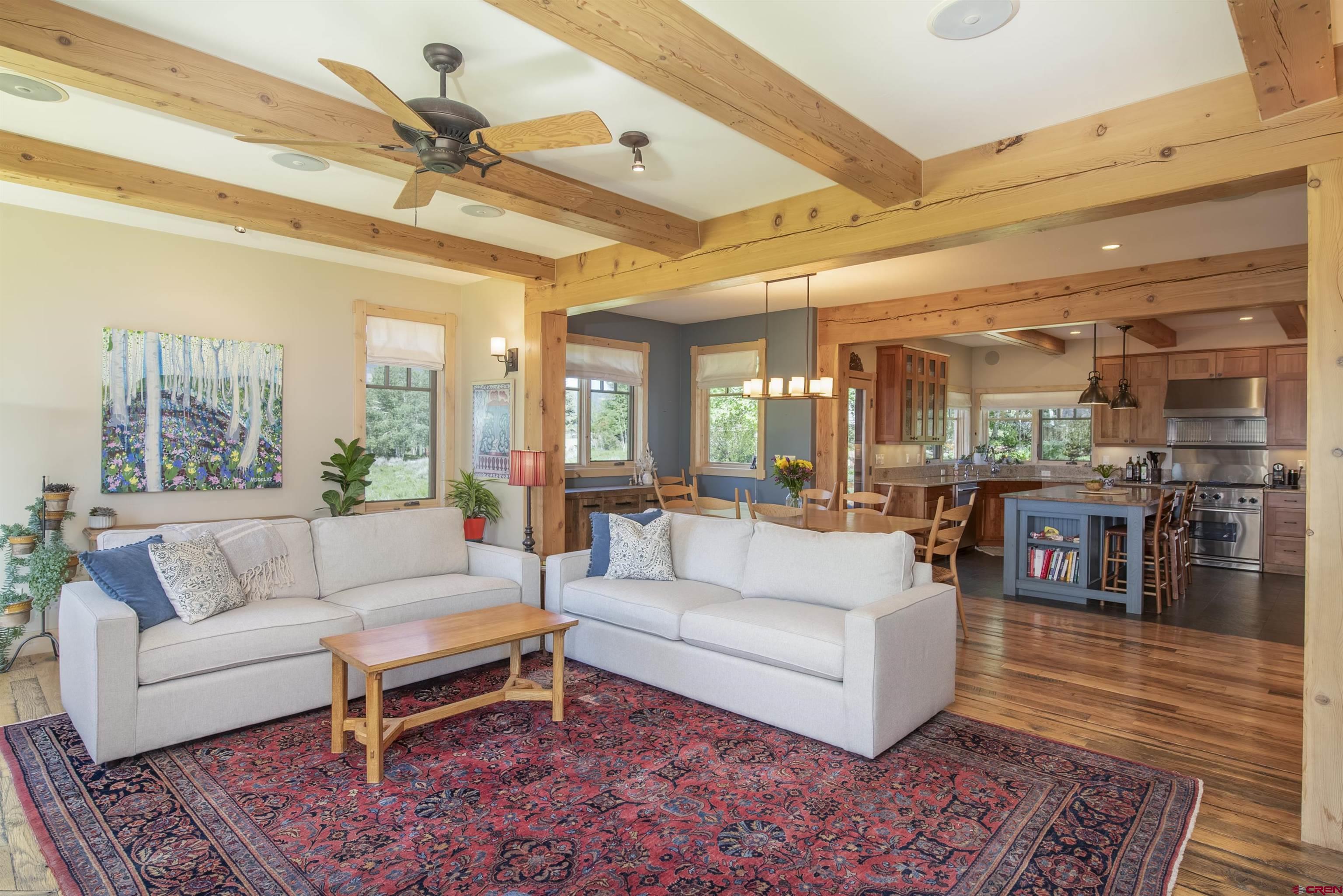 32 BRACKENBURY: This impeccable custom home sits on a large half acre lot and is arguably one of the finest homes in the subdivision. 32 Brackenbury, built by Monsoon Builders, offers high end finishes with incredible attention to detail and all the extras of a custom home. Situated on a coveted and quiet street, this home provides privacy and convenience. The beautiful and mature landscaping includes huge trees and perennial flower beds which surround the large lawn, patio and fire pit. This meticulously maintained home boasts extensive Douglas Fir beams, trim and doors, as well as antique oak reclaimed wood floors. Custom built ins and Iron work from local artisan, Get Bent Ironworks, are found throughout the home. This 5 bedroom, 4 bath home is one of the largest in the subdivision with plenty of room for the family as well as guests. The open floor plan on the main floor has 9 ft ceilings and connects the kitchen and living spaces and is graced by the wide staircase with custom ironwork rails. The main staircase rises to 2 bedrooms, a spacious laundry room, storage closet, full bathroom and the primary bedroom suite. The primary bedroom offers 2 large walk-in closets, and travertine tiled bathroom complete with a soaking tub and large shower. The vaulted ceilings throughout the second story offer volume and views of the yard and surrounding peaks. This spacious home, at 3576 sq ft, includes a separate stairway accessing a guest bedroom, bathroom and additional large living space with a bonus loft or 5th bedroom. The efficient, solid soapstone “Tulikivi” wood stove in the main living space provides warmth and ambiance, as it radiates heat for up to 24 hours. The Interni Design Studio’s custom kitchen is complete with rustic cherry cabinets, a large island, stainless appliances, including new microwave and dishwasher. The 36” Kitchen Aid range has 4 burners with a grill. Additional extras include an office, a large den or TV bonus room on the main floor, storage shed, central vac and an oversized 2 car, 672 sq ft garage. Offered well below replacement value and in meticulous condition, this home will not last long.
