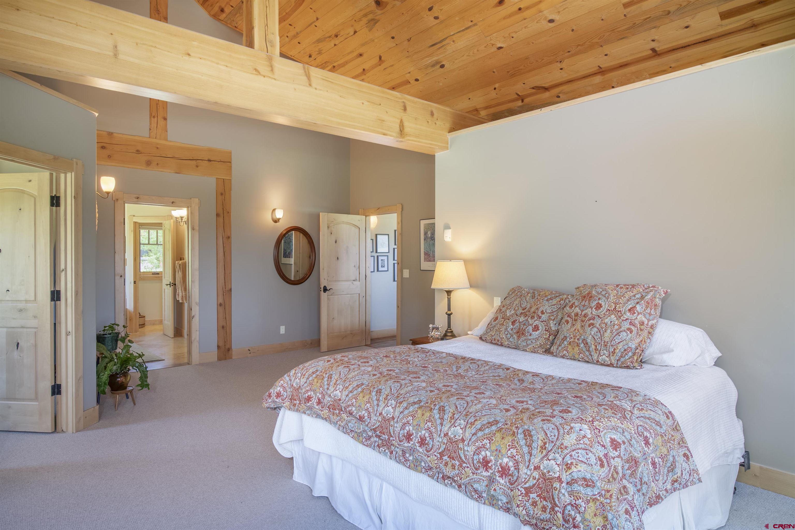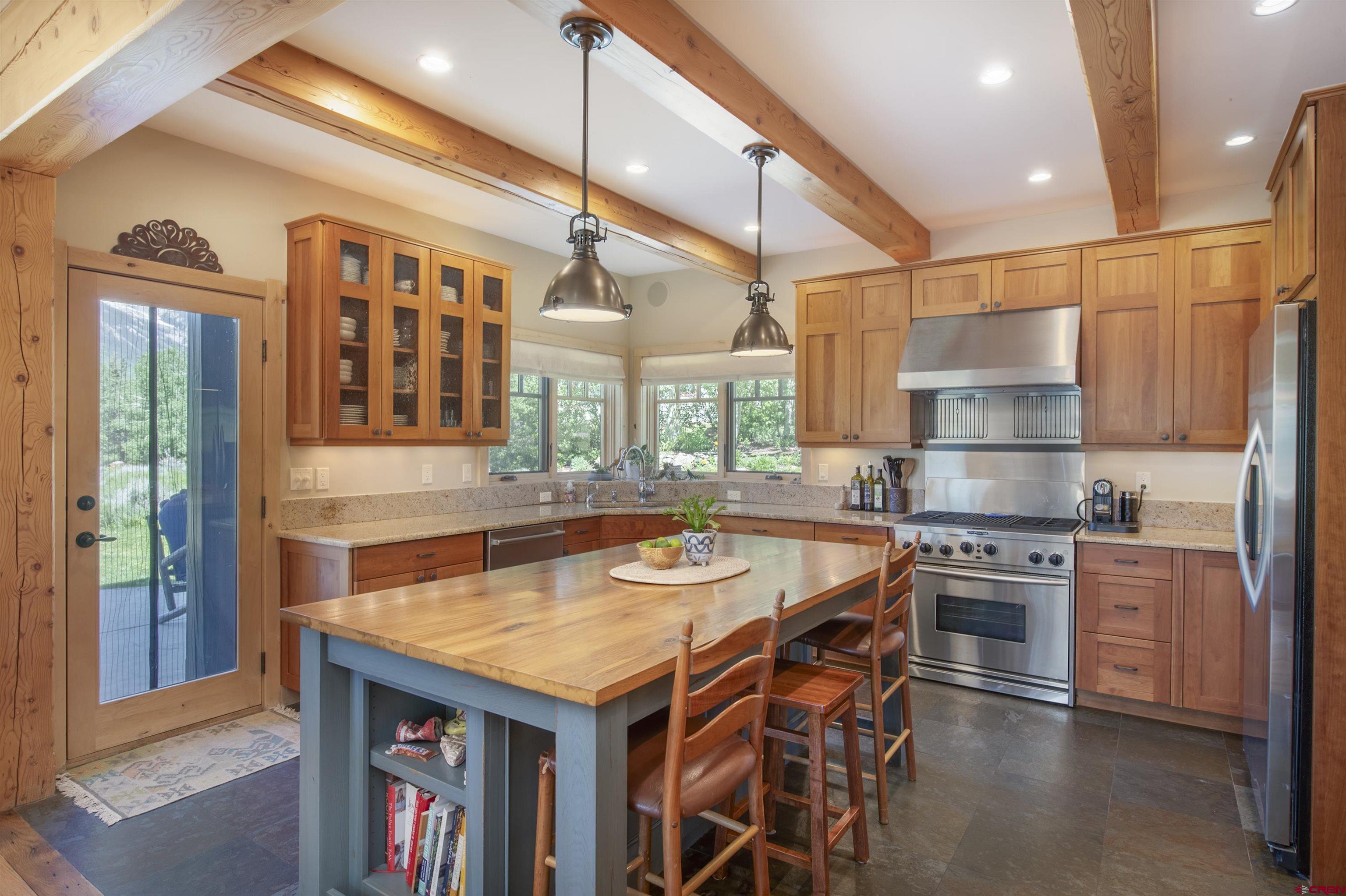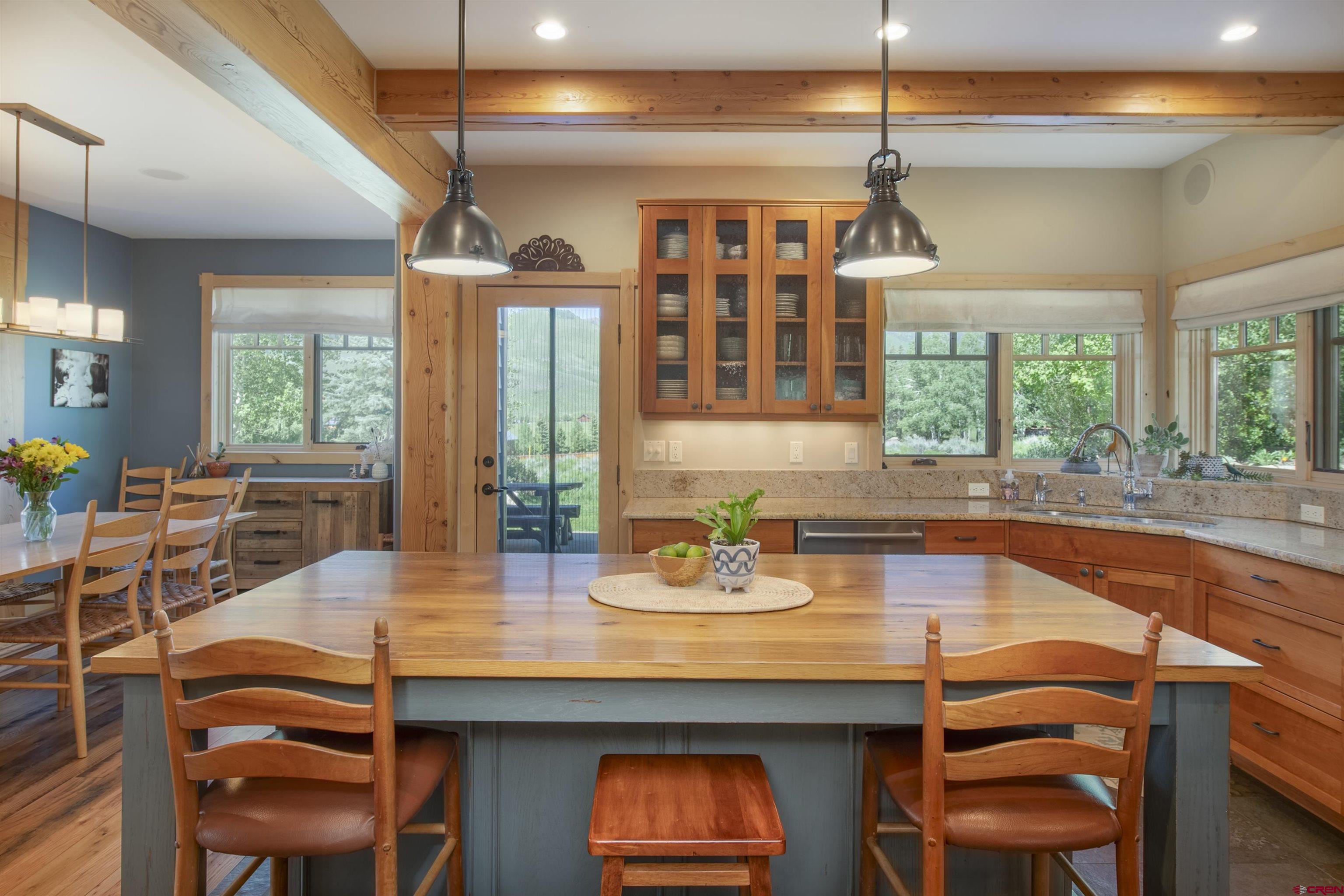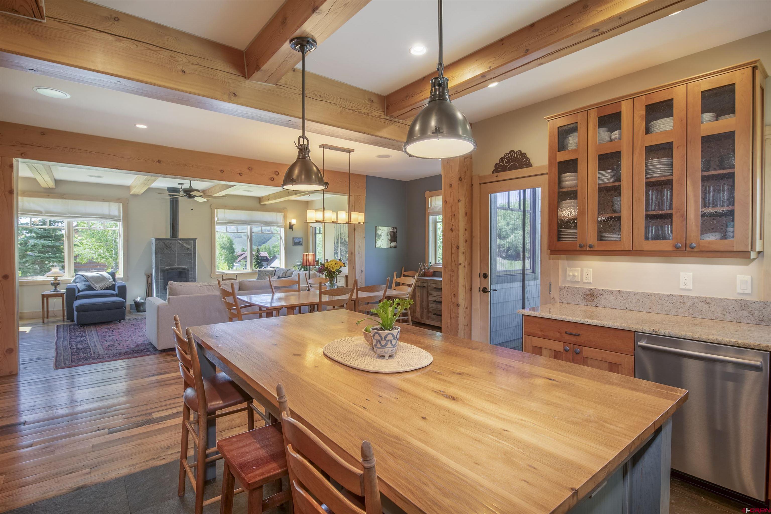 32 BRACKENBURY: This impeccable custom home sits on a large half acre lot and is arguably one of the finest homes in the subdivision. 32 Brackenbury, built by Monsoon Builders, offers high end finishes with incredible attention to detail and all the extras of a custom home. Situated on a coveted and quiet street, this home provides privacy and convenience. The beautiful and mature landscaping includes huge trees and perennial flower beds which surround the large lawn, patio and fire pit. This meticulously maintained home boasts extensive Douglas Fir beams, trim and doors, as well as antique oak reclaimed wood floors. Custom built ins and Iron work from local artisan, Get Bent Ironworks, are found throughout the home. This 5 bedroom, 4 bath home is one of the largest in the subdivision with plenty of room for the family as well as guests. The open floor plan on the main floor has 9 ft ceilings and connects the kitchen and living spaces and is graced by the wide staircase with custom ironwork rails. The main staircase rises to 2 bedrooms, a spacious laundry room, storage closet, full bathroom and the primary bedroom suite. The primary bedroom offers 2 large walk-in closets, and travertine tiled bathroom complete with a soaking tub and large shower. The vaulted ceilings throughout the second story offer volume and views of the yard and surrounding peaks. This spacious home, at 3576 sq ft, includes a separate stairway accessing a guest bedroom, bathroom and additional large living space with a bonus loft or 5th bedroom. The efficient, solid soapstone “Tulikivi” wood stove in the main living space provides warmth and ambiance, as it radiates heat for up to 24 hours. The Interni Design Studio’s custom kitchen is complete with rustic cherry cabinets, a large island, stainless appliances, including new microwave and dishwasher. The 36” Kitchen Aid range has 4 burners with a grill. Additional extras include an office, a large den or TV bonus room on the main floor, storage shed, central vac and an oversized 2 car, 672 sq ft garage. Offered well below replacement value and in meticulous condition, this home will not last long.