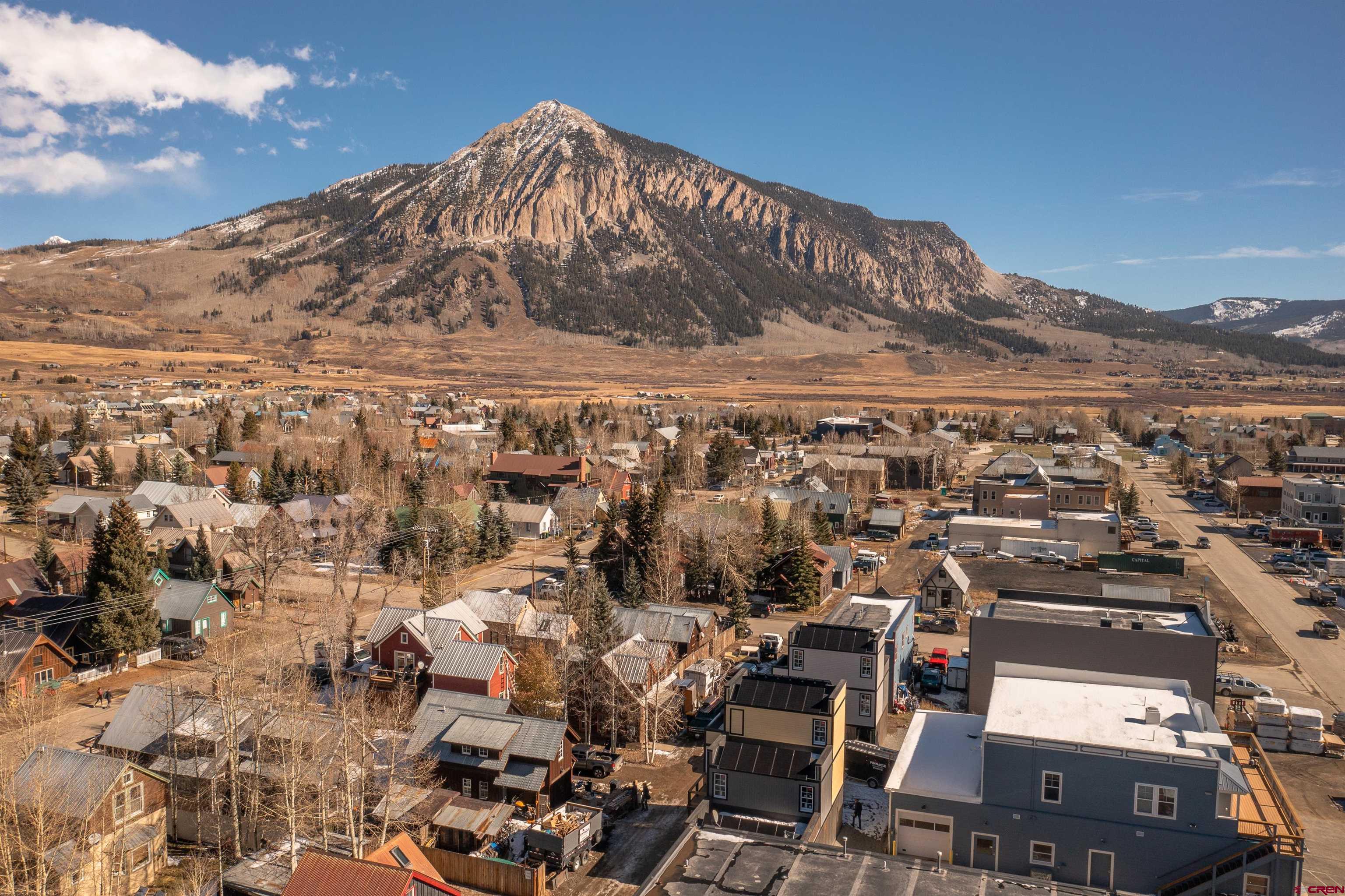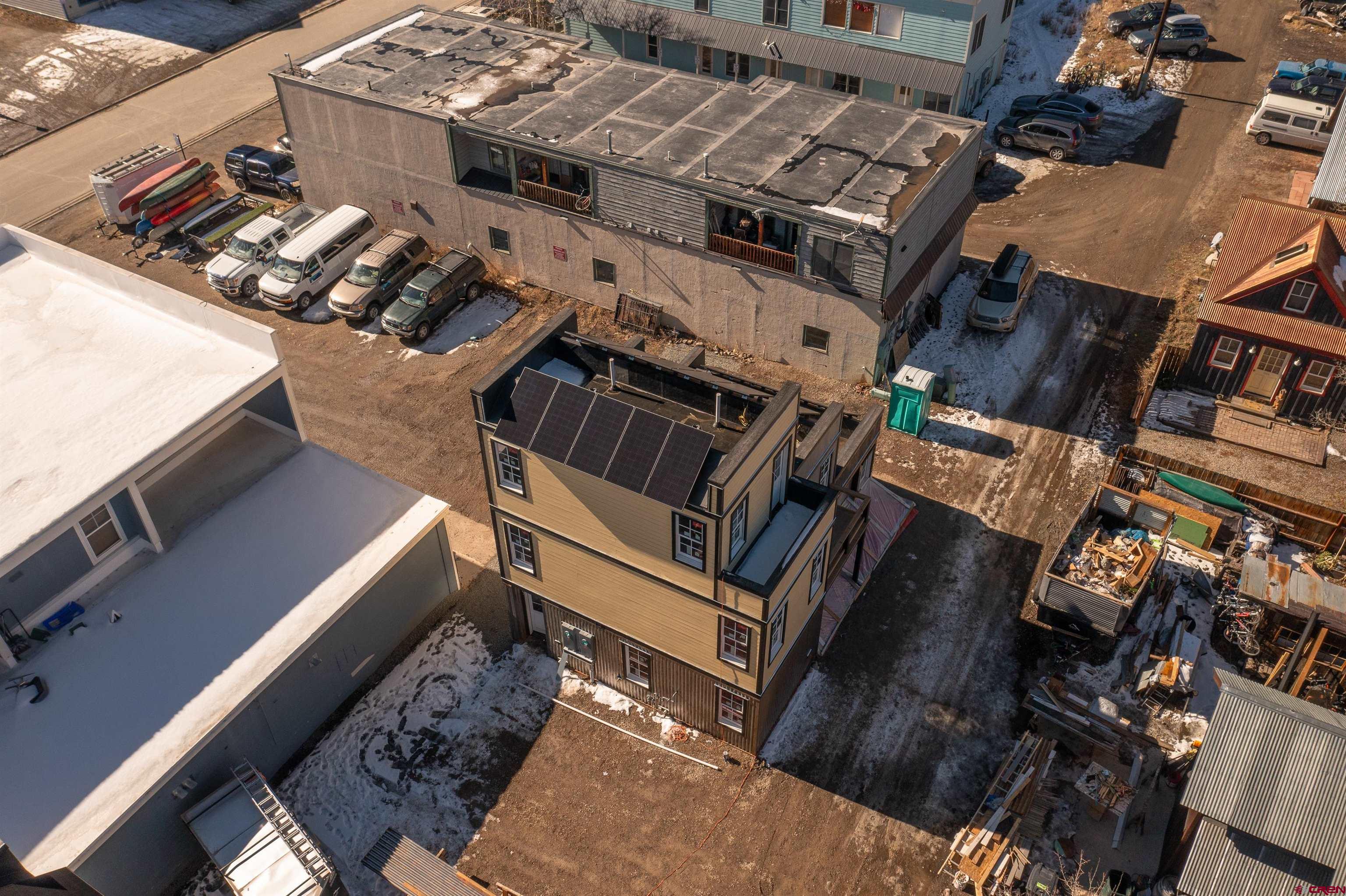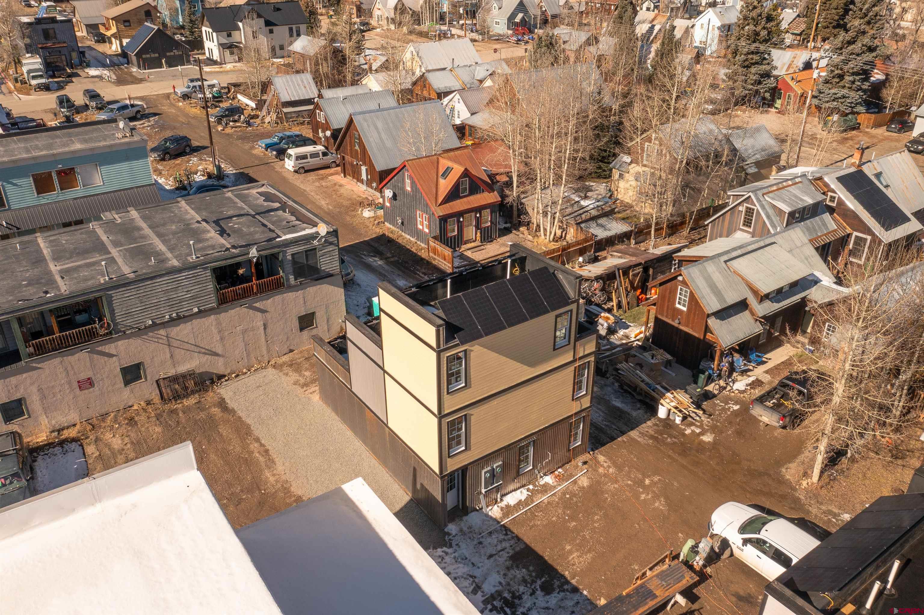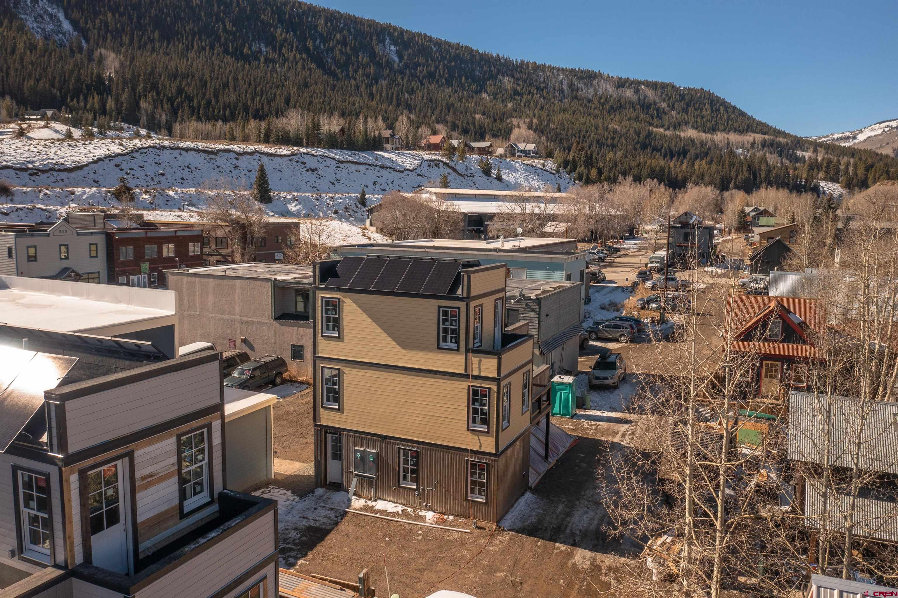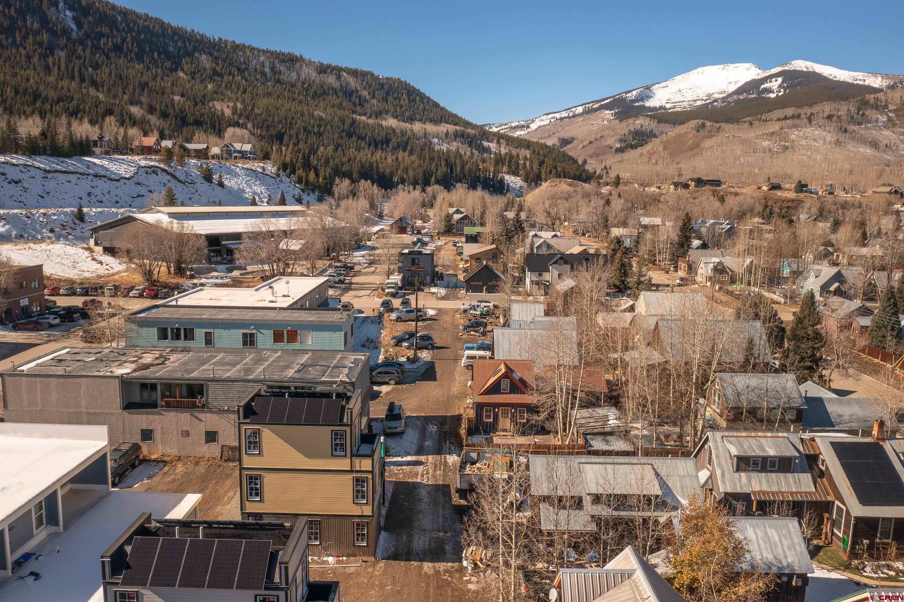 Brand new mixed use building nestled in the heart of Crested Butte. Located in the alley between Whiterock and Belleview. This property offers a unique blend of privacy and convenience with the ability to live upstairs and also operate your own business out of one or all of the ground level commercial spaces. The 1,534 sq ft space is thoughtfully designed across three levels. On the second and third floors you find two beautifully appointed bedrooms each with a private bathroom. The second level also features the perfect kitchen for small living and a quant and cozy living space. Enjoy the wonderful views off every balcony. The ground floor presents three commercial spaces each with private access. Two of the spaces have garage doors and one with a bathroom. A third small space is situated on the back end of the building. Solar panels maximize energy efficiency, while four dedicated parking spots and an electric car outlet cater to modern needs. Whether you choose to live upstairs and operate downstairs or rent out each space individually, this property promises multiple avenues for the convenience of in town living and entrepreneurial endeavors.