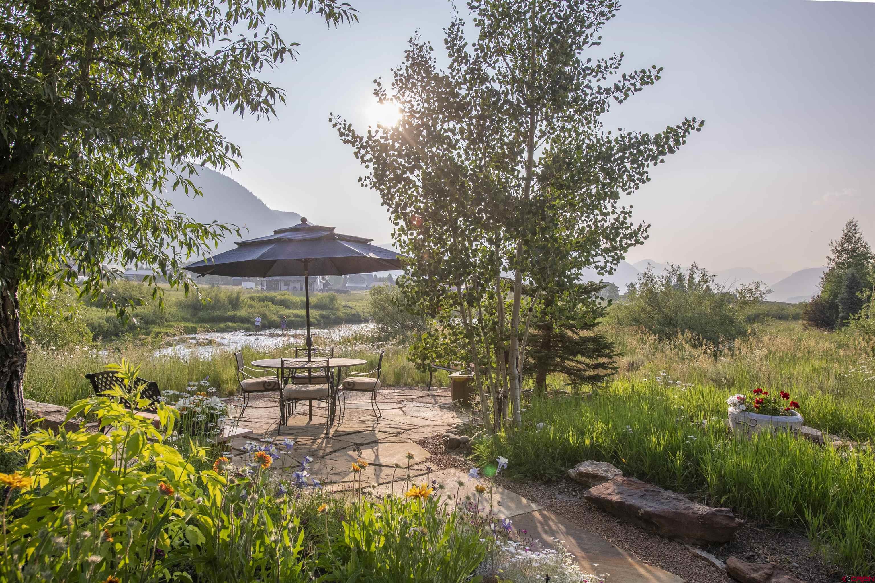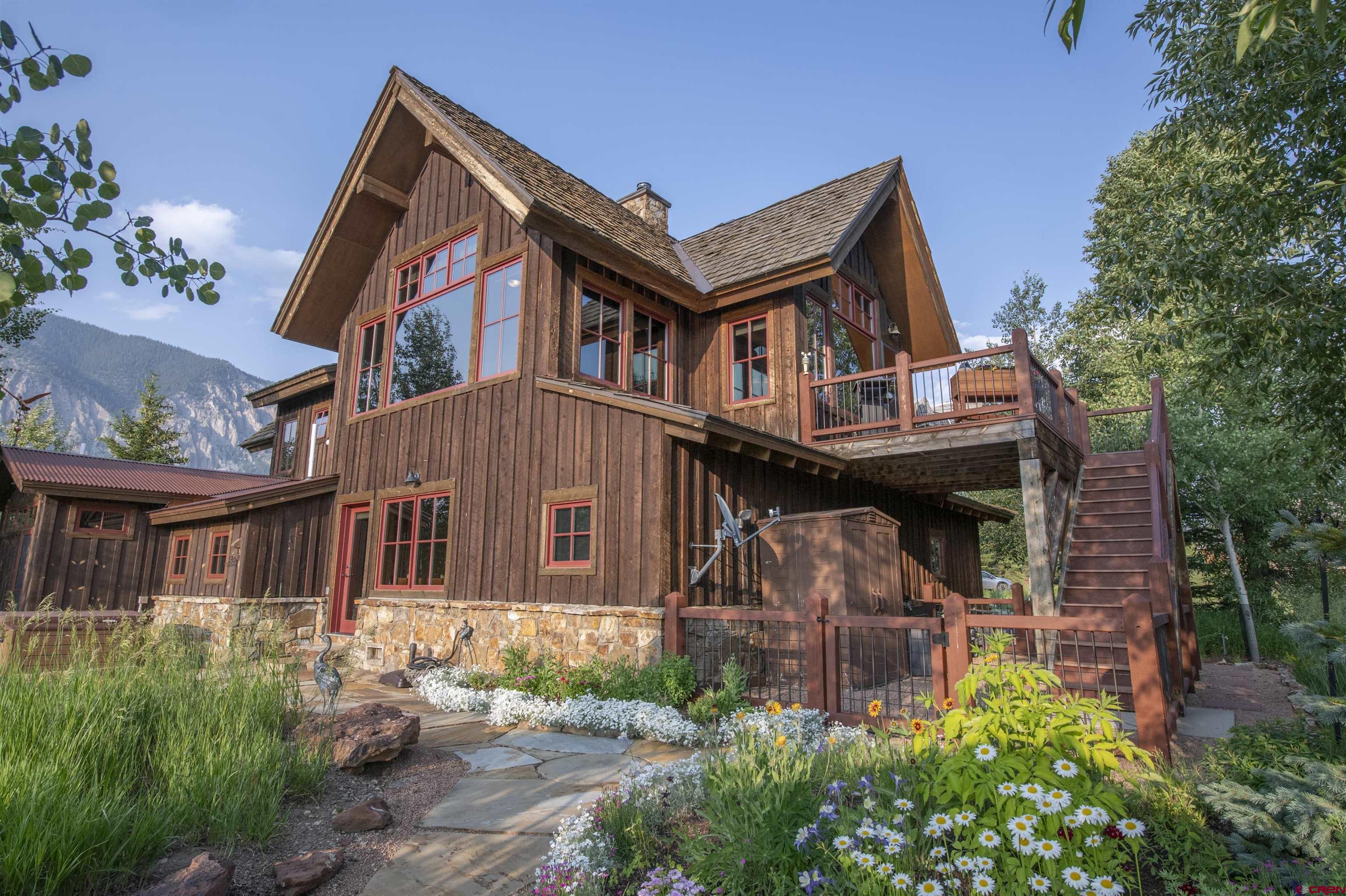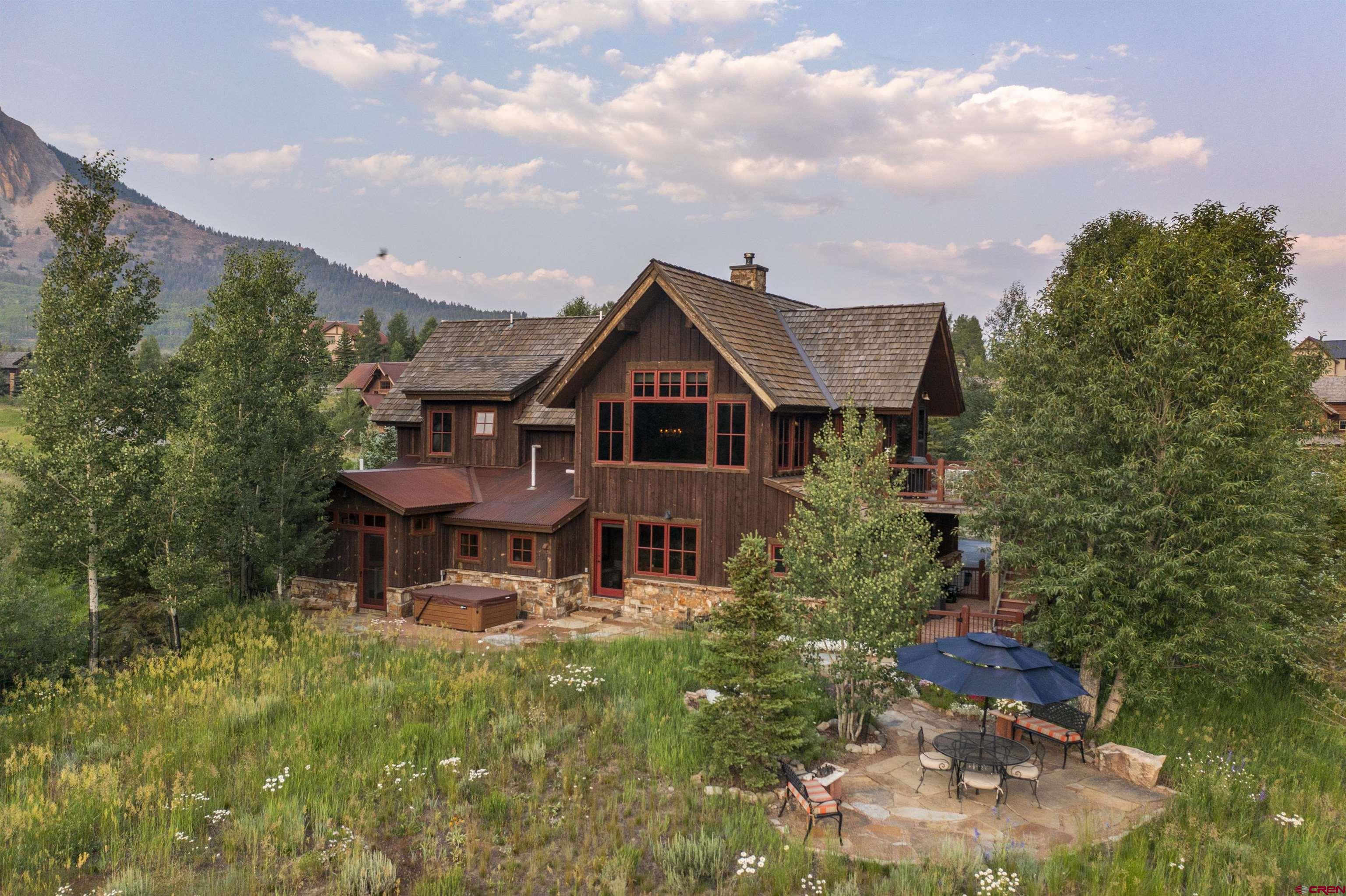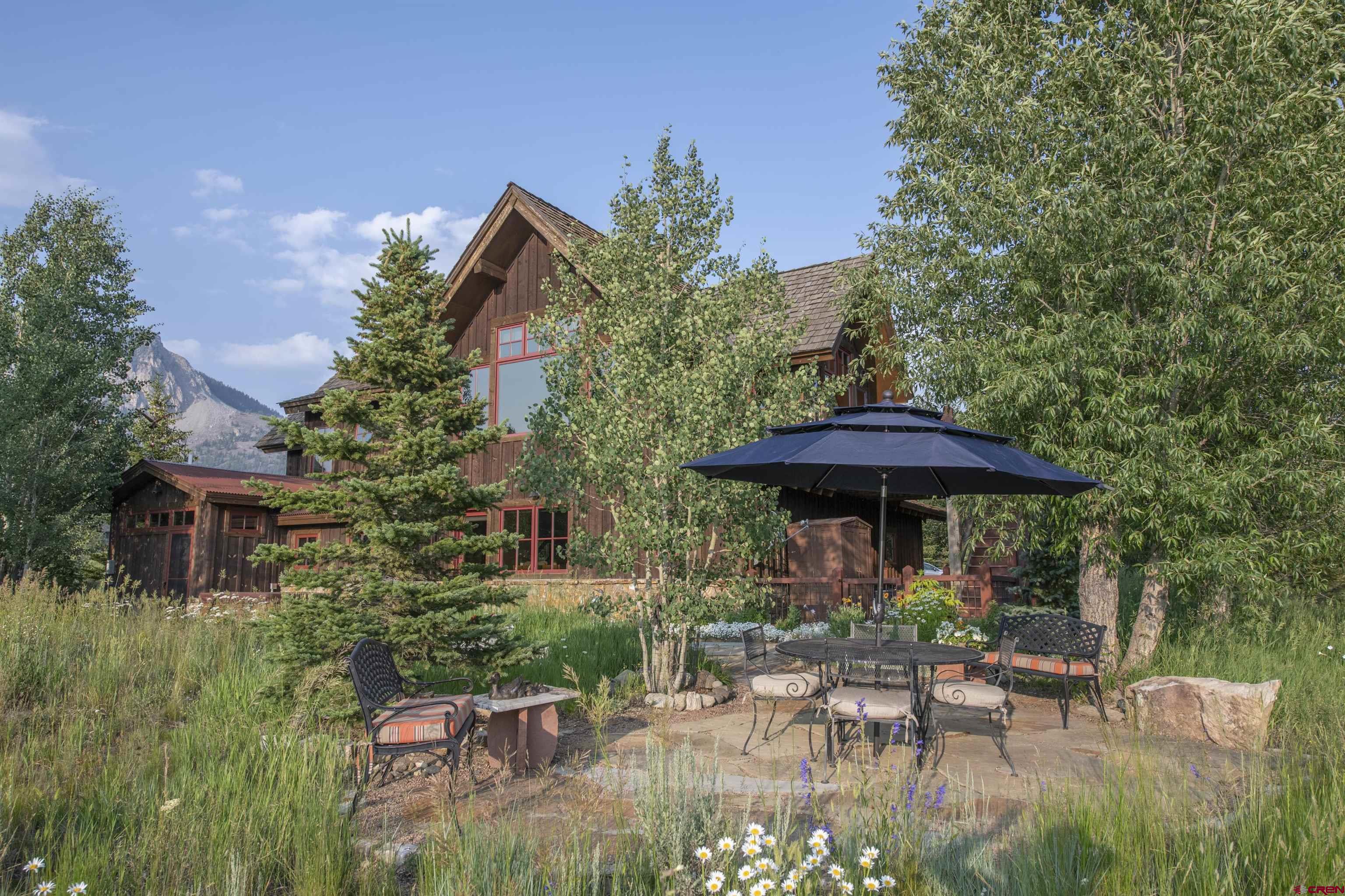 Welcome to this quintessential Skyland home, located on the Slate River. Situated on one of the most expansive areas of Skyland, the wide-open views to the north of Mt. Crested Butte, Gothic Mountain, Mt. Emmons, and Paradise Divide will be yours to enjoy forever. The home was meticulously designed to frame views of these mountains as well as Whetstone Mountain from all spaces in this well thought out mountain retreat. Set amongst mature aspens with ample outdoor space and private patios, this stunning four bedroom, three and one-half bathroom residence offers unparalleled tranquility with direct river access, a front row seat to wildlife, and plenty of space to entertain family and friends. The main level features three spacious bedrooms, one currently utilized as a home office and another as an art studio. Both rooms provide direct access to a private patio with a hot tub perfect for relaxing with the sounds of the Slate River just steps away. Additionally, the main floor includes one full and one 3/4 bathroom as well as a laundry room. The second level offers a large, vaulted open-concept living, dining, and kitchen area designed for both comfort, views, and entertainment. Large windows bring the breathtaking river and mountain views into this inviting space, while the thoughtful kitchen layout works well for many purposes. The generously sized primary suite enjoys an expansive view of Mt. Crested Butte plus a full ensuite bathroom with a soaking tub. Enjoy BBQs and dining al fresco on the large balcony overlooking the beautifully landscaped grounds along the Slate River. The property is enveloped by trees and beautifully maintained flower gardens that were carefully crafted over several years, creating a private oasis that enhances the natural beauty of this exceptional home and will be enjoyed for generations to come. One can easily find peace here with the abundant sounds of nature. The highly sought after Skyland neighborhood is the only country club neighborhood in Crested Butte. The neighborhood houses the immaculately maintained Club at Crested Butte, a members-only country club which boasts the challenging 18-hole Trent Jones Jr. designed golf course, indoor pool, fitness facilities, pro shop, and fine dining, all within the confines of the Skyland neighborhood. In addition to the country club, Skyland features Lake Grant, a non-motorized recreational lake with a pavilion, a walking trail, and access to multiple hiking and biking trails. Skyland is near the Town of Crested Butte (2-minute drive or 10-minute bike ride), the Crested Butte Mountain Resort, and national forest. This majestic setting will provide memories to cherish for years to come. We invite you to compare this property to similar opportunities in other resorts as well as the Crested Butte area. Embrace the tranquility and elegance of riverside living in the highly desirable Skyland subdivision of Crested Butte. For those looking for the very best, this mountain home will be a timeless and prized possession for years to come. This rare opportunity is not one to be missed!