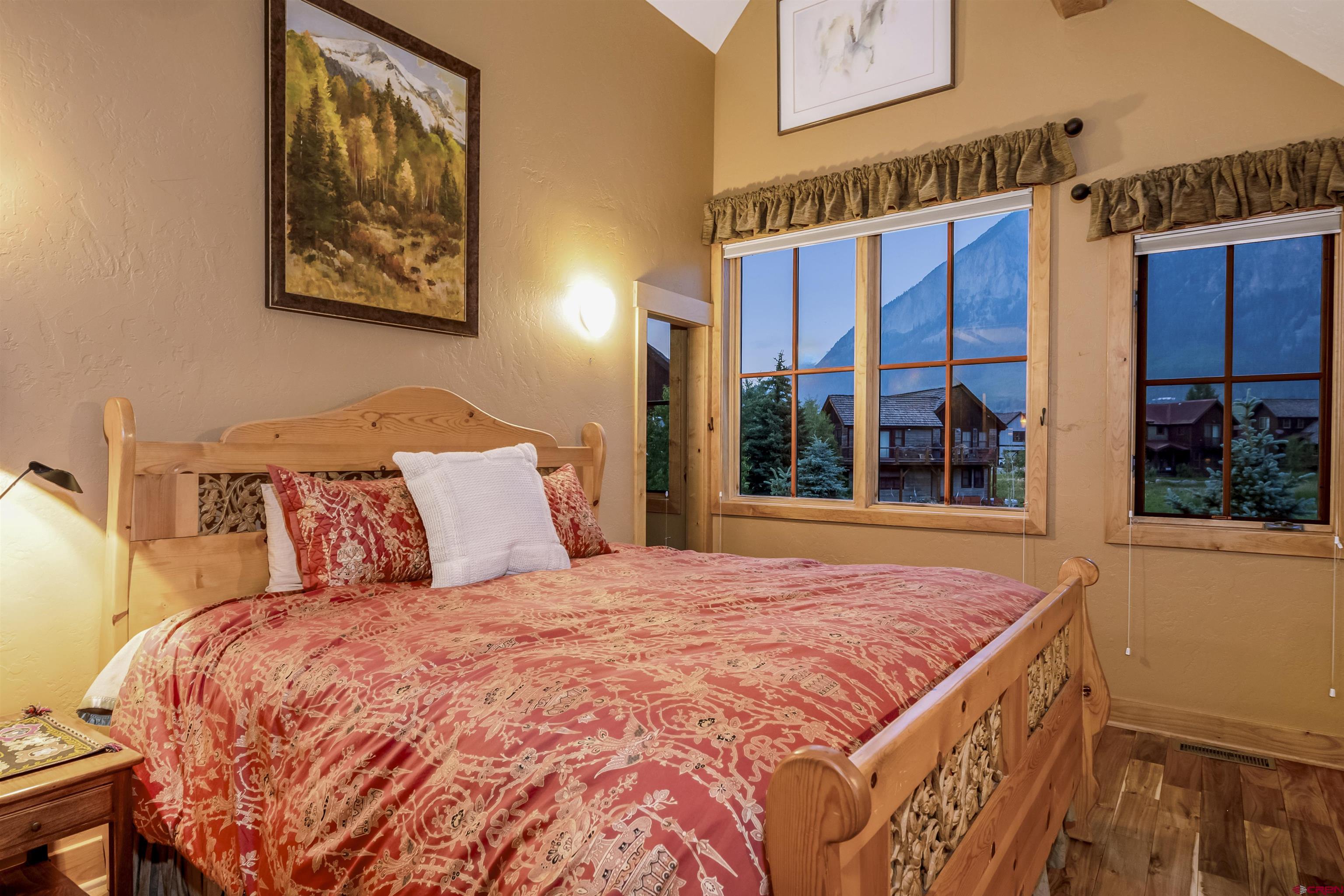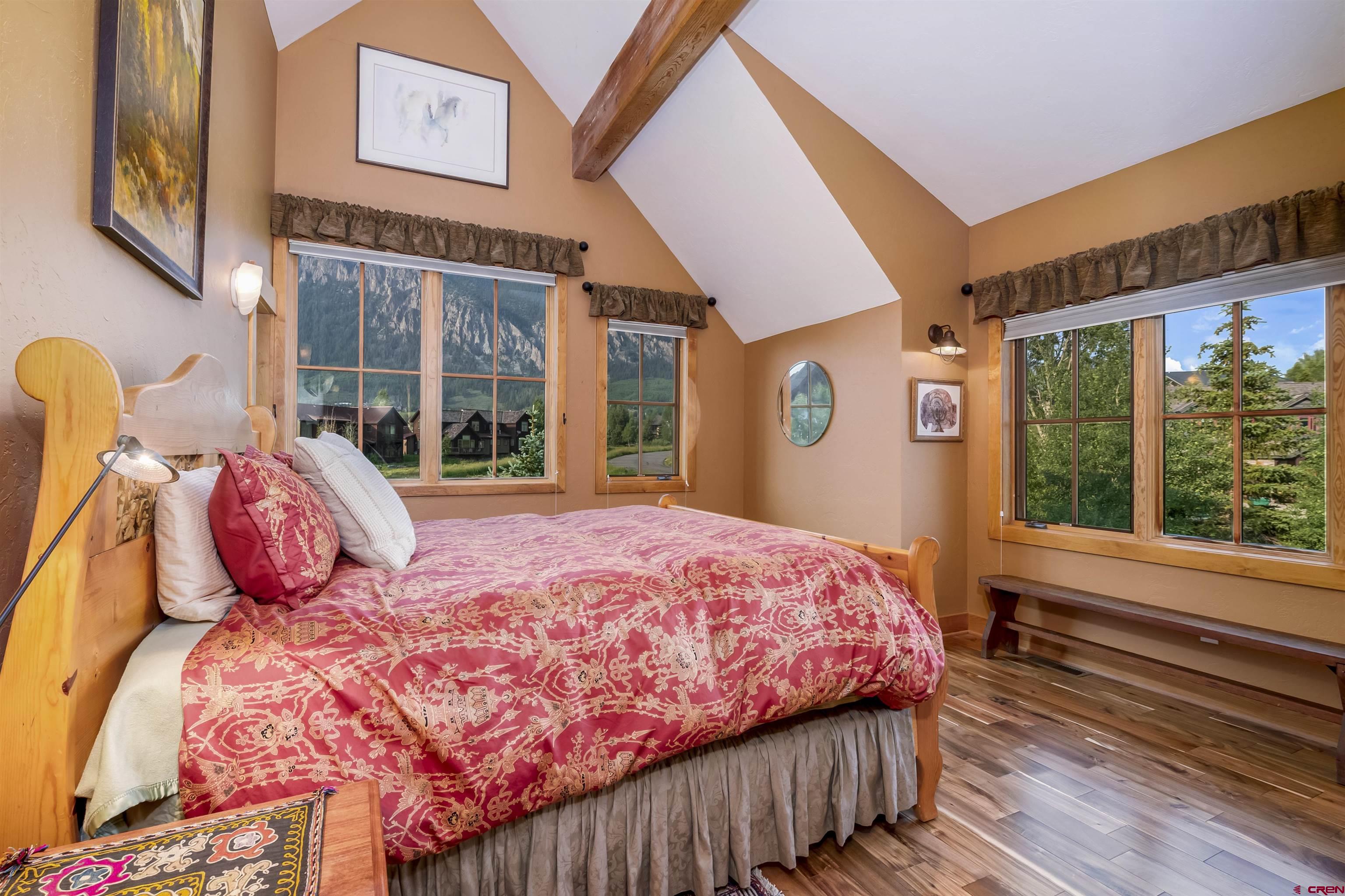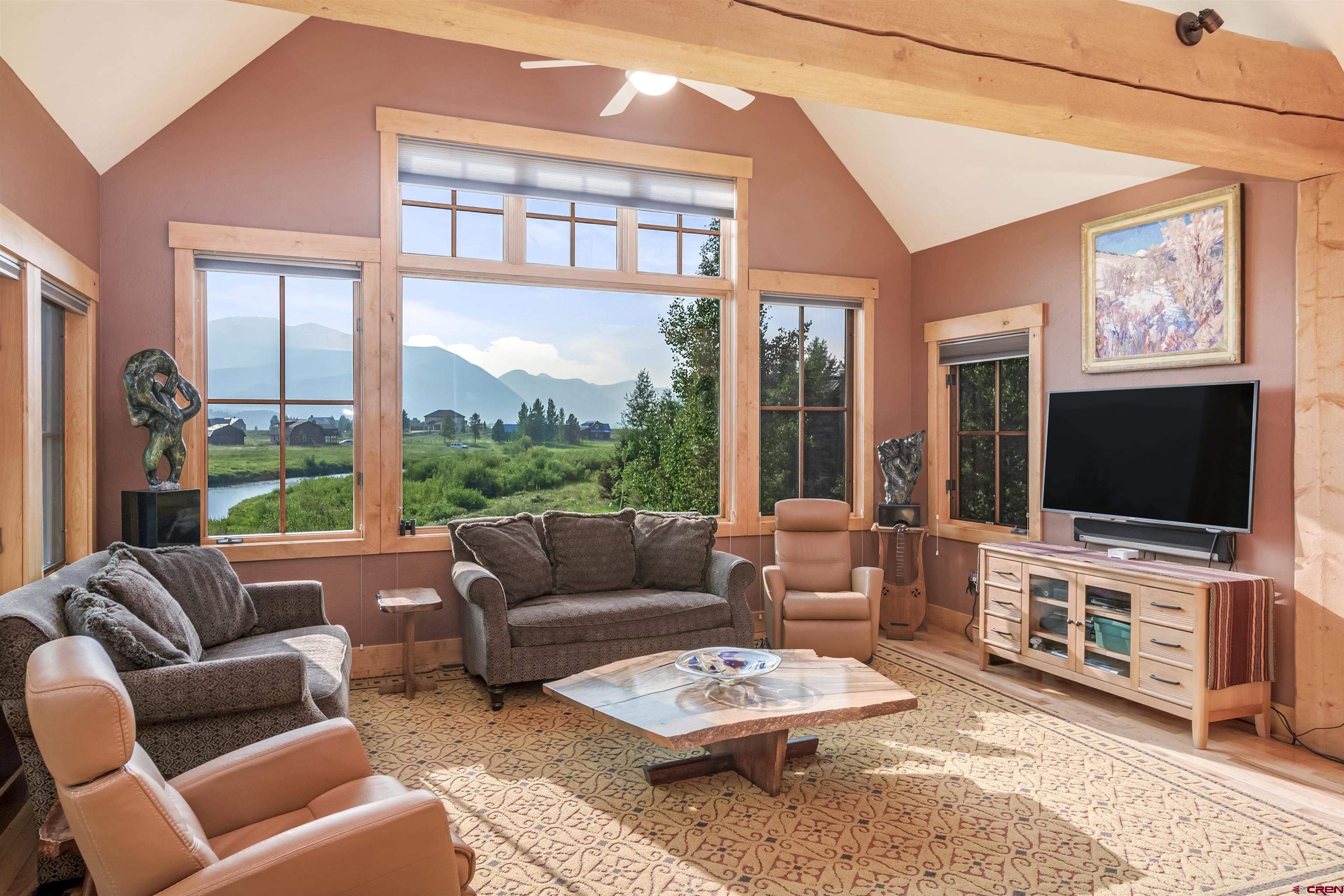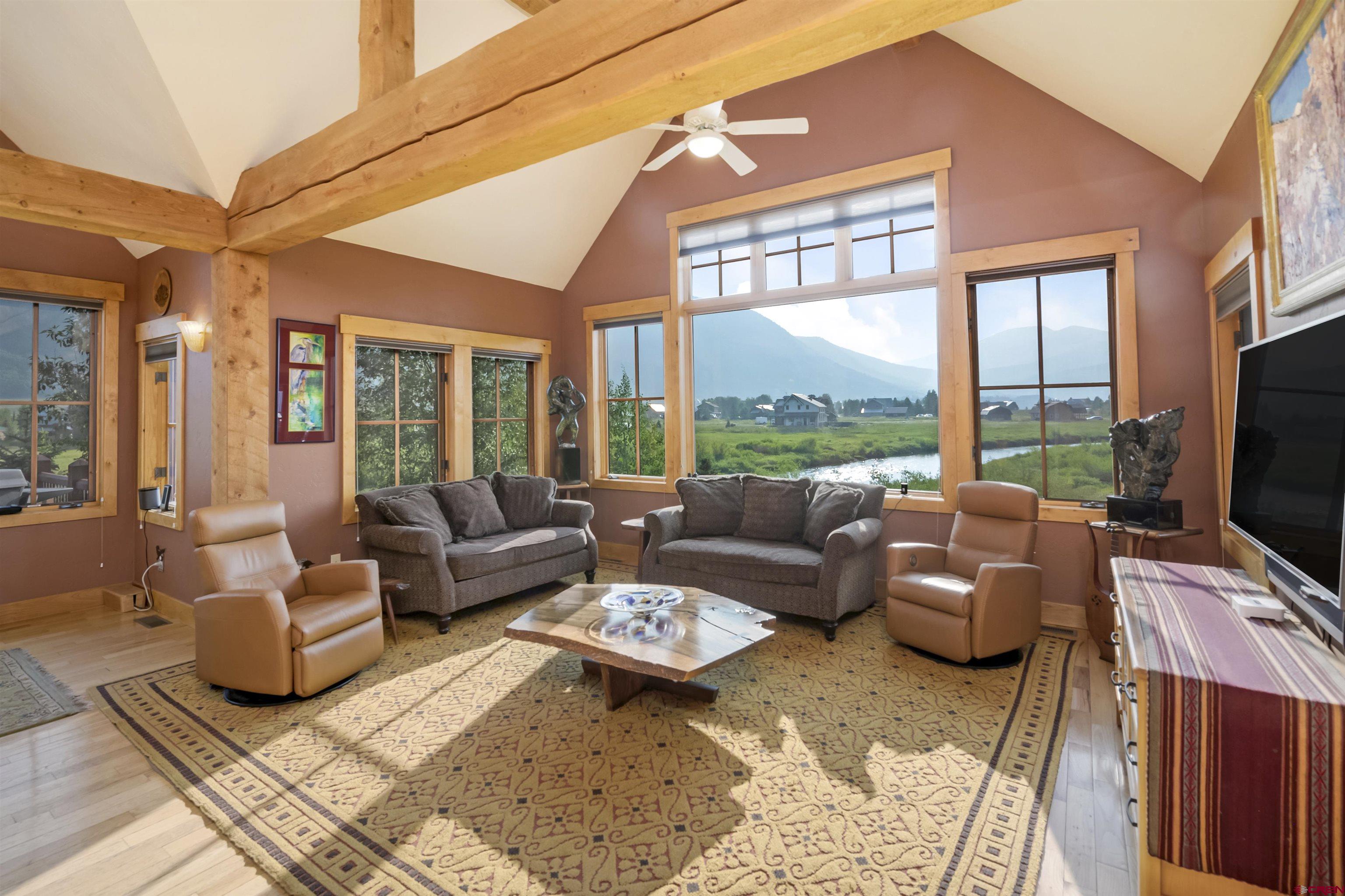 Welcome to this quintessential Skyland home, located on the Slate River. Situated on one of the most expansive areas of Skyland, the wide-open views to the north of Mt. Crested Butte, Gothic Mountain, Mt. Emmons, and Paradise Divide will be yours to enjoy forever. The home was meticulously designed to frame views of these mountains as well as Whetstone Mountain from all spaces in this well thought out mountain retreat. Set amongst mature aspens with ample outdoor space and private patios, this stunning four bedroom, three and one-half bathroom residence offers unparalleled tranquility with direct river access, a front row seat to wildlife, and plenty of space to entertain family and friends. The main level features three spacious bedrooms, one currently utilized as a home office and another as an art studio. Both rooms provide direct access to a private patio with a hot tub perfect for relaxing with the sounds of the Slate River just steps away. Additionally, the main floor includes one full and one 3/4 bathroom as well as a laundry room. The second level offers a large, vaulted open-concept living, dining, and kitchen area designed for both comfort, views, and entertainment. Large windows bring the breathtaking river and mountain views into this inviting space, while the thoughtful kitchen layout works well for many purposes. The generously sized primary suite enjoys an expansive view of Mt. Crested Butte plus a full ensuite bathroom with a soaking tub. Enjoy BBQs and dining al fresco on the large balcony overlooking the beautifully landscaped grounds along the Slate River. The property is enveloped by trees and beautifully maintained flower gardens that were carefully crafted over several years, creating a private oasis that enhances the natural beauty of this exceptional home and will be enjoyed for generations to come. One can easily find peace here with the abundant sounds of nature. The highly sought after Skyland neighborhood is the only country club neighborhood in Crested Butte. The neighborhood houses the immaculately maintained Club at Crested Butte, a members-only country club which boasts the challenging 18-hole Trent Jones Jr. designed golf course, indoor pool, fitness facilities, pro shop, and fine dining, all within the confines of the Skyland neighborhood. In addition to the country club, Skyland features Lake Grant, a non-motorized recreational lake with a pavilion, a walking trail, and access to multiple hiking and biking trails. Skyland is near the Town of Crested Butte (2-minute drive or 10-minute bike ride), the Crested Butte Mountain Resort, and national forest. This majestic setting will provide memories to cherish for years to come. We invite you to compare this property to similar opportunities in other resorts as well as the Crested Butte area. Embrace the tranquility and elegance of riverside living in the highly desirable Skyland subdivision of Crested Butte. For those looking for the very best, this mountain home will be a timeless and prized possession for years to come. This rare opportunity is not one to be missed!