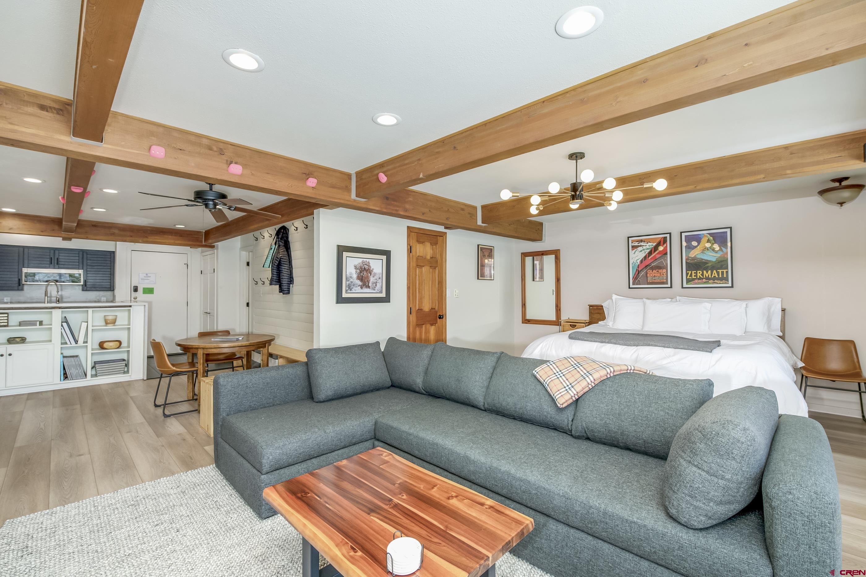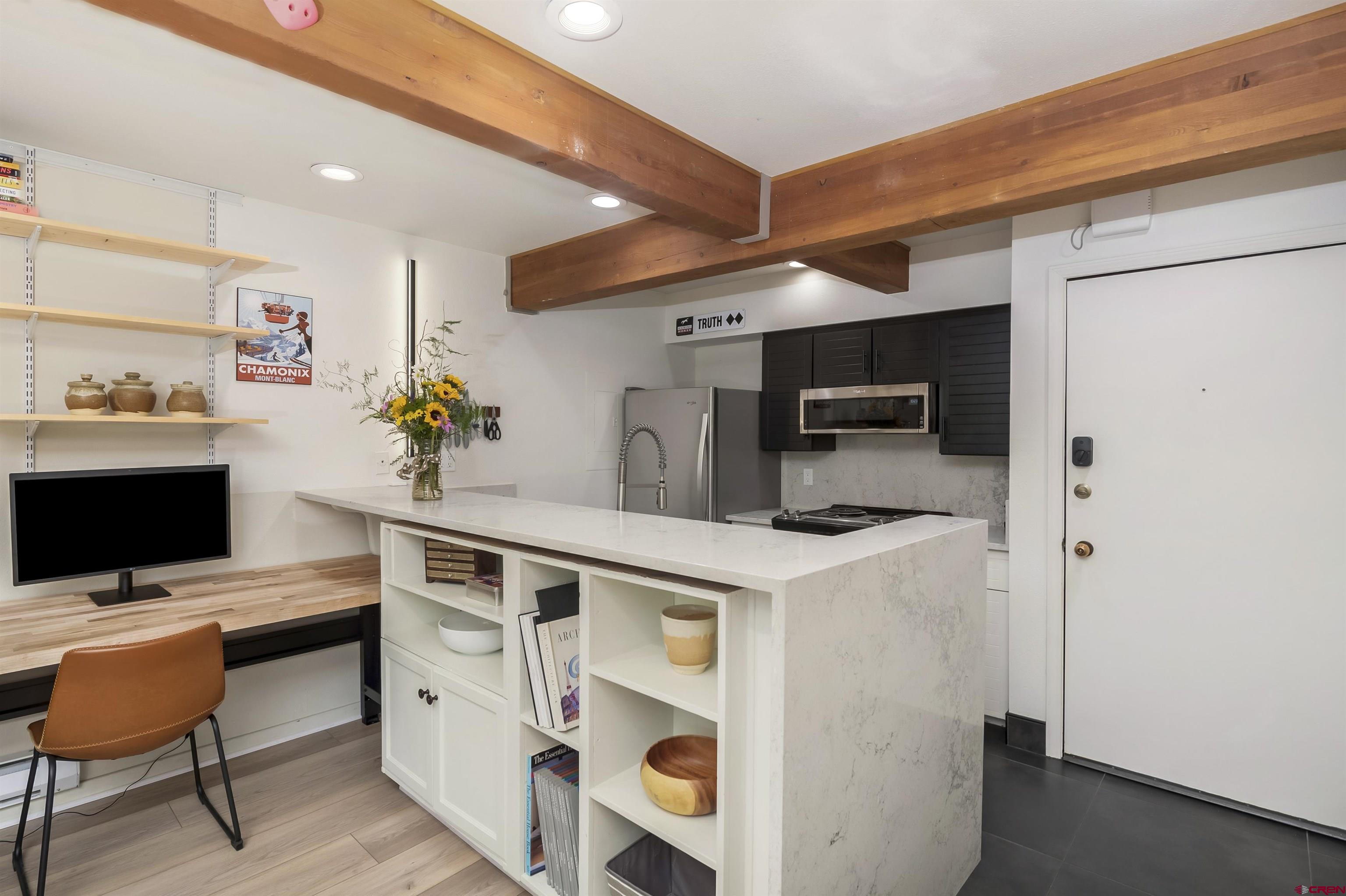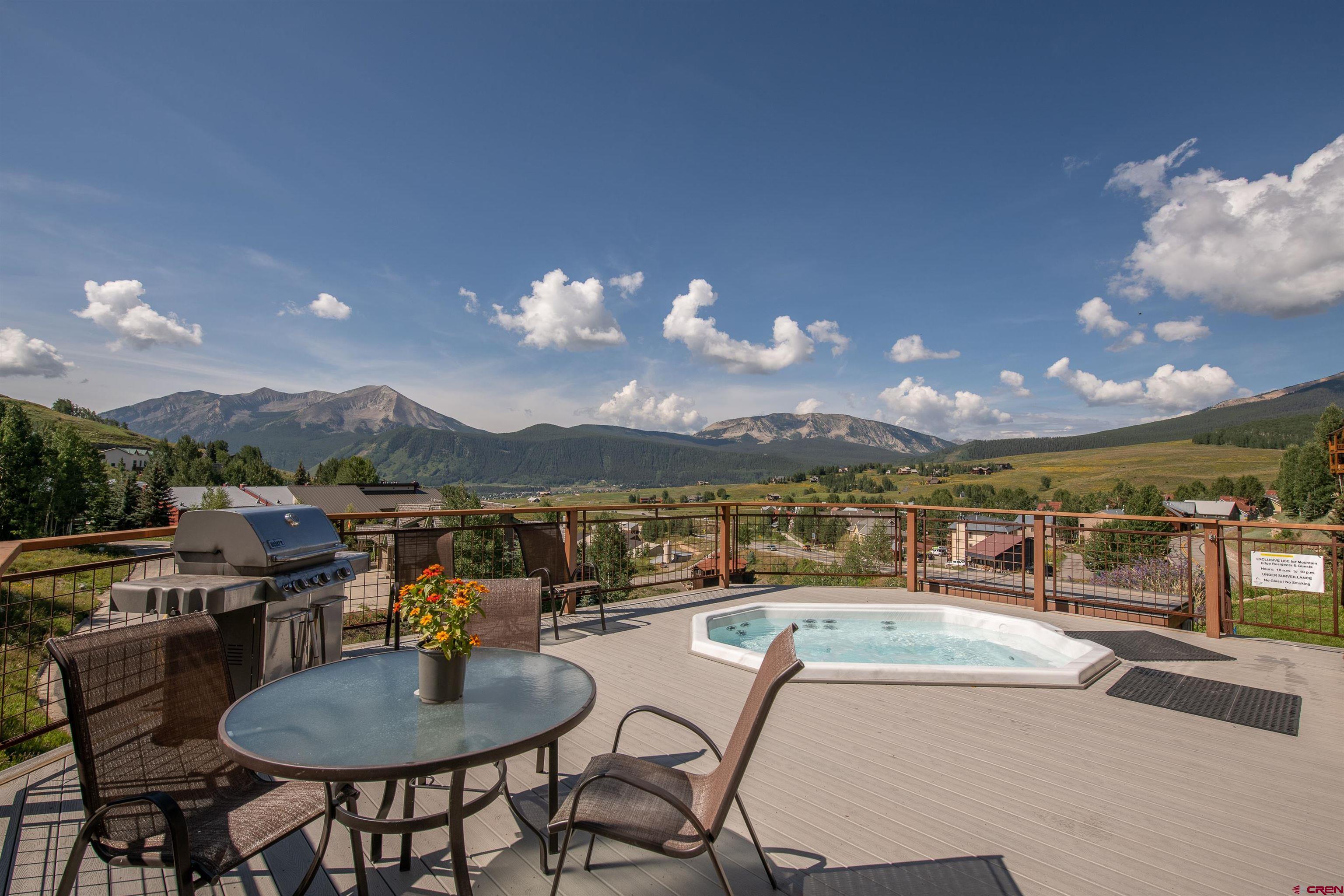 Discover the perfect condo you’ve been searching for! Just a three-minute walk to the West Wall ski lift and conveniently located on the bus stop, this recently renovated unit offers effortless living with its ground-level, no-stairs entry. The contemporary kitchen features quartzite countertops, newer appliances, and a spacious pantry, making meal preparation a pleasure. The large, full bathroom includes a walk-in shower with stylish Fireclay tiles and a glass wall, a triple-door recessed medicine cabinet, and a Bosch washer/dryer. New COREtec flooring has been installed throughout the condo. The inviting living area, enhanced by large wood beams, exudes a cozy ski lodge ambiance and is bathed in natural light from the expansive west-facing sliding glass doors. In the summer, relax on the patio and enjoy the sunset surrounded by tall aspen trees for added privacy. With two exterior storage closets for skis and bikes, this condo is an ideal base camp for all your Crested Butte adventures. After a day of fun, unwind on the hot tub deck, offering some of the best views in the Valley! Use as a primary residence or great for an investment property too.
