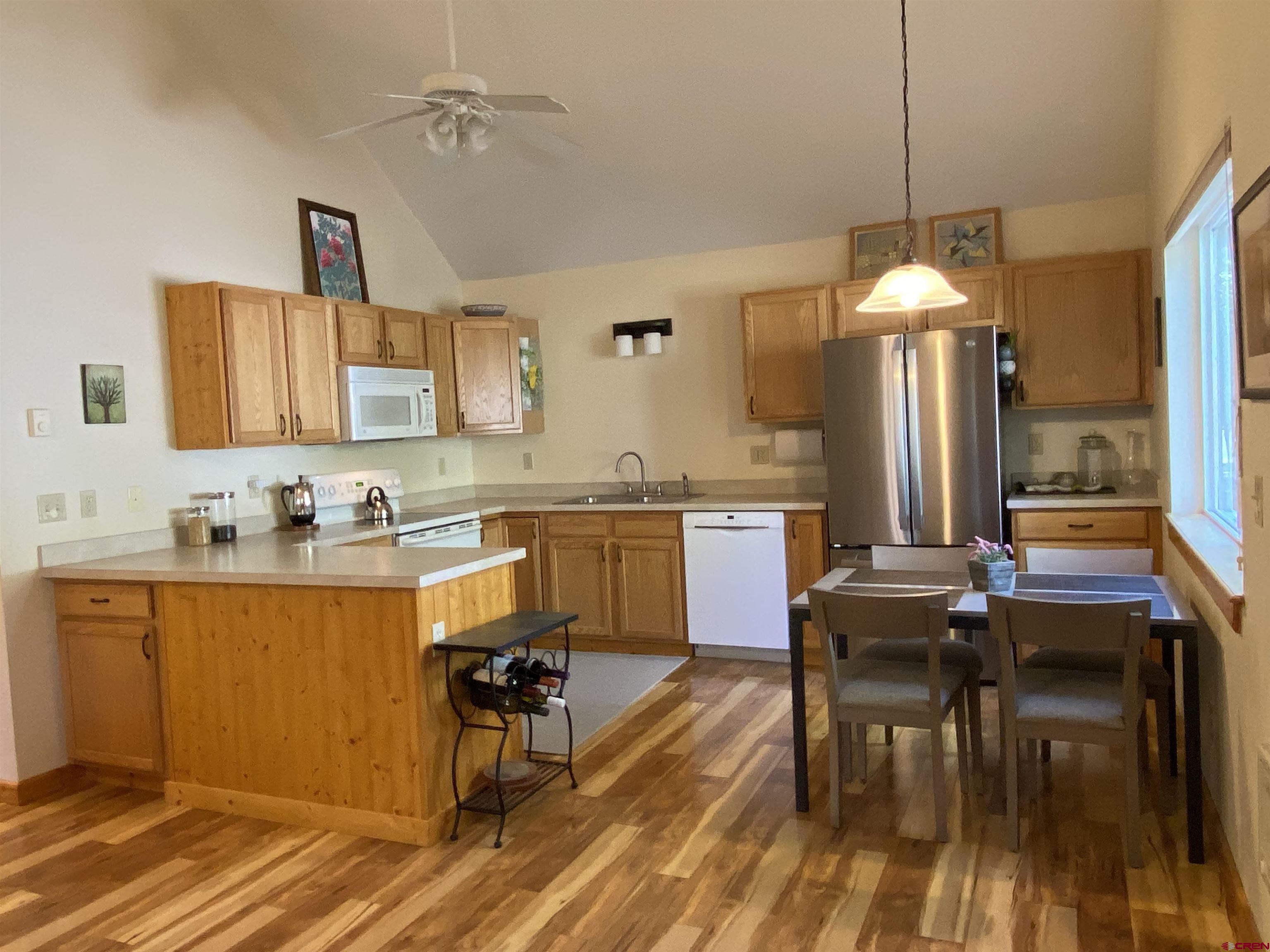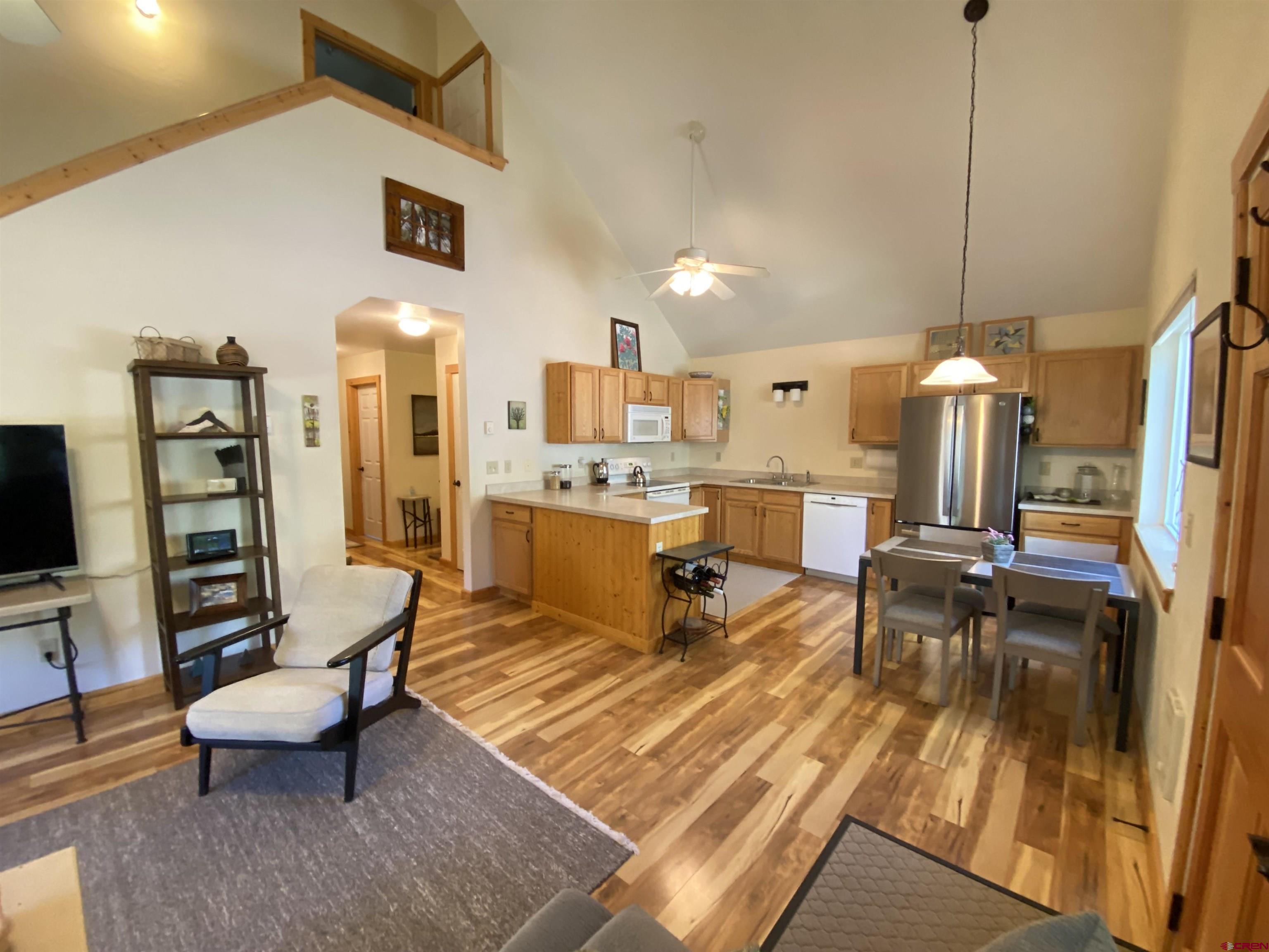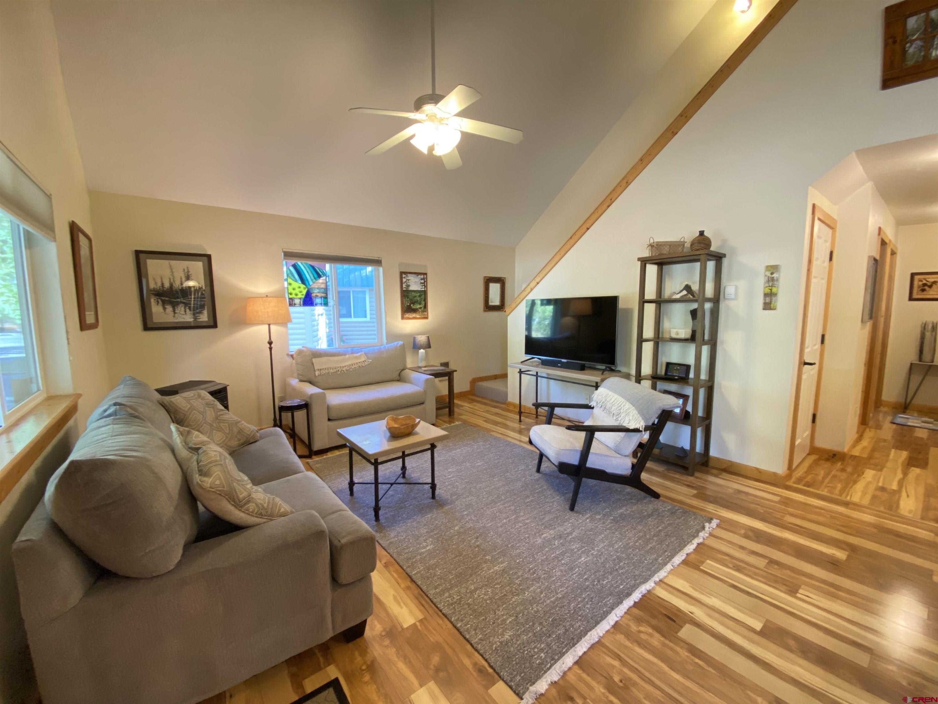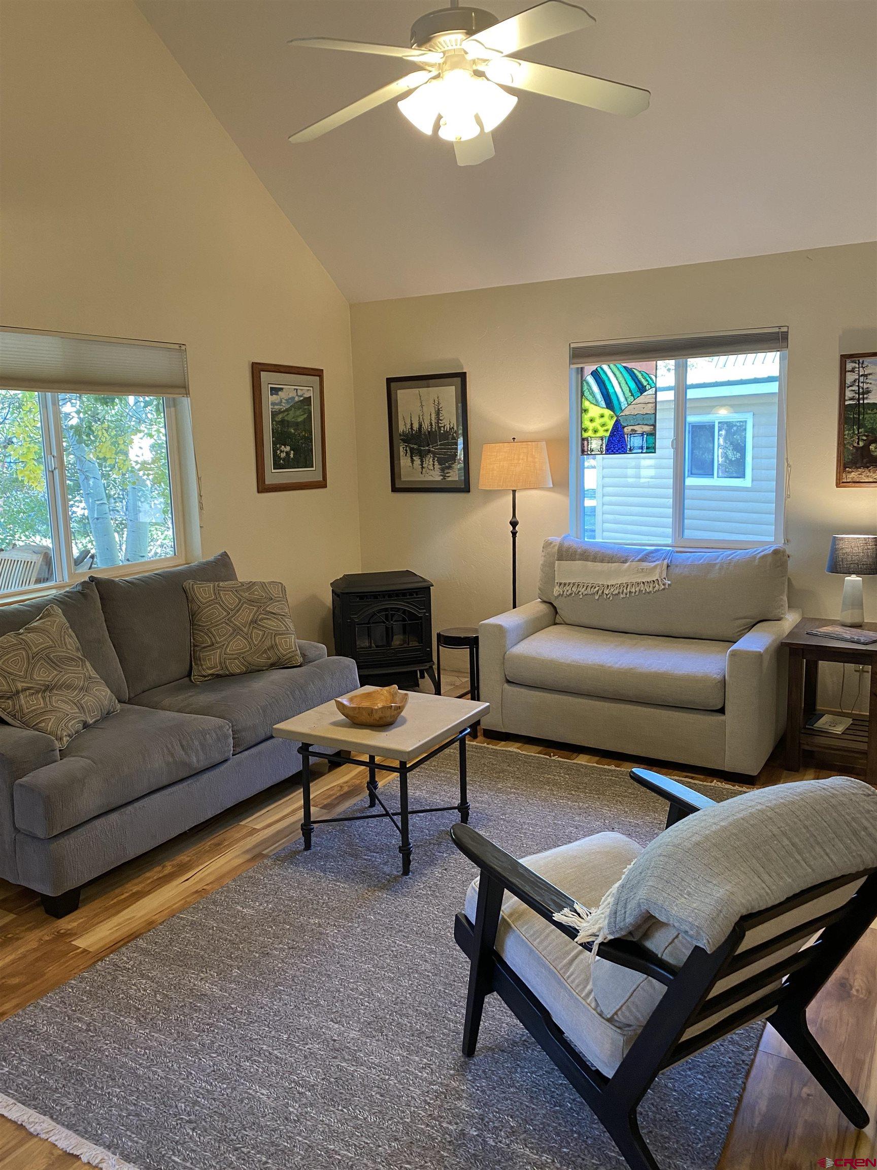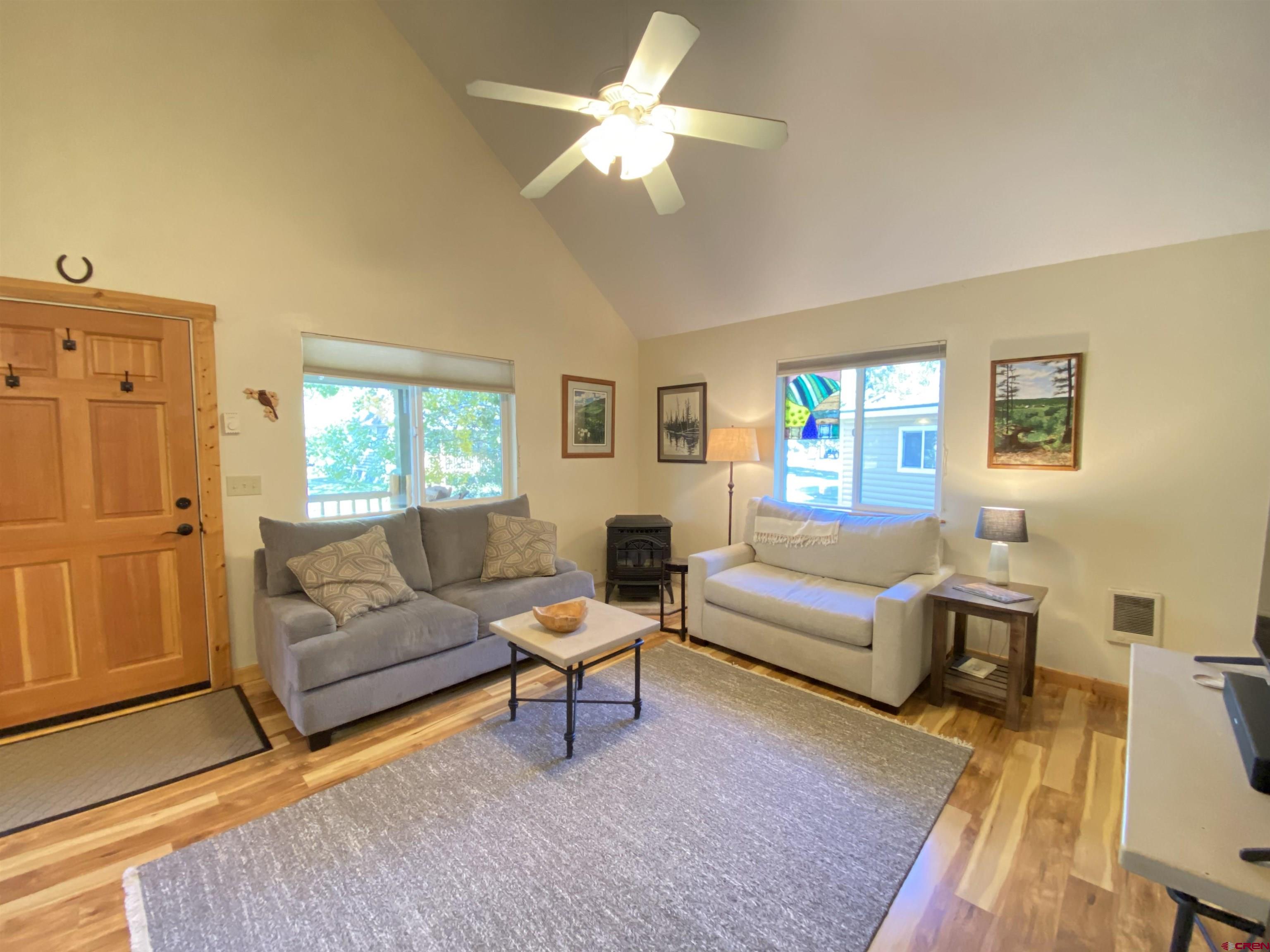 Looking for that charming home just minutes from biking, hiking, fishing and downtown shopping? 105 Wildrose is nestled in a quiet neighborhood just minutes from Main Street. Upon entering the main level, you will be greeted with an open layout, complete with vaulted ceilings and plenty of afternoon sunshine! Cozy up next to the pellet stove after a long day of skiing. The kitchen/dining room has an abundance of counter space and storage, perfect for your cooking and entertaining needs. Head down the hall and you will find a full bath as well as a mud/laundry room and the entrance to the spacious one car garage. Two generously sized bedrooms, one with a large traditional closet and one with a roomy walk in closet complete the first floor. Head upstairs to the expansive primary bedroom, a sanctuary to relax and reflect. The primary bedroom has its own full bath and walk in closet. There are ceiling fans and plenty of storage throughout the home. The covered deck off the front is a great place to 'toast' to the afternoon sun and the back patio is a quiet place to start your day sipping coffee. The home is surrounded by beautifully maintained grounds and mature landscaping that is all handled by the HOA. Whether you are looking for your first home, wanting to downsize, on a quest to find a mountain retreat, or looking for a perfect investment property, this home has it all!