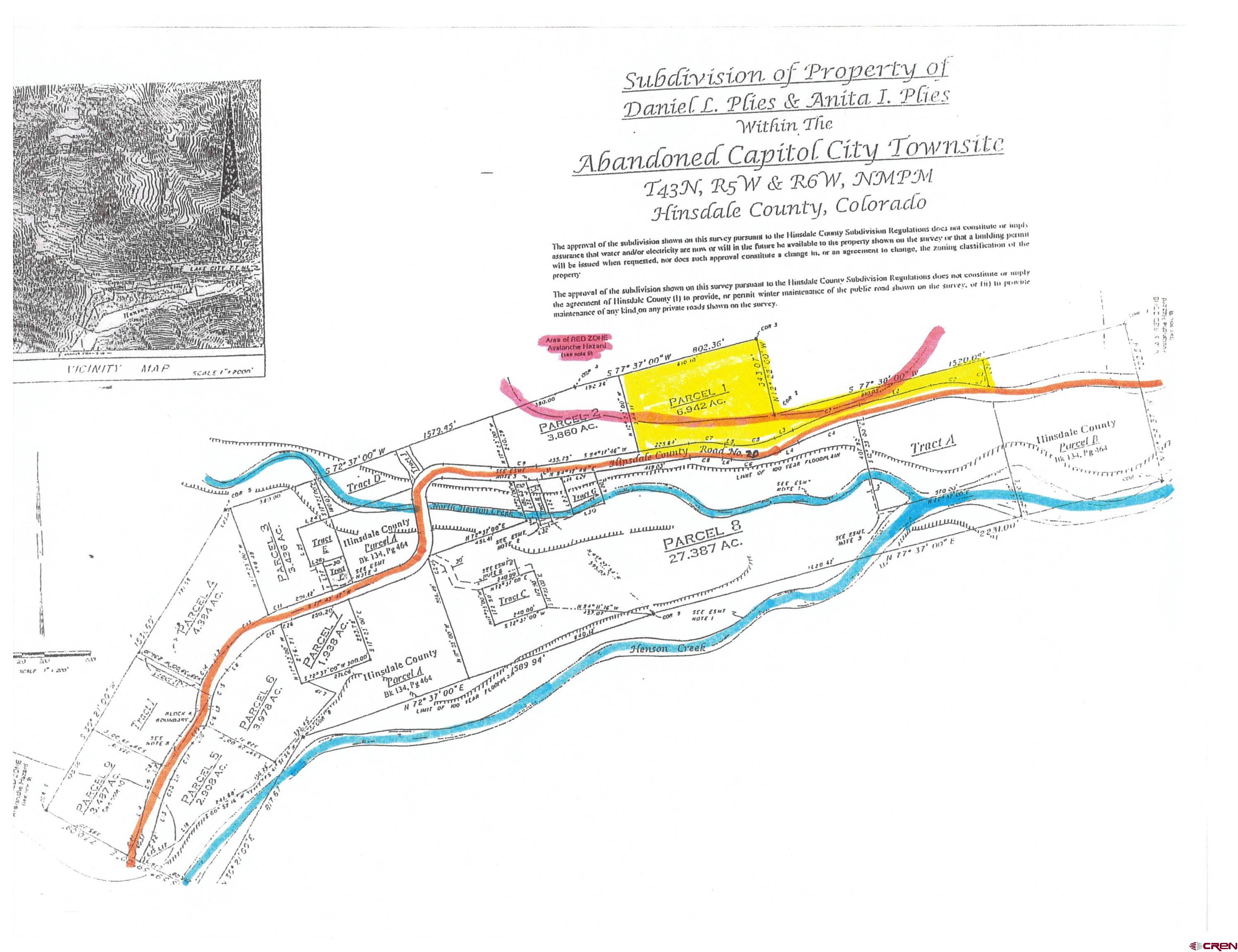 SALE PENDING....Own a piece of the original historic Capitol City Townsite located in the heart of the San Juan Mountains on the scenic Alpine Loop (Engineer Pass side) via SEASONALLY ACCESSIBLE County Road 20. Parcel 1 offers 6.94+/- acres adjacent to County Road 20 offering high mountain views of the beautiful Henson Creek Valley. Parcel is close to Henson Creek, offers multiple mountain recreational opportunities and abundant wildlife. Please note a portion of the property is located within a Red Zone Avalanche Runoff Area. There remain some ideal building sites for your seasonal off-grid cabin. Capitol City was once considered for the capitol of Colorado with the pristine beauty of the Henson Creek Valley and busy community of gold and silver prospectors. The property will be available for viewing when Hinsdale County opens the gate to the back country typically in May. Please contact Brokers for additional information.