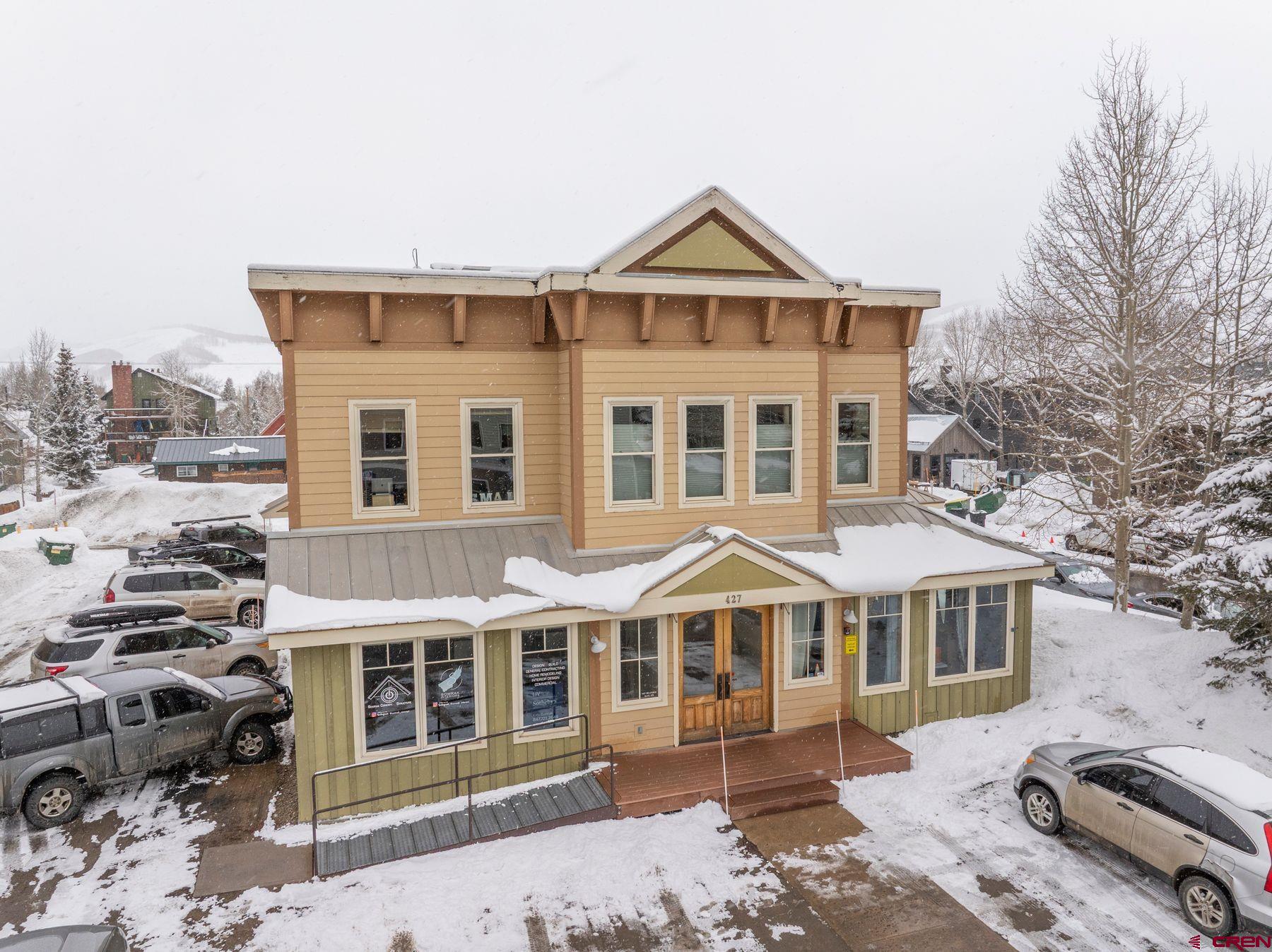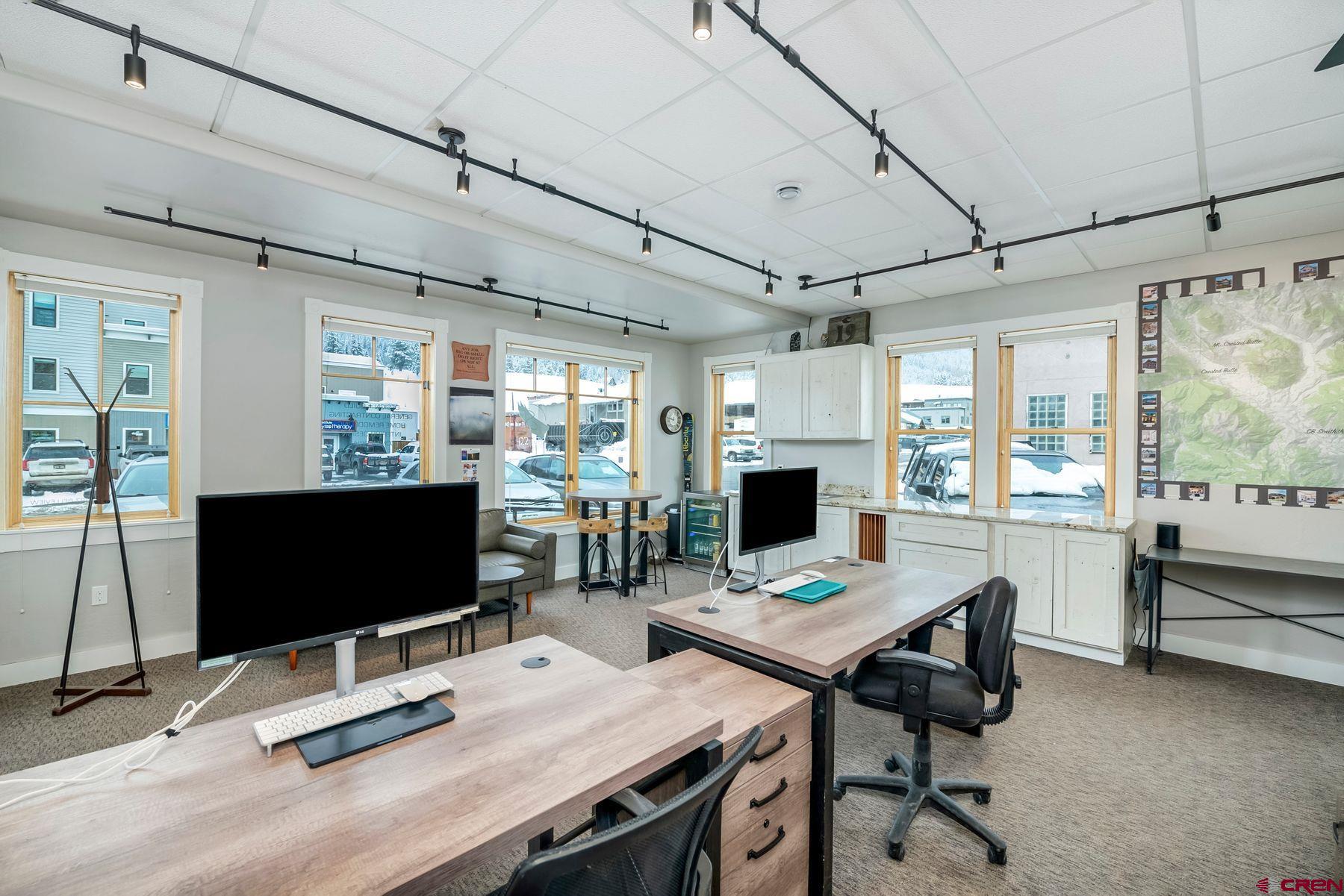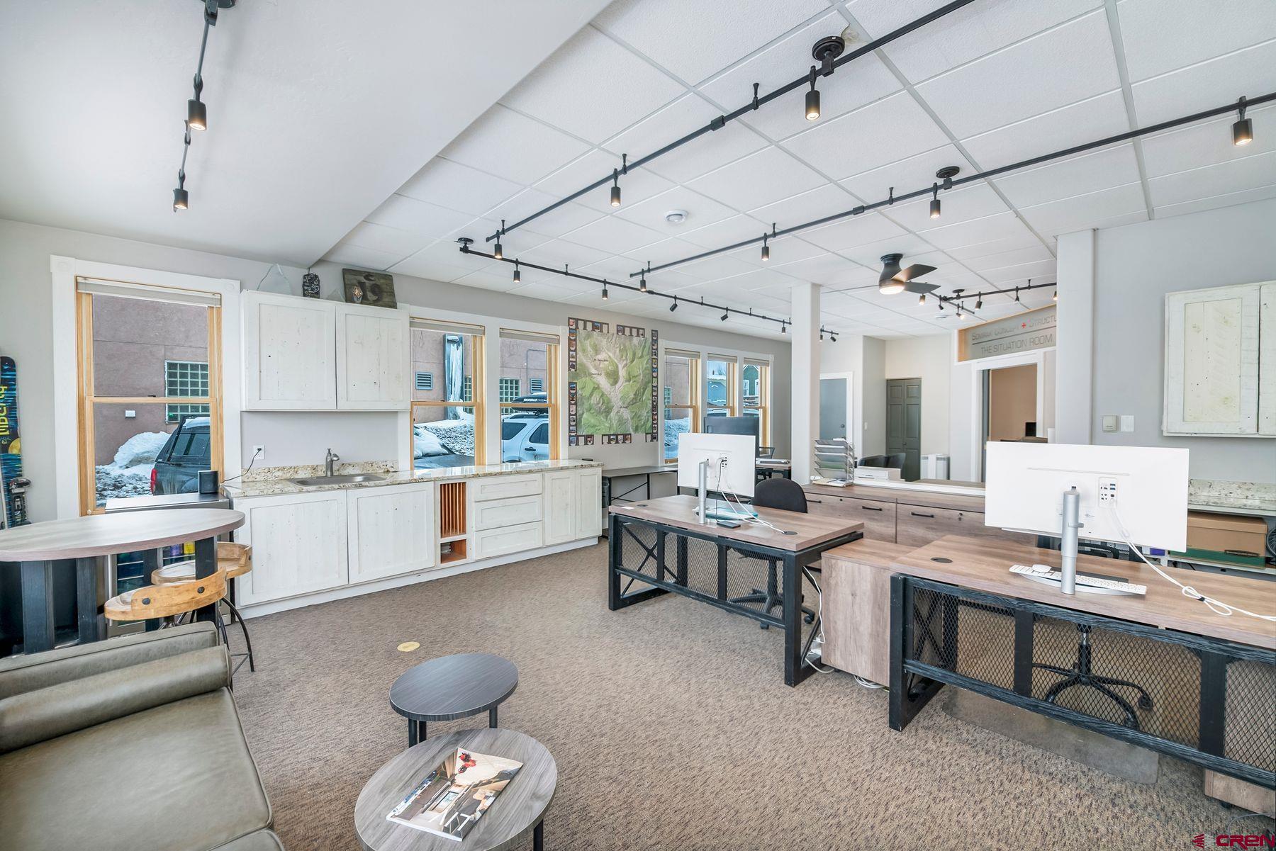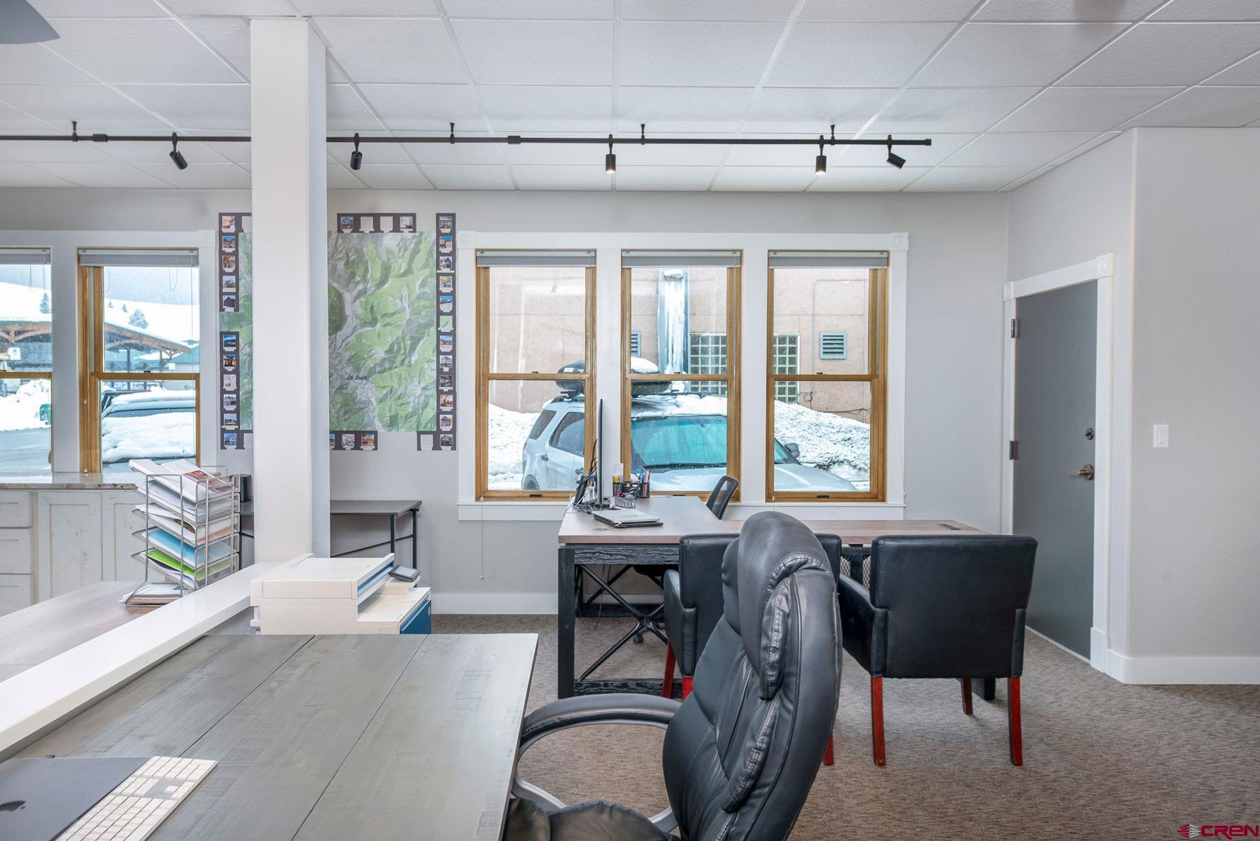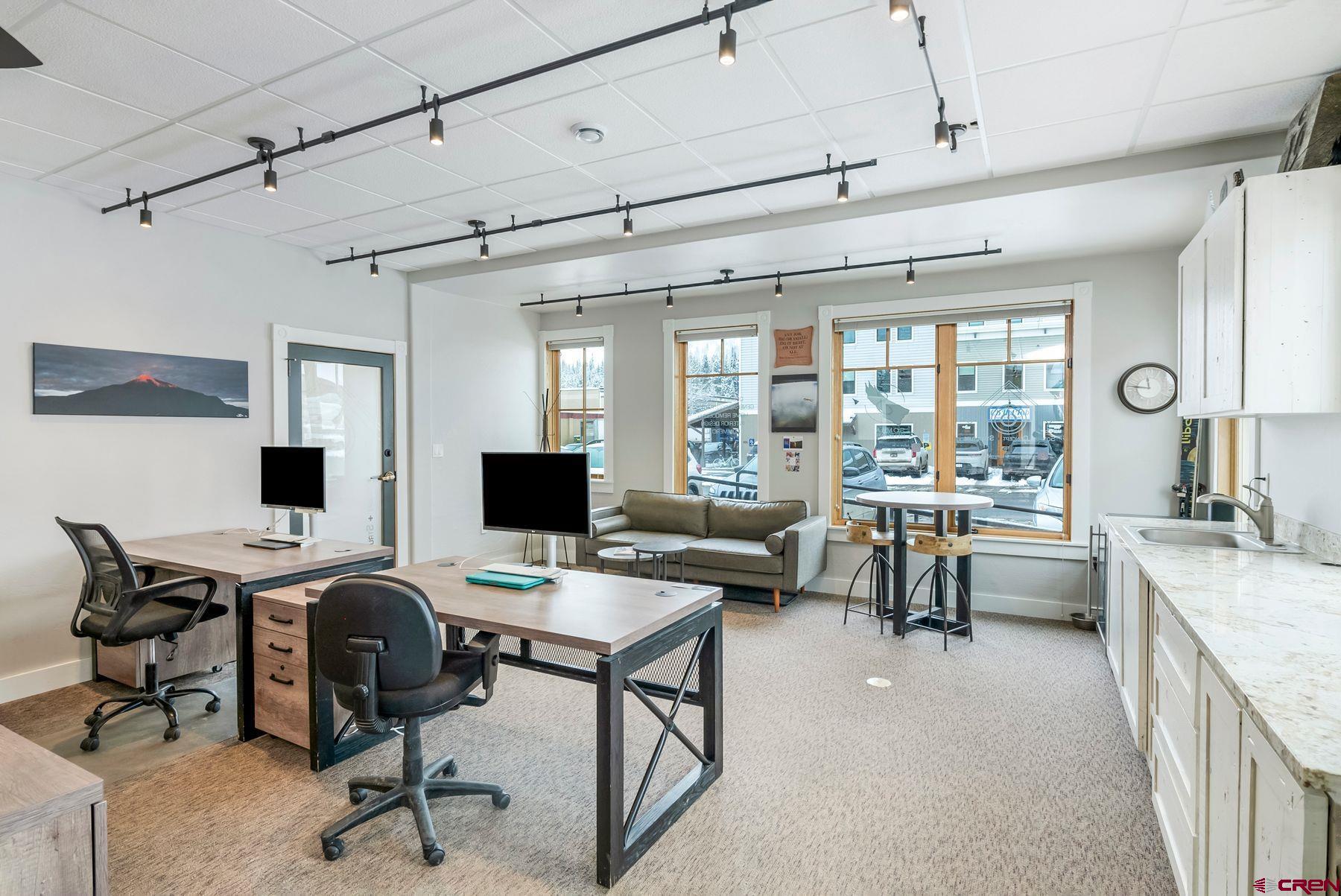This large office space is conveniently located near Clarks Market, the Mountain Express bus stop, and is a very quick walk to everything on Elk Avenue! Amazing, light-filled space in the West Elk Center, one of town's newer commercial buildings. Units 103 and 104 are conveniently located on the first floor, Belleview entrance, on the corner of the building and on the sunny side of the street with plenty of large windows to make it light and bright. Competitively priced per square foot. This is a special opportunity in the commercial real estate market in the town of Crested Butte. Sellers upgraded paint, lighting and cabinetry when they purchased the unit in 2020. Unit includes two off street parking spaces. Common areas include large waiting areas on both the 1st and 2nd floors, elevator, ADA accessibility and several bathrooms including one with a shower. This offering has its own sink and large countertop areas for your mini kitchen needs. Built in storage, and a spacious back room currently being used as a showroom for a designer. Currently set up with five desk spaces, a nice living area and multi-purpose areas for a busy custom home design-build business. The possibilities await a new buyer to make this fantastic and sought-after space their own.