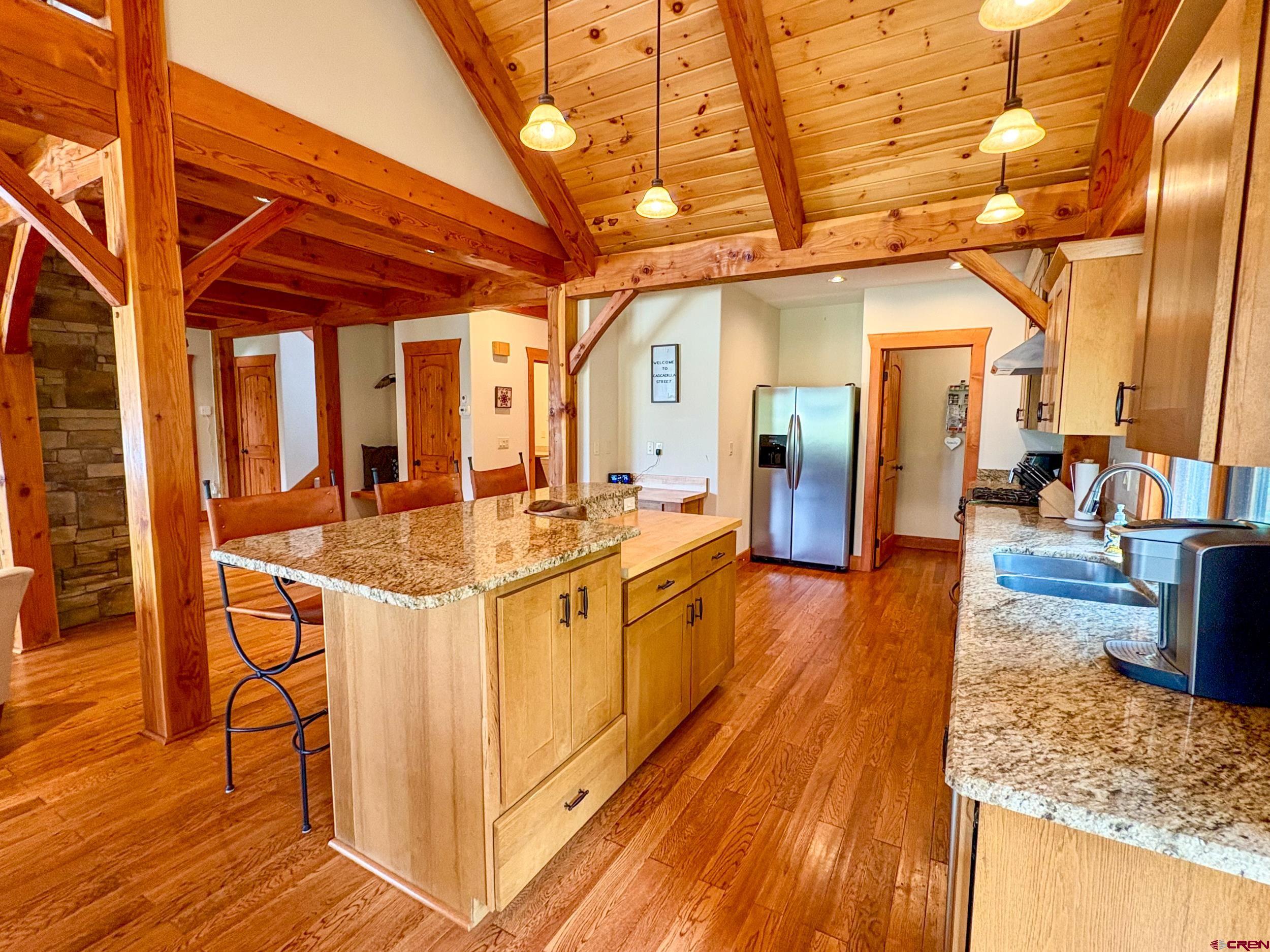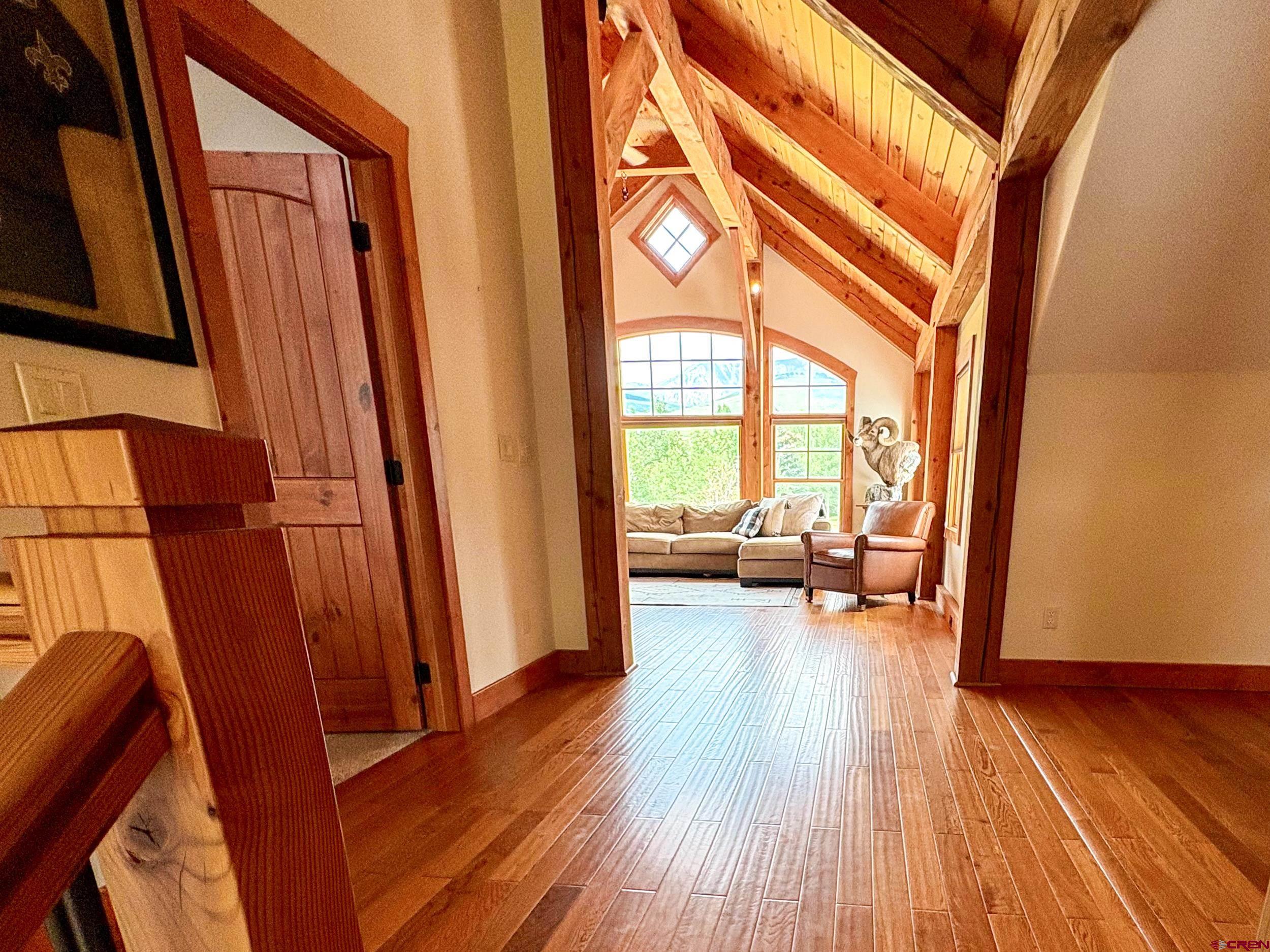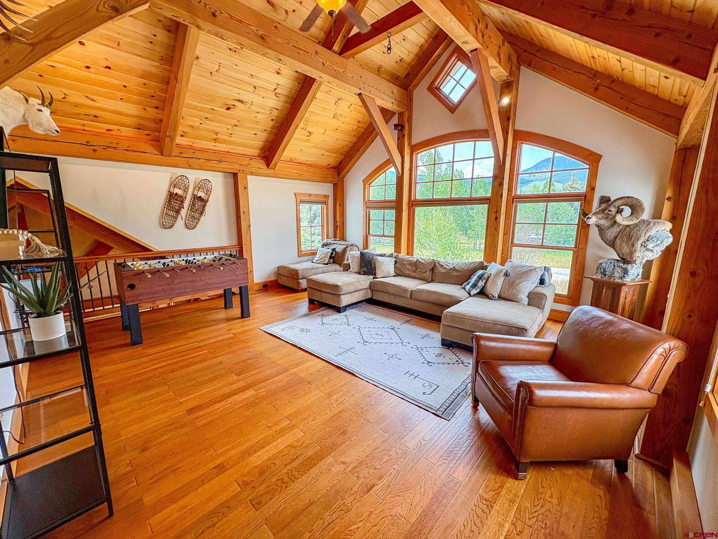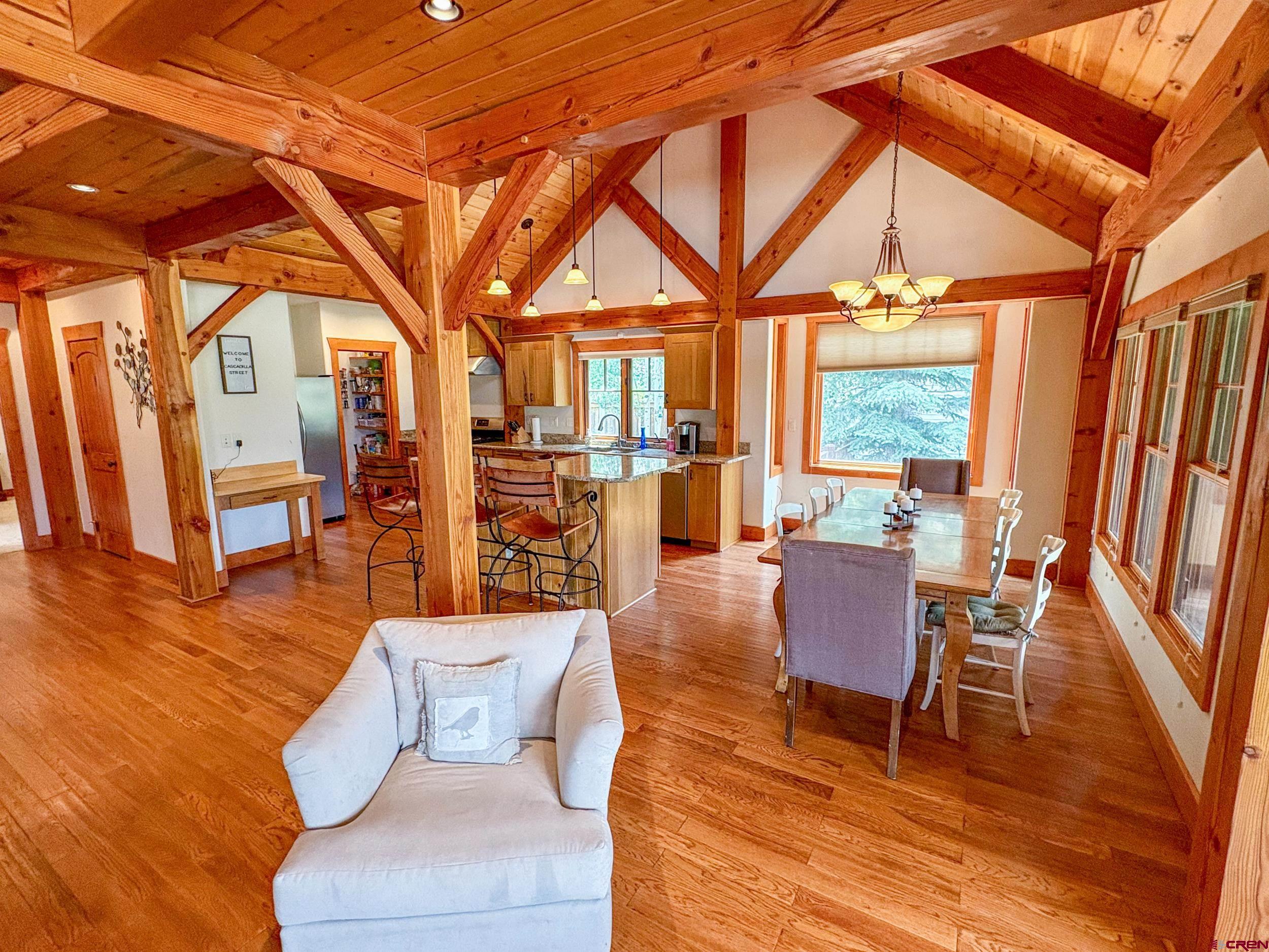 Welcome to 252 Cascadilla Street, a beautifully crafted timber frame mountain home nestled in the desirable community of Crested Butte South. Situated on 0.360 acres, this 3-bedroom, 2.5-bath property offers the perfect blend of timeless design and modern comfort. Step through the covered entryway into warm, light-filled living spaces featuring vaulted wood-beam ceilings, hardwood floors, and LED lighting. The open-concept layout seamlessly connects the kitchen, dining, and living areas, creating an ideal setting for both everyday living and entertaining. A striking stone gas fireplace anchors the living area, which flows out onto the covered deck, perfect for taking in the mountain views. The kitchen is a chef’s delight with stainless steel appliances, granite countertops, a large island, and an expansive pantry. Just off the kitchen is a convenient laundry room. The main-level primary suite offers a peaceful retreat with a spacious ensuite bath, while upstairs you’ll find two additional bedrooms, a three-quarter bath, and a bonus living area with large windows and even more mountain views. The outdoor living space is just as inviting, with a large fenced yard, a storage shed for extra gear, and an attached two-car garage to keep vehicles protected year-round. Upgrades include a new $15,000 boiler and fresh exterior stain completed in 2024. Residents of Crested Butte South enjoy access to a variety of amenities including East River fishing, tennis courts, a playground, and more. The RTA bus stop, with hourly service, offers easy access to the Gunnison Valley. Plus, the shops and restaurants of downtown Crested Butte and the slopes of Crested Butte Mountain Resort are just a short drive or bus ride away. Whether as a full-time residence or a peaceful getaway, this home offers a great opportunity to settle into Crested Butte living.