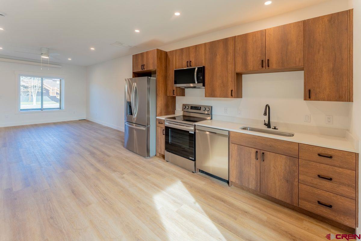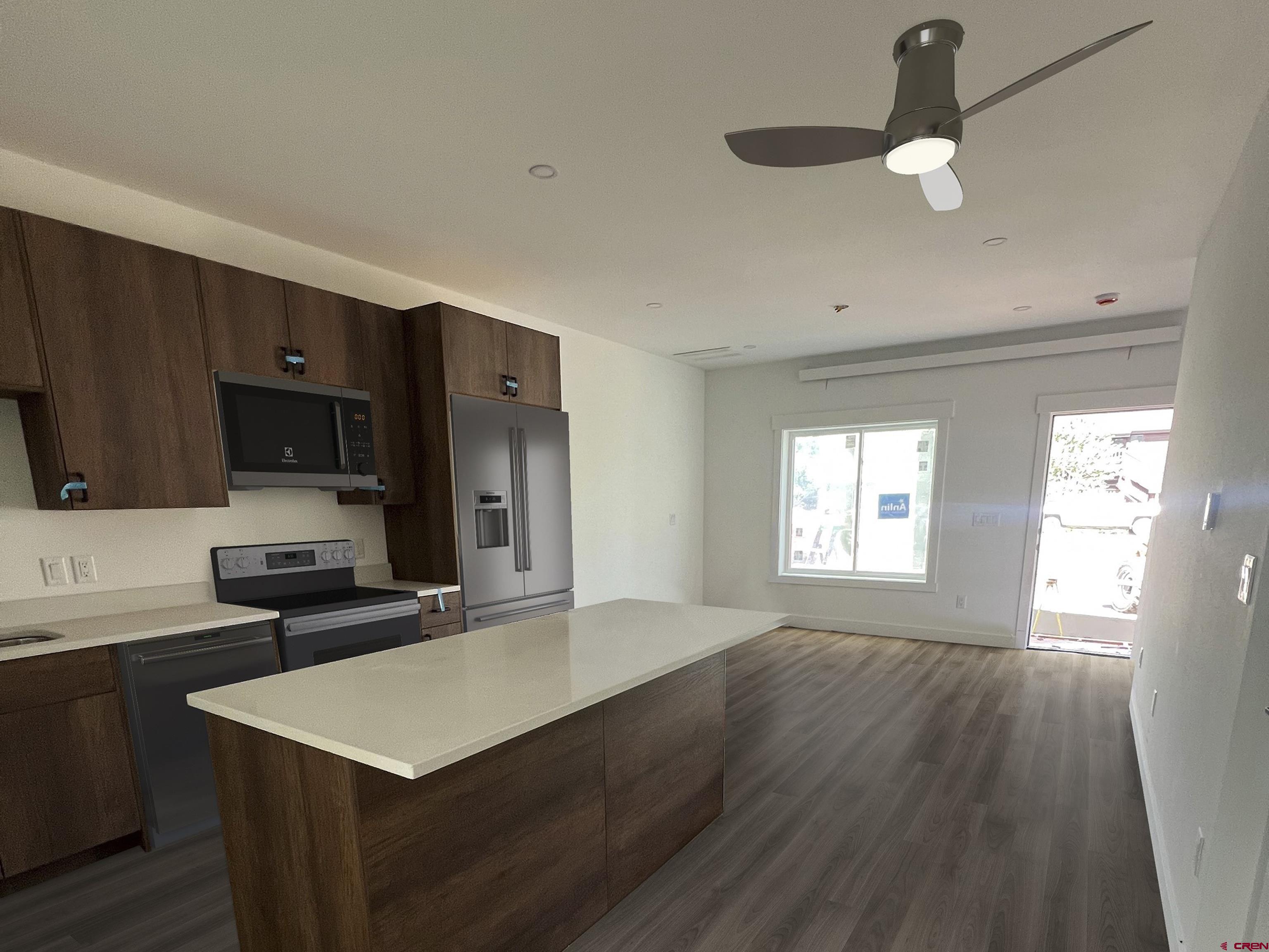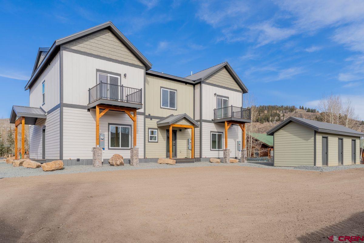 Construction completed and ready to move in! This 3-bedroom, 2-bathroom, 1,368 sq ft triplex unit blends modern mountain style with high energy efficiency, built using the latest construction technology. Premium finishes include engineered wide-plank oak flooring and engineered walnut cabinets. The main level features an open-concept layout with a sleek kitchen, stainless steel appliances, and a light-filled living area that opens to a covered deck leading to your own private yard. The primary bedroom and a full bath are also on this floor. Upstairs offers two bedrooms, a second full bath, a laundry room with washer/dryer, and a generous flex space ideal for extra sleeping, a home office, or a yoga room. The rear upstairs bedroom includes sliding glass doors opening to a balcony patio, creating a perfect mountain retreat. Outside, a dedicated 8' x 10' toy shed for skis, bikes, and gear. Two off-street parking spaces add convenience. Located two blocks from the Crested Butte South commercial district, residents enjoy tennis courts, playgrounds, East River fishing, and the RTA bus stop. Downtown Crested Butte is 10 minutes away, and the ski resort is 17 minutes up the road.With premium finishes, cutting-edge, energy-efficient construction, part of the CB South POA (with no additional HOA—just a shared party wall agreement), this home offers stylish, low-maintenance mountain living.