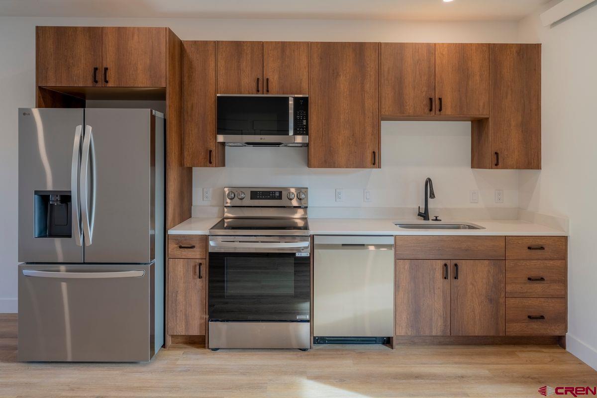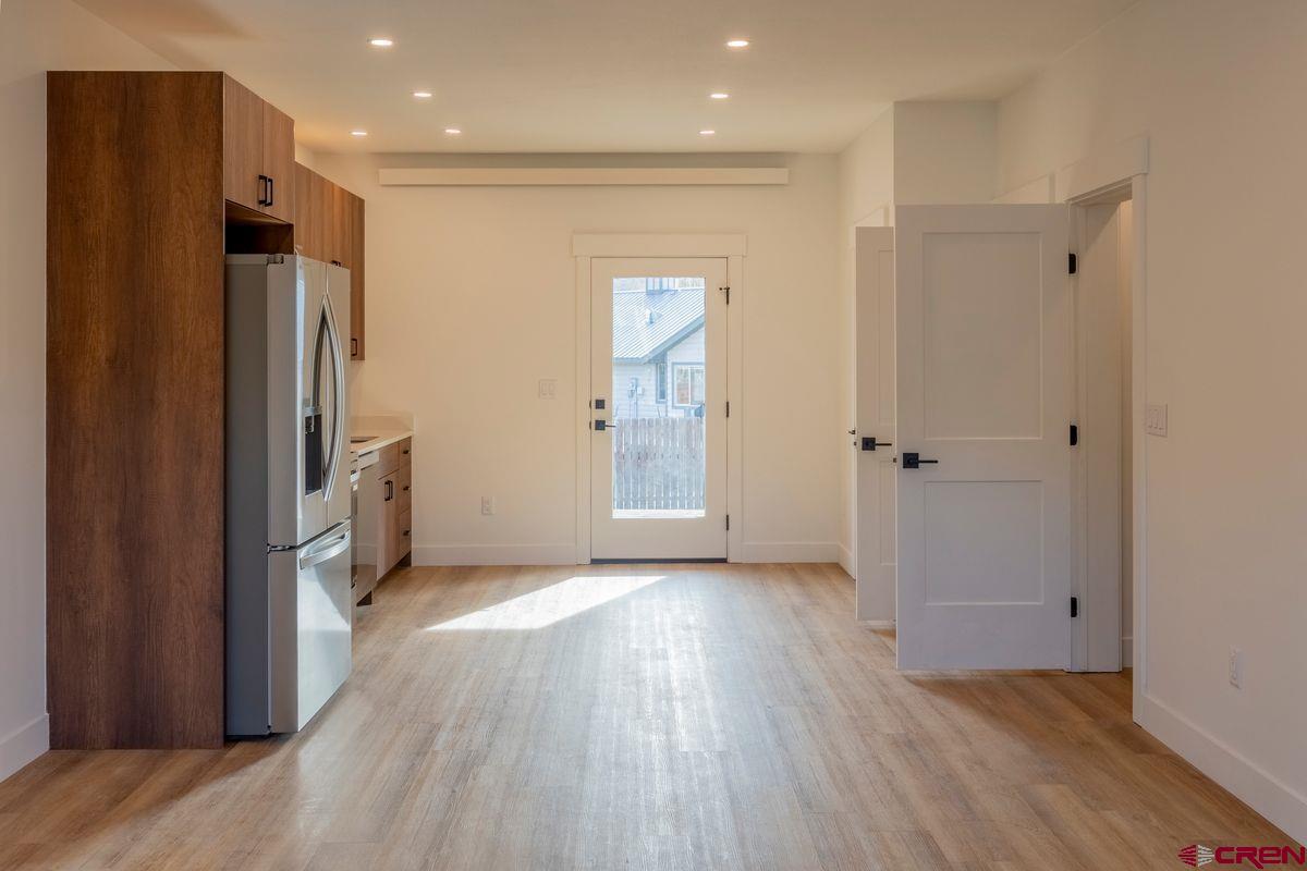 Construction completed and ready to move in! This 3-bedroom, 2-bathroom, 1,368 sq ft triplex unit blends modern mountain style with high energy efficiency, built using the latest construction technology. Premium finishes include engineered wide-plank oak flooring and engineered walnut cabinets. The main level features an open-concept layout with a sleek kitchen, stainless steel appliances, and a light-filled living area that opens to a covered deck leading to your own private yard. The primary bedroom and a full bath are also on this floor. Upstairs offers two bedrooms, a second full bath, a laundry room with washer/dryer, and a generous flex space ideal for extra sleeping, a home office, or a yoga room. The rear upstairs bedroom includes sliding glass doors opening to a balcony patio, creating a perfect mountain retreat. Outside, a dedicated 8' x 10' toy shed for skis, bikes, and gear. Two off-street parking spaces add convenience. Located two blocks from the Crested Butte South commercial district, residents enjoy tennis courts, playgrounds, East River fishing, and the RTA bus stop. Downtown Crested Butte is 10 minutes away, and the ski resort is 17 minutes up the road. With premium finishes, cutting-edge, energy-efficient construction, part of the CB South POA (with no additional HOA—just a shared party wall agreement), this home offers stylish, low-maintenance mountain living.