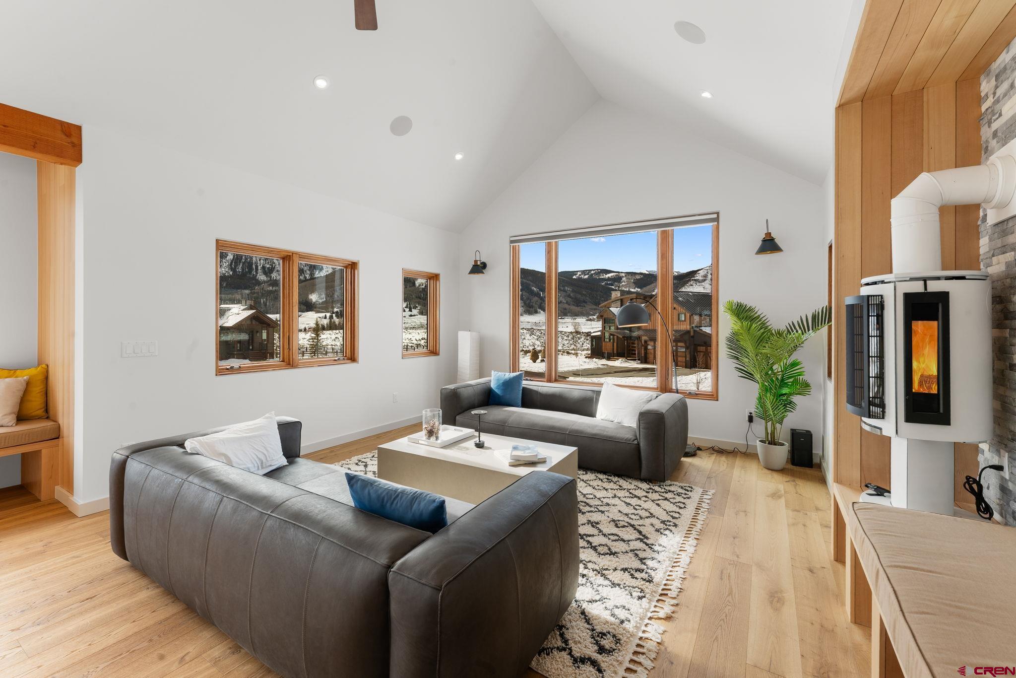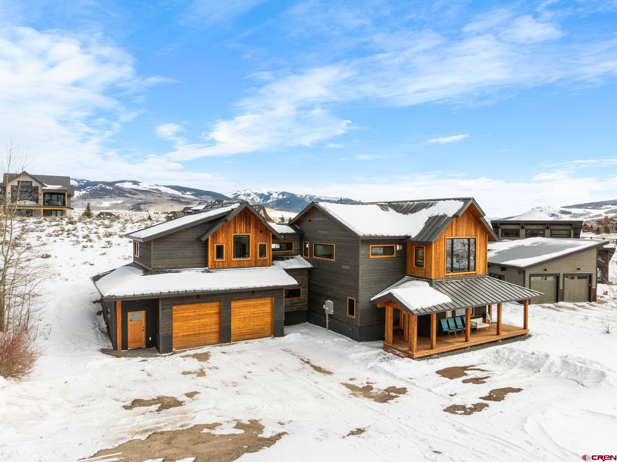 Completed in 2025, this awesome new Crested Butte design-build is located on Lexie Court, a quiet cul-de-sac corner in the highly desirable Larkspur community. The property backs to permanent open space and faces south and west offering dramatic mountain views of Whetstone, Red Lady, Gothic and the Paradise Divide. The home's living spaces enjoy excellent solar gain and all day Colorado light. Interior highlights include vaulted ceilings, white oak wide plank flooring, forged iron rails, gorgeous doors and trim, designer lighting treatments and beautiful tile, cabinetry, vanities and natural stone tops throughout. The thoughtful floor plan puts the primary suite upstairs along with the office, kitchen, living and dining areas. There are two bedroom suites on the lower level along with a bonus media room that could easily function as a fourth bedroom too! Other highlights include efficient in-floor radiant heat, a large gear room off the oversized 796 SF attached and heated garage, covered decks on both levels, a wrap around covered porch and a hot tub out back. The home features state-of-art A/V, automated blinds, thermostats and LED lighting. There are two EV charging ports in the garage.