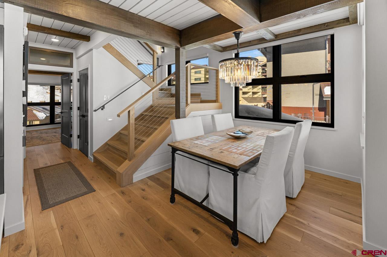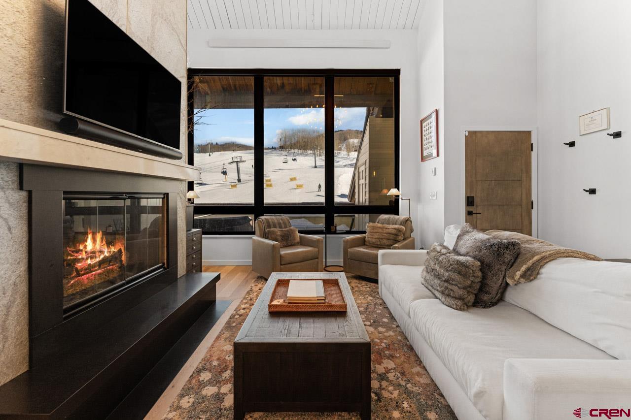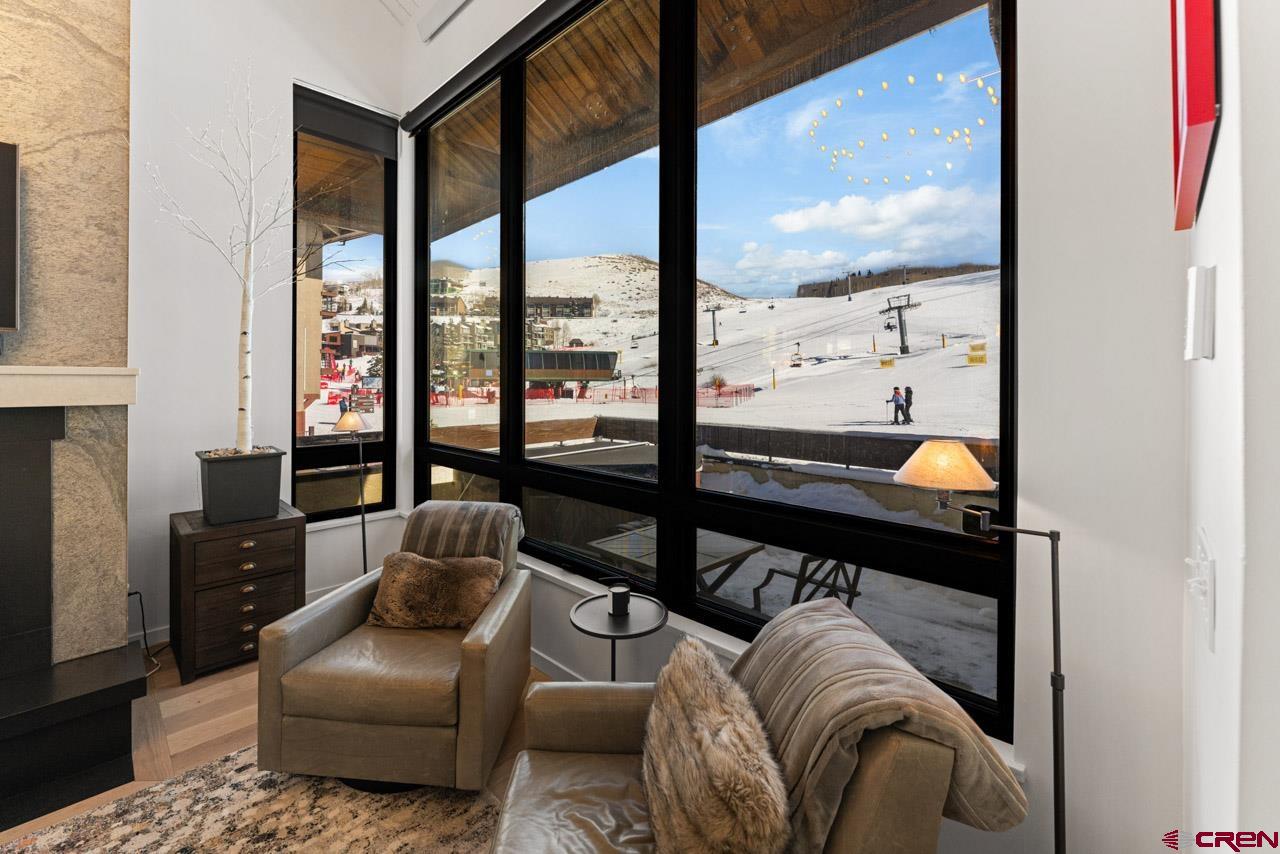 Wow! What an incredible spot on the ski slopes! This offering is a one-of-a-kind mountain retreat featuring an incomparable ski in-ski out location next to Crested Butte's main high speed quad lift: The Silver Queen. Renovated from the studs and completed in 2019, the home now features a raised second floor level creating 18-foot ceilings in the great room. During construction, structural and exposed oak beams were added along with the whitewashed tongue-and-grove wood ceilings, in-floor heating, new plumbing and electrical systems, new energy efficient windows and top of the line motorized Lutron blinds and Hunter Douglas Silhouttes. The interior enjoys Restoration Hardware furnishings and lighting, a Camino Vintage Candelabra 2-tier chandelier and a custom wood-burning fireplace with a white quartz mantle on a black granite hearth. The dining area seats six and is adorned with a spectacular 1920s 3-Tier Odeon Crystal Fringe chandelier. The kitchen footprint and cabinetry is complimented by stunning UltraLux contemporary high-gloss cabinets, under-cabinet lighting, Thermador stainless appliances, and white quartz stone countertops with an island bar with seating for four. The modern staircase sports a custom iron and oak banister with cable railing and wide plank white oak steps and risers. There are two well appointed primary bedrooms with beautiful ensuite baths. The lofted space currently functions as a second living area. Outside, the spacious Trex deck features a hot tub, a storage closet and a dramatic view of the skiing and the peak like no other.