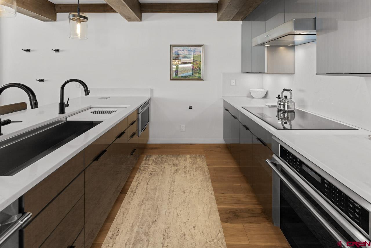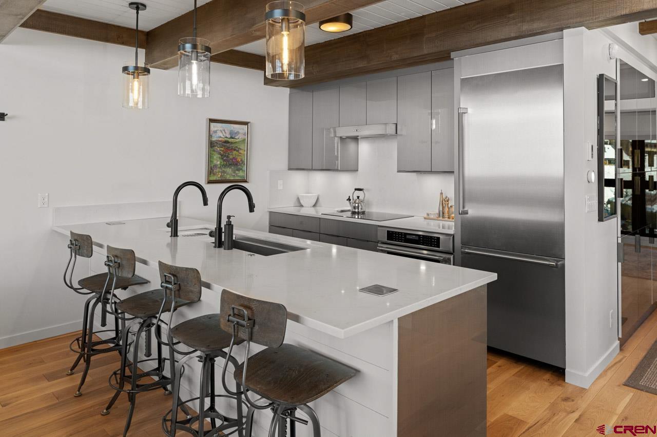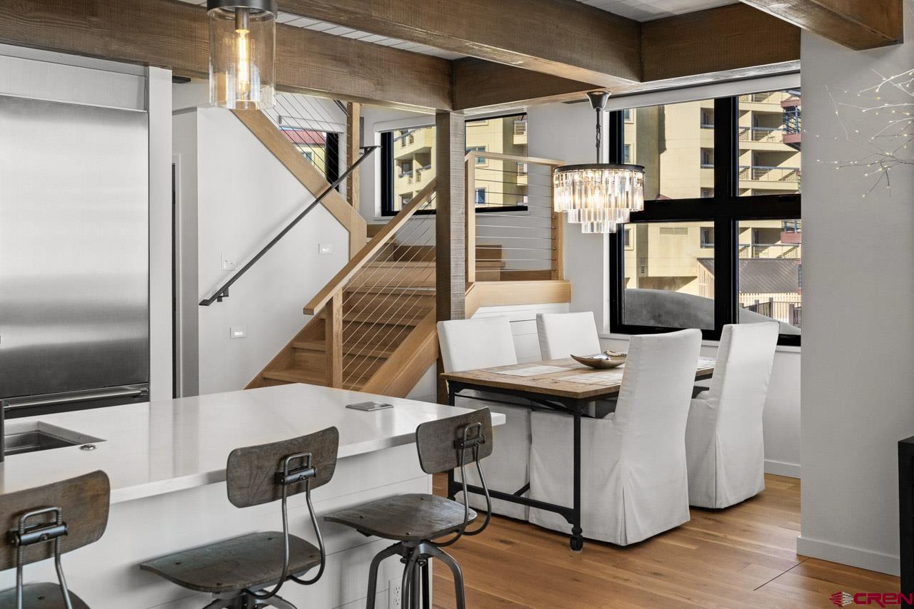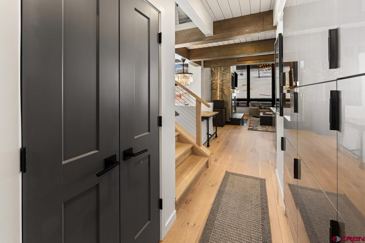 Wow! What an incredible spot on the ski slopes! This offering is a one-of-a-kind mountain retreat featuring an incomparable ski in-ski out location next to Crested Butte's main high speed quad lift: The Silver Queen. Renovated from the studs and completed in 2019, the home now features a raised second floor level creating 18-foot ceilings in the great room. During construction, structural and exposed oak beams were added along with the whitewashed tongue-and-grove wood ceilings, in-floor heating, new plumbing and electrical systems, new energy efficient windows and top of the line motorized Lutron blinds and Hunter Douglas Silhouttes. The interior enjoys Restoration Hardware furnishings and lighting, a Camino Vintage Candelabra 2-tier chandelier and a custom wood-burning fireplace with a white quartz mantle on a black granite hearth. The dining area seats six and is adorned with a spectacular 1920s 3-Tier Odeon Crystal Fringe chandelier. The kitchen footprint and cabinetry is complimented by stunning UltraLux contemporary high-gloss cabinets, under-cabinet lighting, Thermador stainless appliances, and white quartz stone countertops with an island bar with seating for four. The modern staircase sports a custom iron and oak banister with cable railing and wide plank white oak steps and risers. There are two well appointed primary bedrooms with beautiful ensuite baths. The lofted space currently functions as a second living area. Outside, the spacious Trex deck features a hot tub, a storage closet and a dramatic view of the skiing and the peak like no other.