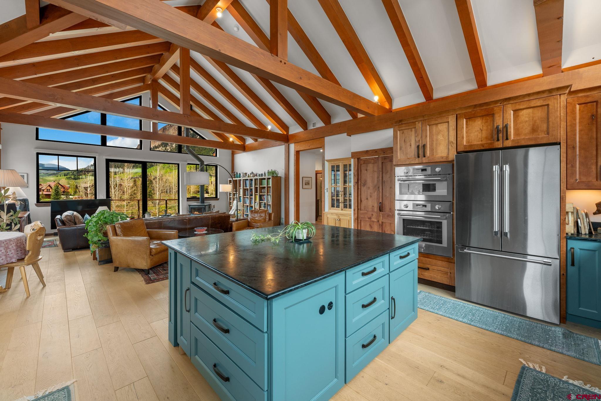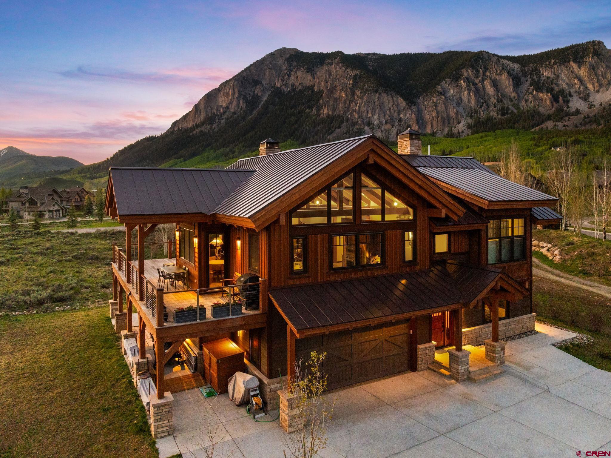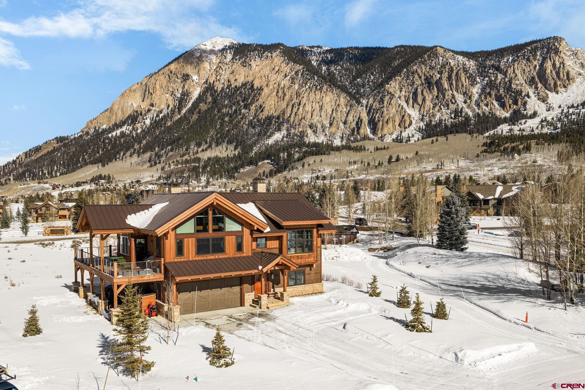 227 Larkspur Loop represents the pinnacle of refined mountain living in Crested Butte. Thoughtfully designed and recently completed, this custom home blends elegant timber frame craftsmanship with exceptional functionality, all while maximizing its most remarkable feature, sweeping, unobstructed views of the surrounding mountains. Encompassing 3,175 square feet, the home offers a versatile floor plan that caters beautifully to both everyday living and entertaining. Upon entry, you’re welcomed by a grand staircase leading to the main living area, with immediate access to a heated, oversized two-car garage and a flexible lower-level suite. Upstairs, the main living space impresses with soaring ceilings accented by custom timber frame beams, expansive windows framing the panoramic vistas, and a seamless open layout. The gourmet kitchen is a chef’s dream, featuring top-of-the-line appliances, custom cabinetry with soapstone counters, a 6-burner gas range, wall and convection ovens, two sinks for efficient prep and cleanup, a generous island with seating, walk-in pantry, and even a dumbwaiter delivering groceries directly from the garage. An elegant built-in dining area leads to a spacious deck which is perfect for al fresco meals overlooking the mountains. The living room is centered around a striking wood-burning fireplace, creating a warm and inviting space to gather and watch the sun set over the peaks. Just off the living room, the primary suite offers privacy and comfort, with breathtaking views of Whetstone Mountain, a luxurious en-suite bath with double vanity, bidet, heated towel rack, and a custom multi-jetted shower/tub combination. A thoughtfully designed closet offers custom built-in storage. A second upstairs bedroom, currently used as an office, and a full bath with a walk-in shower complete the main level. The lower level spans approximately 1,200 square feet and can serve as a private guest suite or a fully rentable apartment. It includes two bedrooms, two bathrooms, a full kitchen, charming built-in dining nook, and a large living area. A private patio provides another opportunity to enjoy the stunning surroundings, and a separate entrance ensures convenience for guests or rental occupants. Every detail of this home was crafted with quality and sustainability in mind. Built with custom Structural Timber Frame construction and Structural Insulated Panels (SIPs), the home boasts superior energy efficiency, airtightness, and thermal performance, up to 50% more efficient than traditional framing. The Warmboard radiant in-floor heating system offers rapid, even heat throughout, while Alpen Tyrol high-performance windows provide exceptional insulation, sound reduction, and aesthetic appeal. Located just five minutes from downtown Crested Butte and ten minutes from the ski resort, this home offers quick access to world-class hiking, biking, fishing, golf, and private lake recreation within the community.