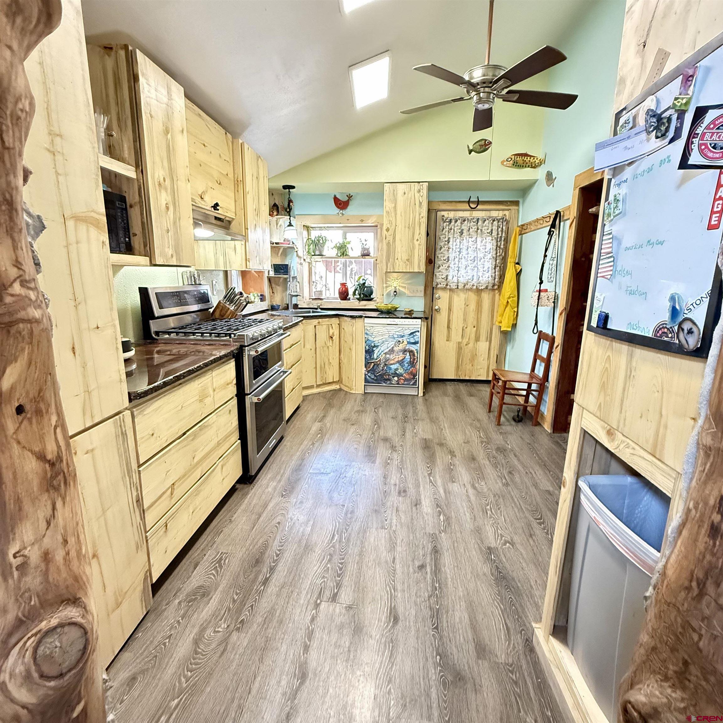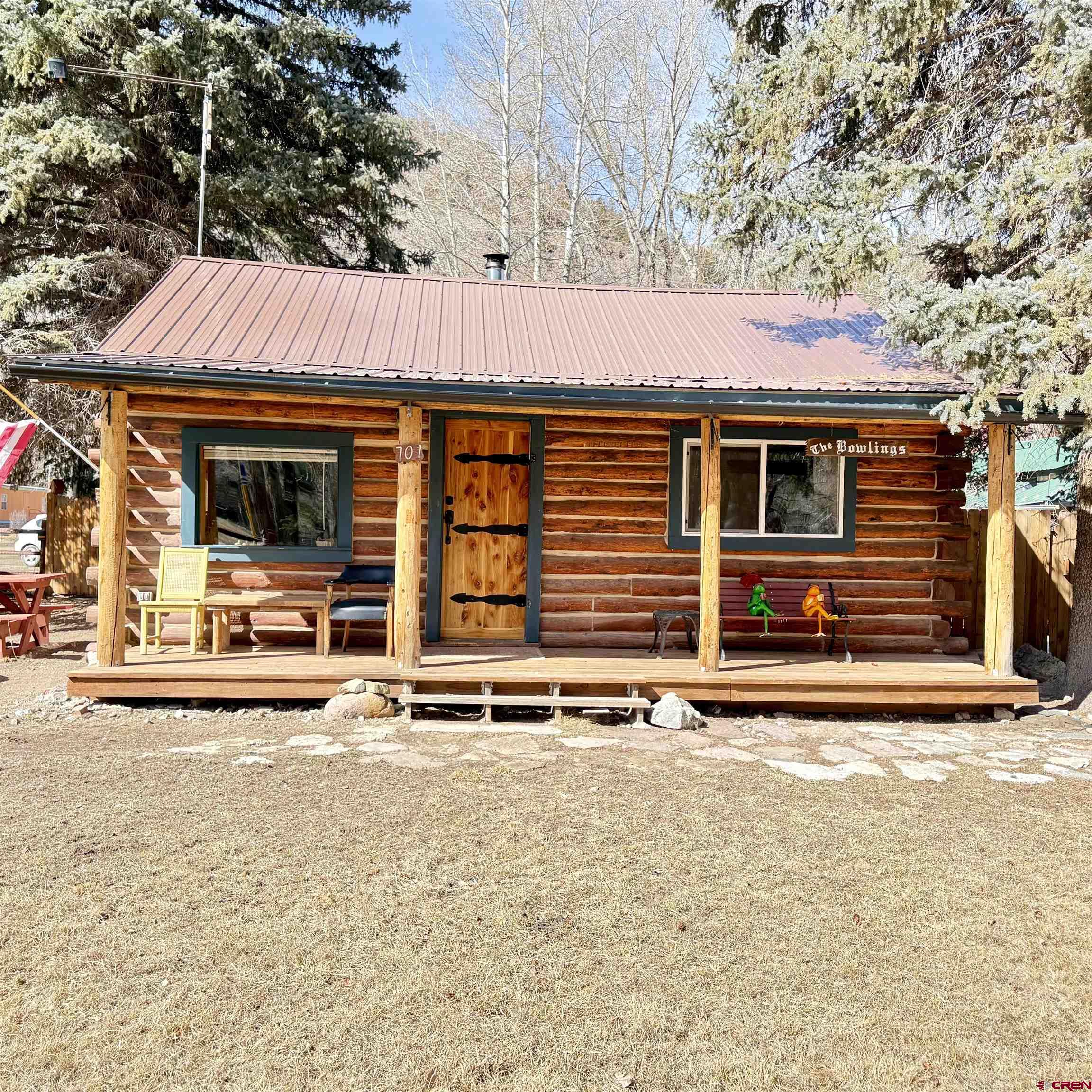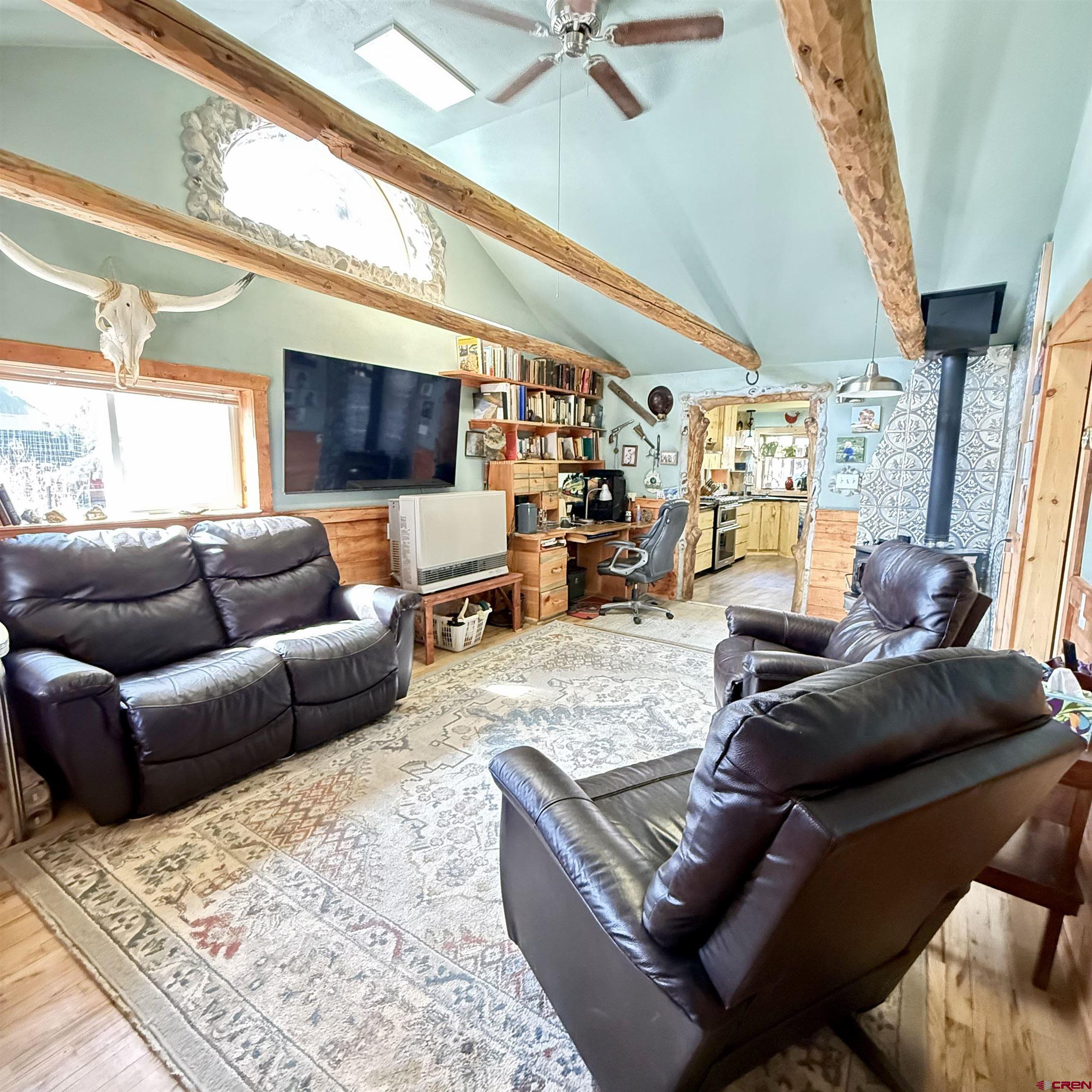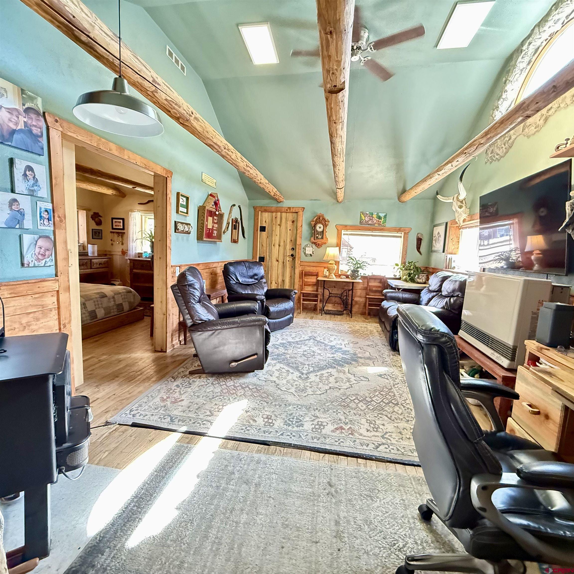 Charming mountain retreat in the heart of Lake City! This 1-bedroom, 1-bath home offers thoughtfully updated living space with character, warmth, and modern improvements throughout. Since purchasing, the owners have completed extensive upgrades including updated electrical and plumbing, new insulation, drywall installation, and replacement double-pane windows. The kitchen has been beautifully remodeled with newer appliances and handcrafted beetle-kill wood cabinetry, creating a true Colorado mountain feel. Flooring has been replaced and some kept to the original hard-wood floors, ceilings were opened up and vaulted for a more spacious design, a built-in desk was added, and barn doors bring added charm and functionality. The bedroom was redesigned to include a walk-in closet, and the bathroom has been fully renovated. Heating and ambiance are enhanced with both a cozy wood-burning stove and a Rinnai heater, offering efficient comfort year-round. A nice sized deck creates the perfect space to relax and enjoy the mountain setting. Situated on four city lots, this property provides rare in-town space to spread out, park an RV, and enjoy true mountain living. The fenced front and back yards make this property especially appealing for dog lovers, offering both security and room to roam. A ready-to-go chicken coop makes it easy to start your own hobby farm or embrace a more self-sufficient lifestyle. In addition to the main home, the property features a separate exterior cabin of over 700 square feet, ideal for guests, studio use, or flexible additional living space. There is also a spacious Detached Garage of over 700 square feet, offering ample room for storage, outdoor gear, ATVs, or workshop use. Just blocks from Lake City, restaurants, shops, hiking and Jeep trails, and access to the surrounding mountains, this property offers year-round adventure right outside your door. All square footage measurements are approximate; buyer to verify all measurements and property details.