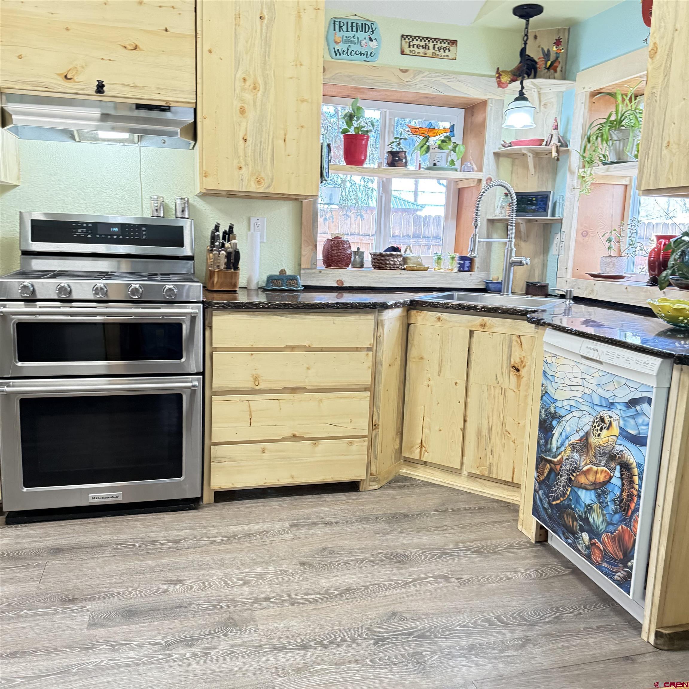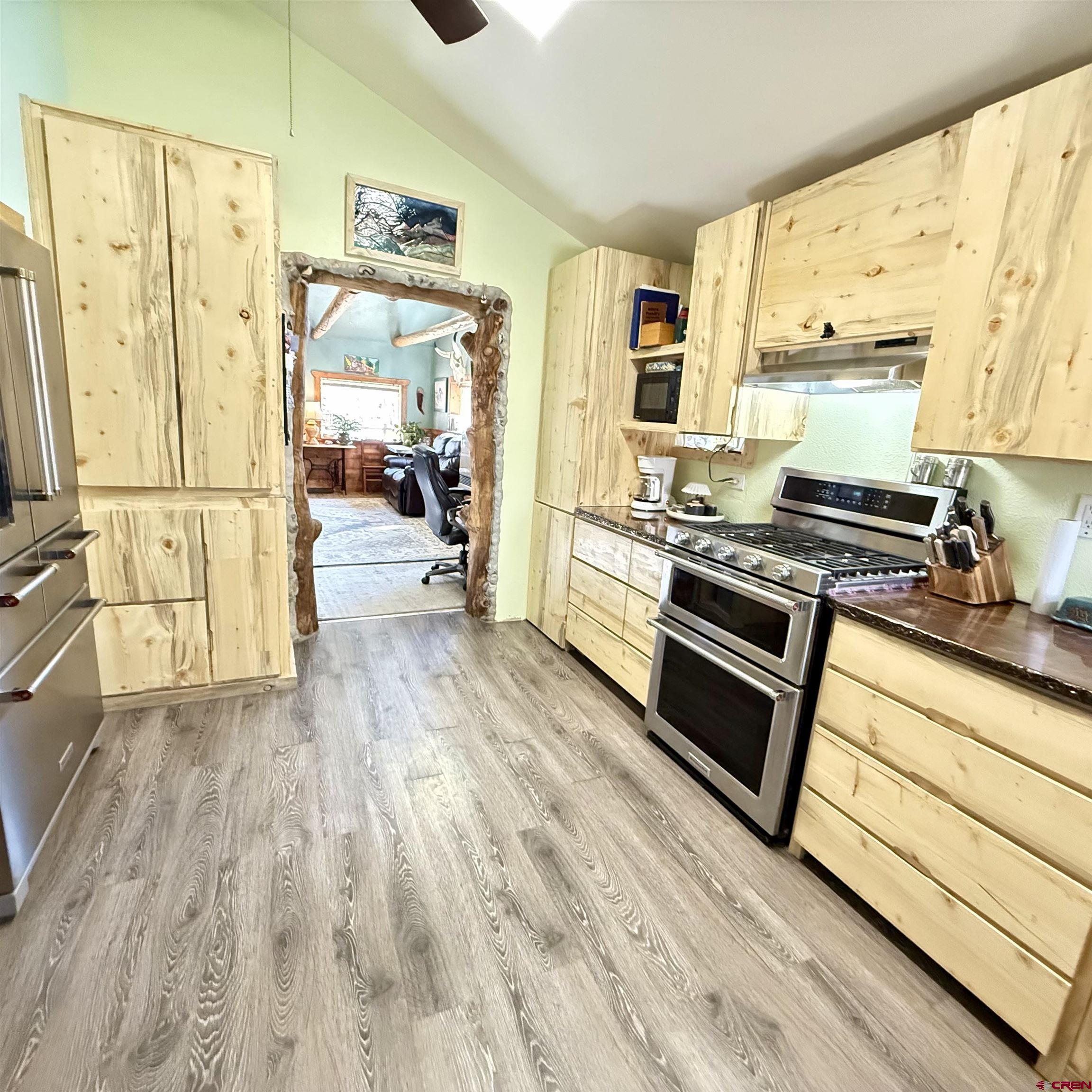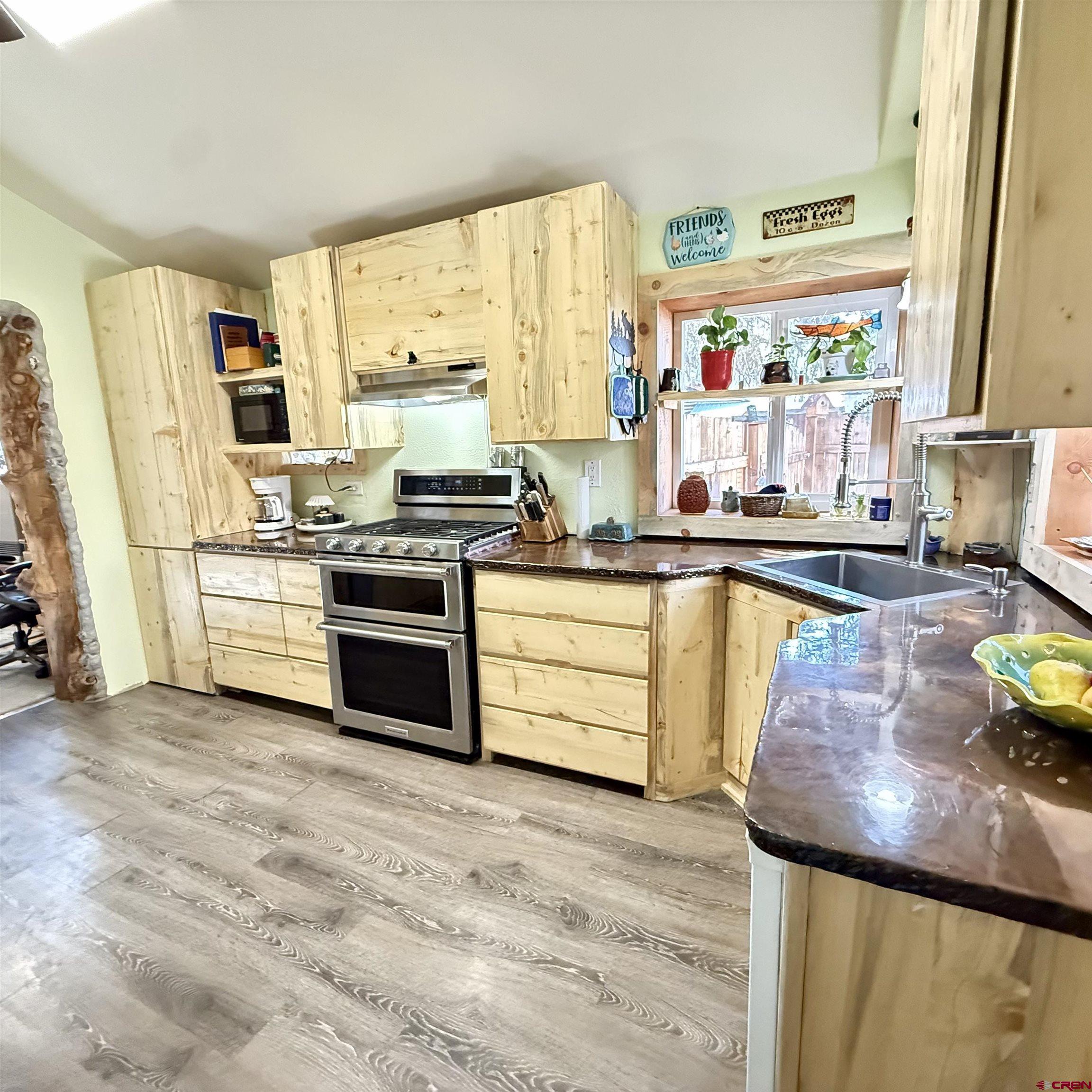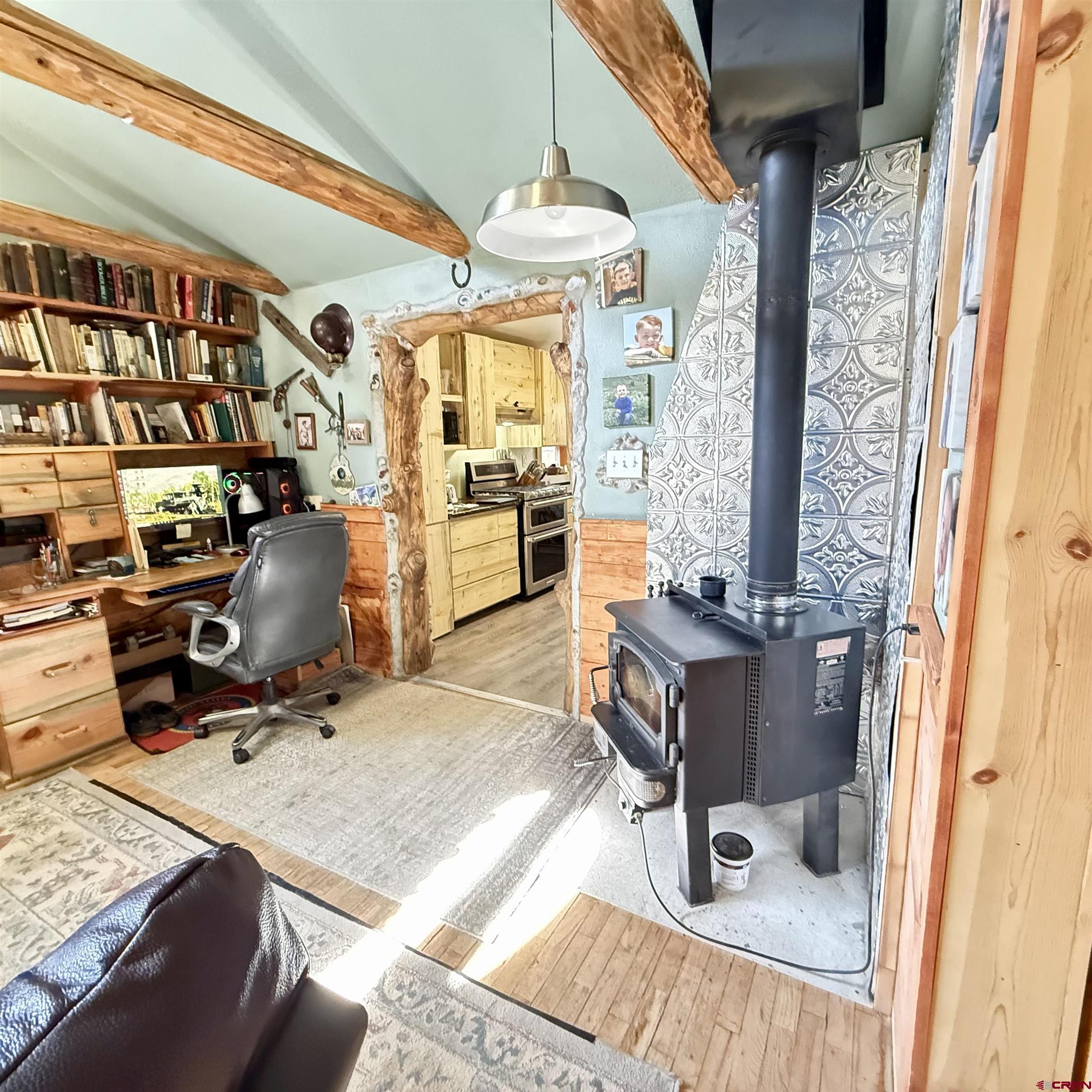 Charming mountain retreat in the heart of Lake City! This 1-bedroom, 1-bath home offers thoughtfully updated living space with character, warmth, and modern improvements throughout. Since purchasing, the owners have completed extensive upgrades including updated electrical and plumbing, new insulation, drywall installation, and replacement double-pane windows. The kitchen has been beautifully remodeled with newer appliances and handcrafted beetle-kill wood cabinetry, creating a true Colorado mountain feel. Flooring has been replaced and some kept to the original hard-wood floors, ceilings were opened up and vaulted for a more spacious design, a built-in desk was added, and barn doors bring added charm and functionality. The bedroom was redesigned to include a walk-in closet, and the bathroom has been fully renovated. Heating and ambiance are enhanced with both a cozy wood-burning stove and a Rinnai heater, offering efficient comfort year-round. A nice sized deck creates the perfect space to relax and enjoy the mountain setting. Situated on four city lots, this property provides rare in-town space to spread out, park an RV, and enjoy true mountain living. The fenced front and back yards make this property especially appealing for dog lovers, offering both security and room to roam. A ready-to-go chicken coop makes it easy to start your own hobby farm or embrace a more self-sufficient lifestyle. In addition to the main home, the property features a separate exterior cabin of over 700 square feet, ideal for guests, studio use, or flexible additional living space. There is also a spacious Detached Garage of over 700 square feet, offering ample room for storage, outdoor gear, ATVs, or workshop use. Just blocks from Lake City, restaurants, shops, hiking and Jeep trails, and access to the surrounding mountains, this property offers year-round adventure right outside your door. All square footage measurements are approximate; buyer to verify all measurements and property details.