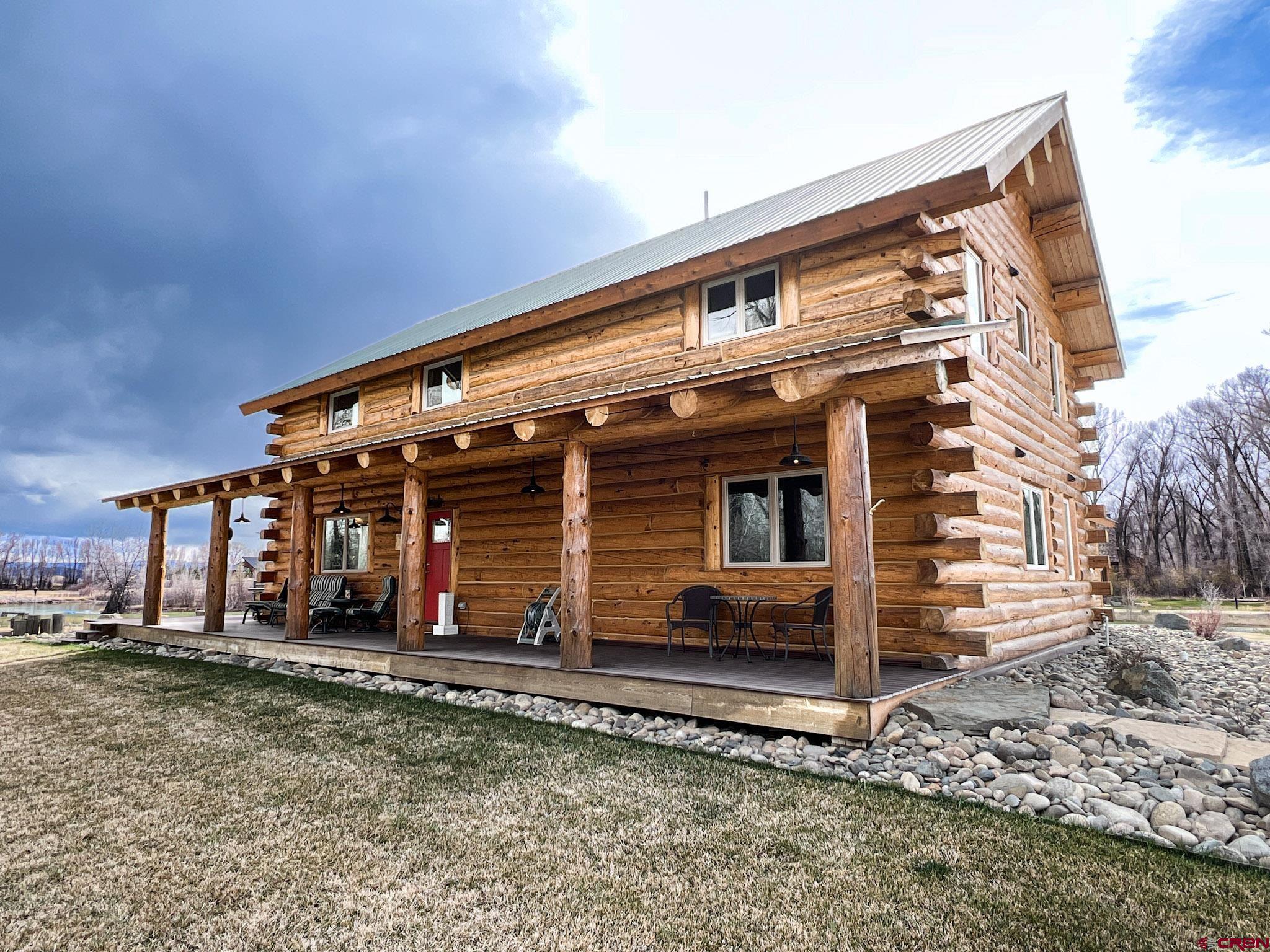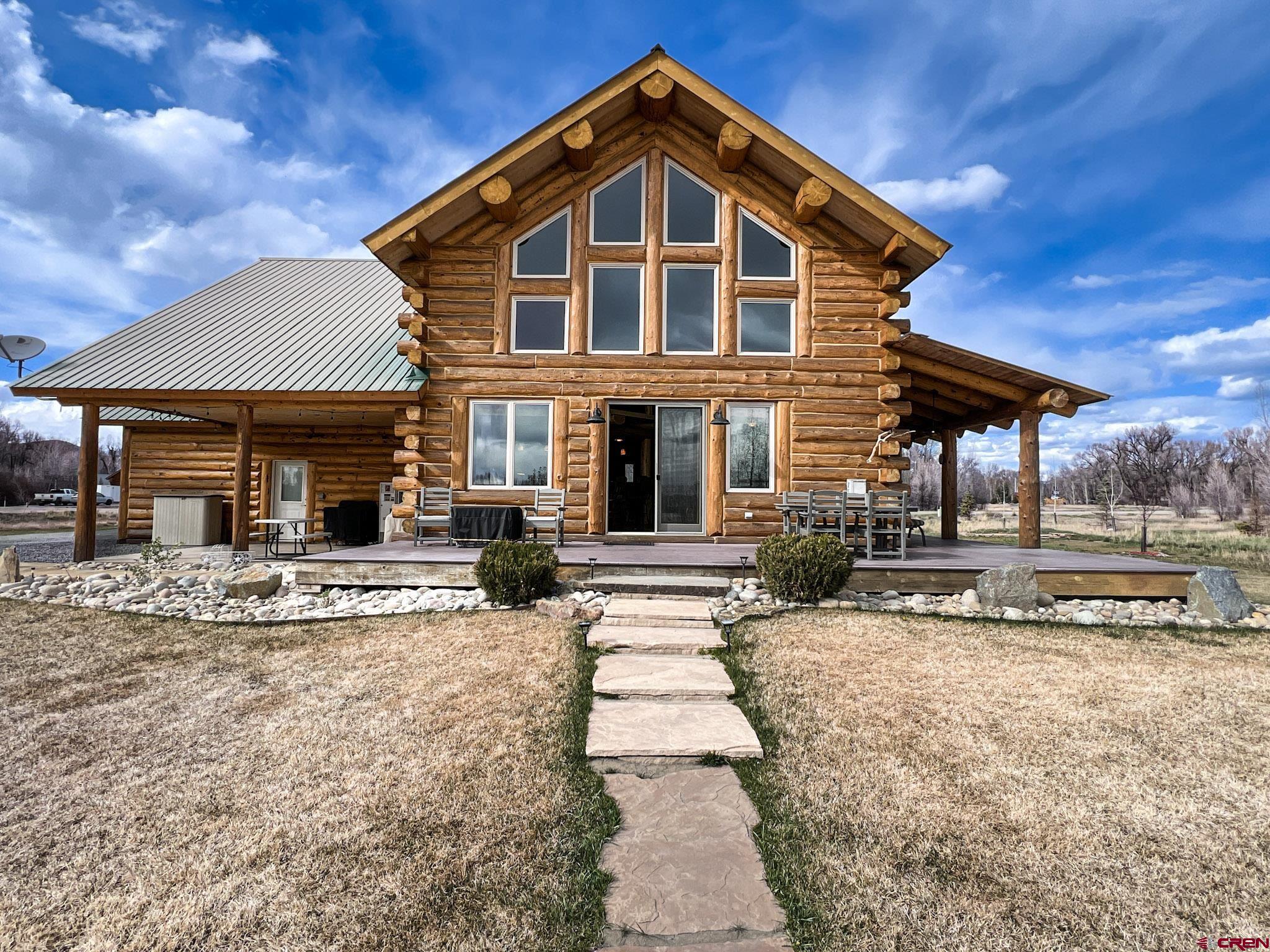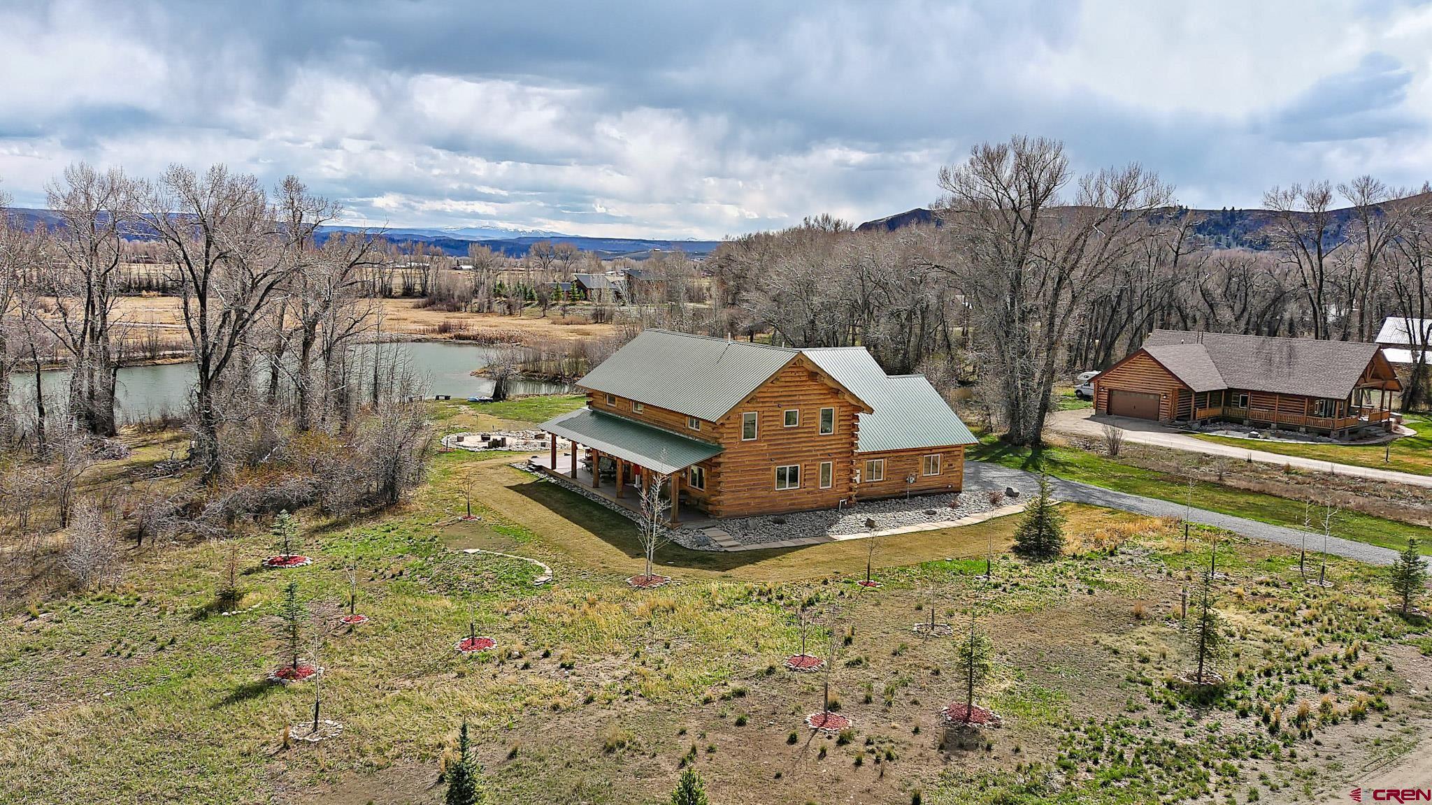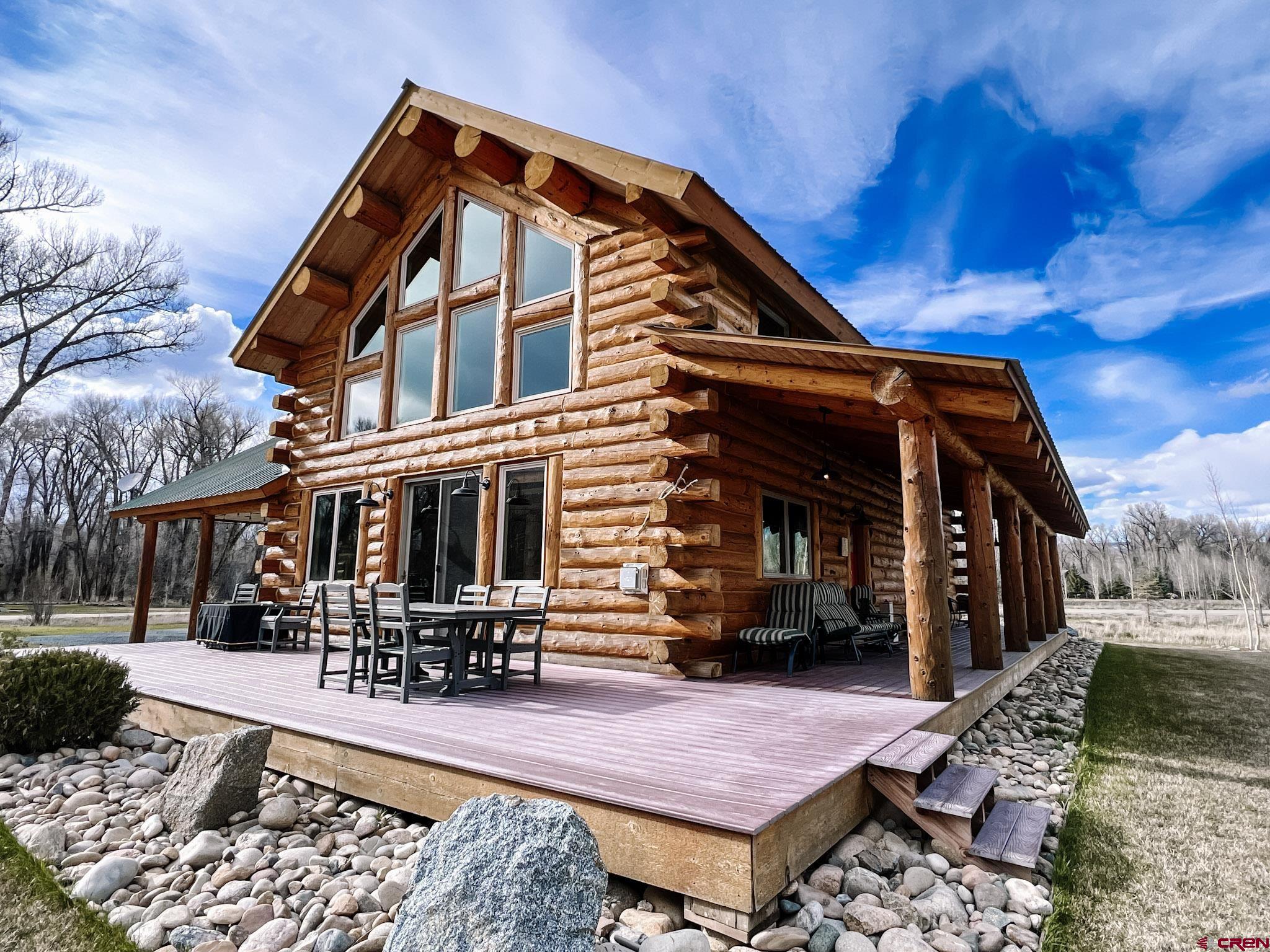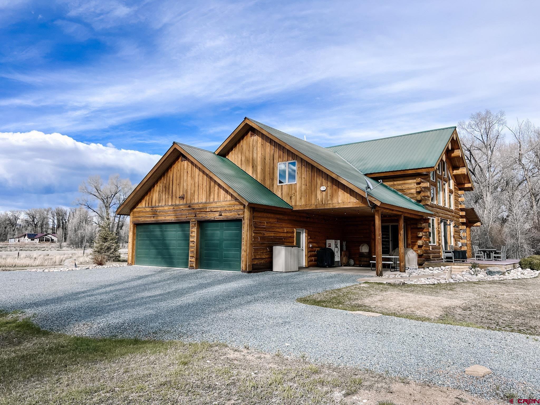 Welcome to this beautifully crafted Colorado log home in the desirable Riverwalk Estates community, set on approximately one acre and built with authentic D-logs sourced right here in Colorado. Offering a rare blend of craftsmanship, comfort and warmth with in-floor radiant heath throughout and south facing windows, and an enjoyable mountain lifestyle. This neighborhood provides access to private fishing ponds, private Gunnison River access, scenic hiking trails, and abundant wildlife including moose, elk, and deer. The open-concept main level features soaring vaulted ceilings, a stunning gas fireplace, and a spacious living area filled with natural light. The kitchen is designed for both function and gathering, complete with granite countertops, a gas range, and ample space for entertaining. The main-level primary suite offers convenience and privacy, featuring a double vanity, two walk-in closets, and a well-appointed three-quarter bathroom with a shower. A laundry room and additional half bath are also located on the main level, along with access to the attached 3-car garage totaling~ 919 Sq ft. Upstairs, you’ll find flexible living spaces including additional bedrooms and loft areas, along with a three-quarter bathroom with a shower. The home is configured as a four-bedroom property; however, one bedroom does not include a closet and is currently utilized as an office. Another bedroom is set up as a custom movie theater and features additional storage space accessed through the closet. Outdoor living is just as inviting with a large deck built from Track Decking and totaling ~854 Sq Ft , a covered patio with gas hookups totaling ~313 Sq Ft, and a flagstone sidewalk that leads to a gorgeous fire pit also created from flagstone —perfect for enjoying the peaceful surroundings. The landscaped yard features newly planted trees and plenty of space to take in the natural beauty of the area, along with a bordering pond and nearby HOA pond offering opportunities for paddleboarding and kayaking. As an added bonus, the property includes a small guest cabin for owner use, providing a comfortable space for visiting guests. Conveniently located just minutes from Gunnison and within walking distance to Garlic Mike’s, this home offers the perfect balance of privacy, recreation, and accessibility in one of the area’s most sought-after communities. Buyer to verify all square footage.